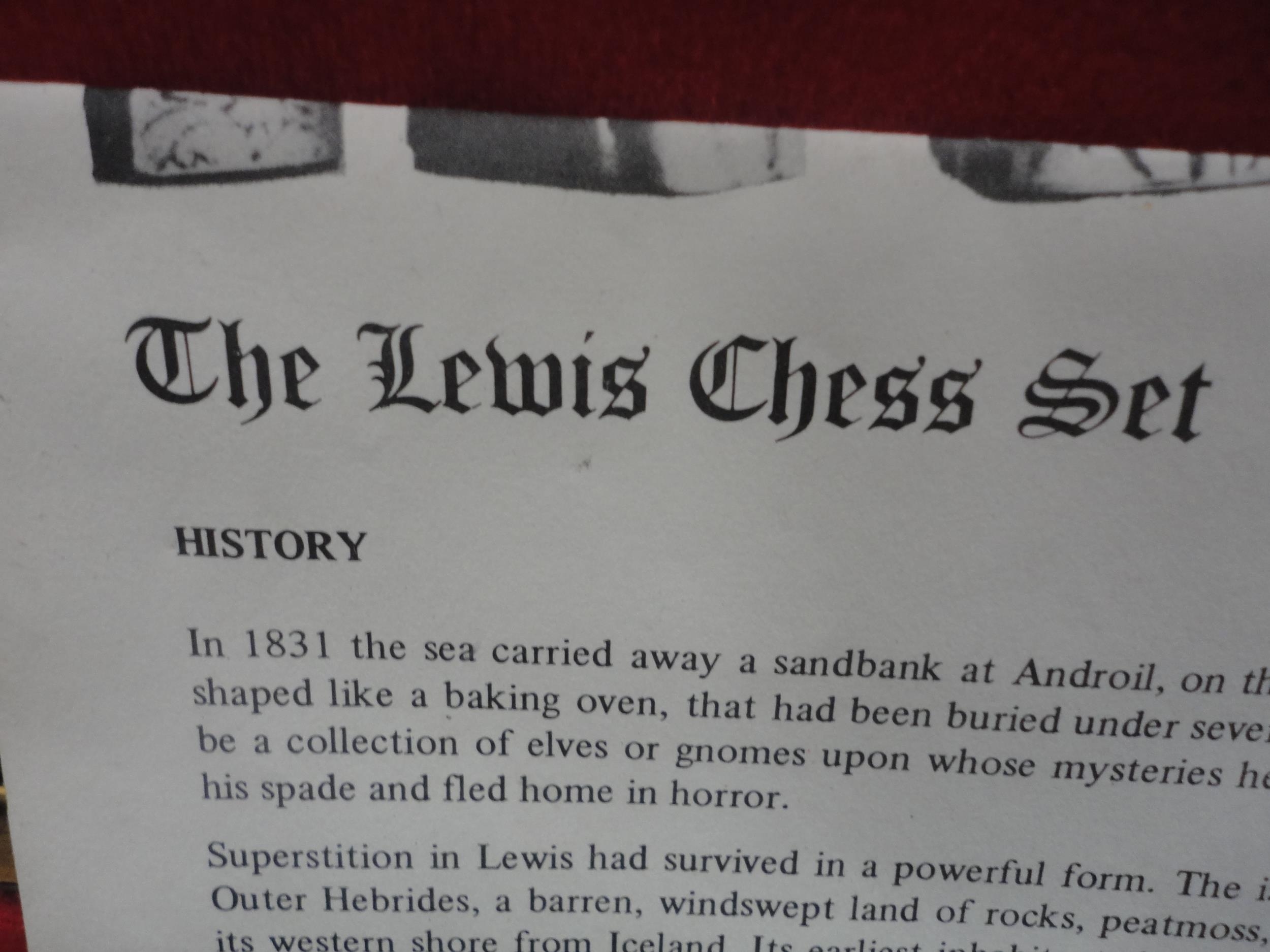 Modern composite chess set modelled after the Lewis chess set, contained within a carved wooden case.