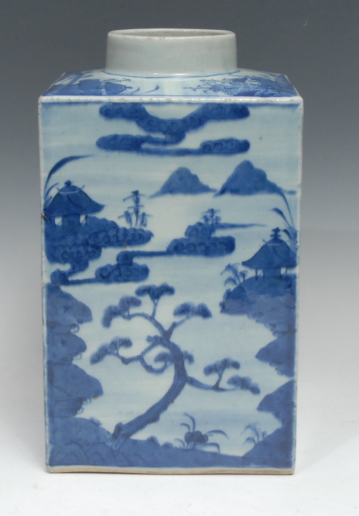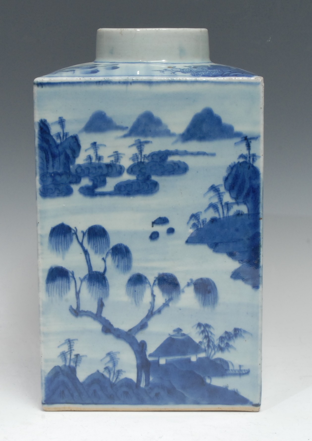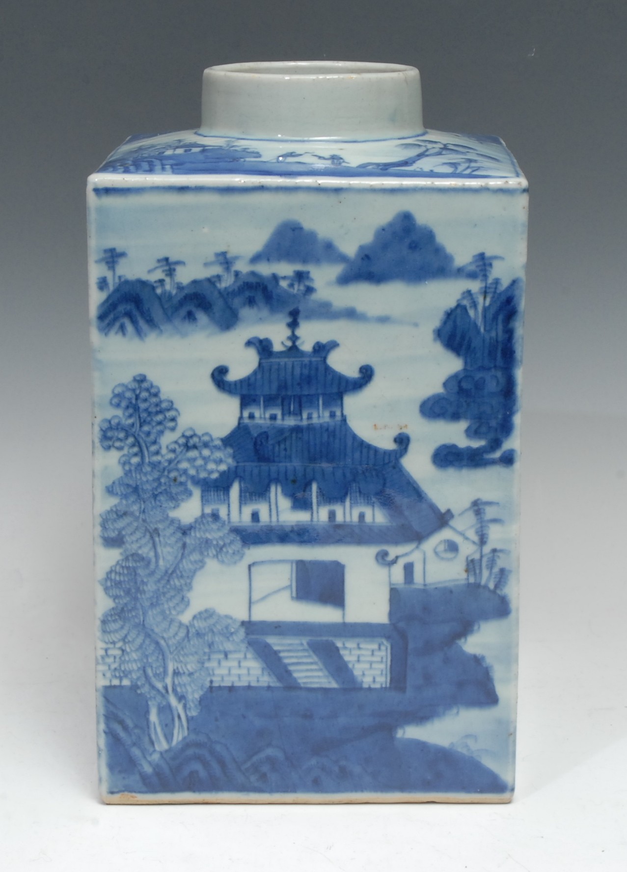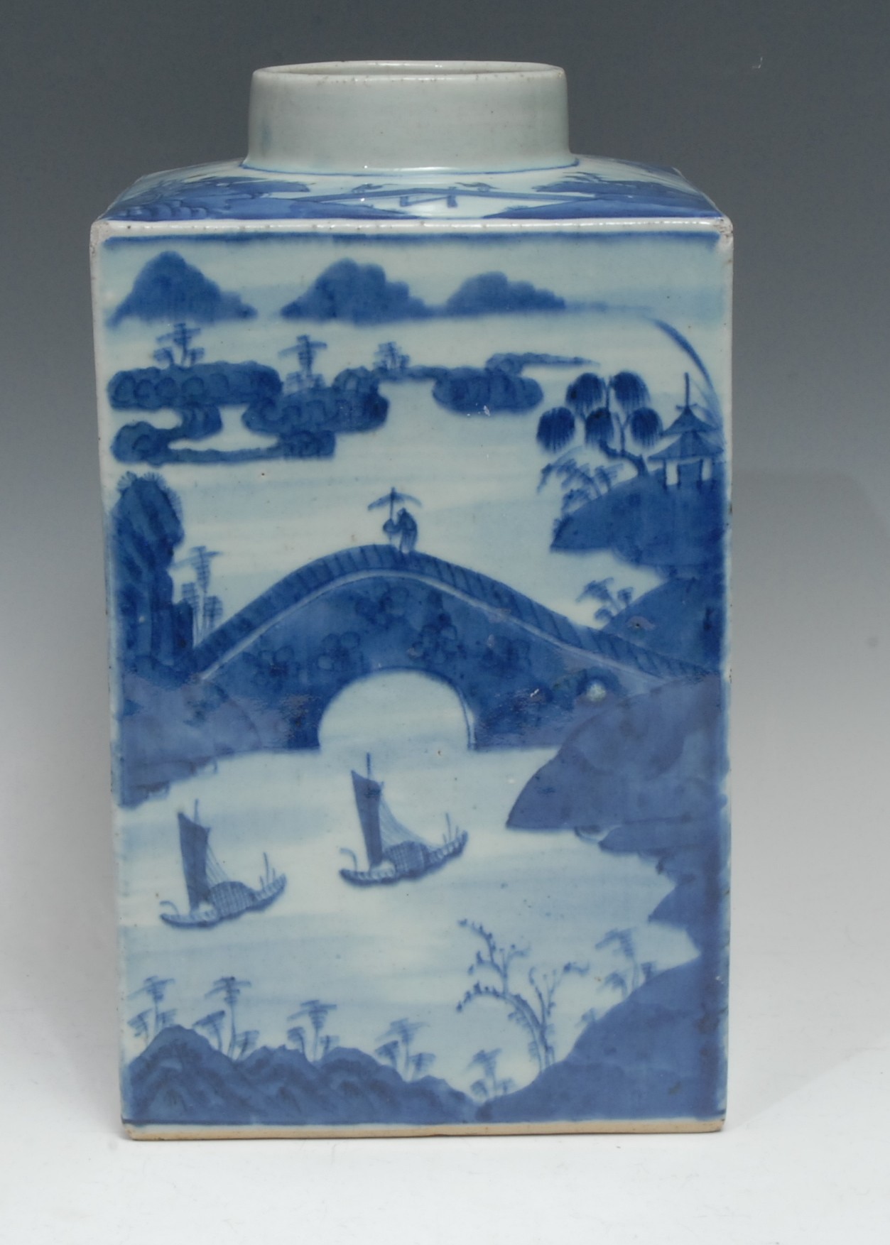 A Chinese square jar, painted in tones of underglaze blue with a pagoda and bridge in a monumental landscape, 29.5cm high, 19th century
