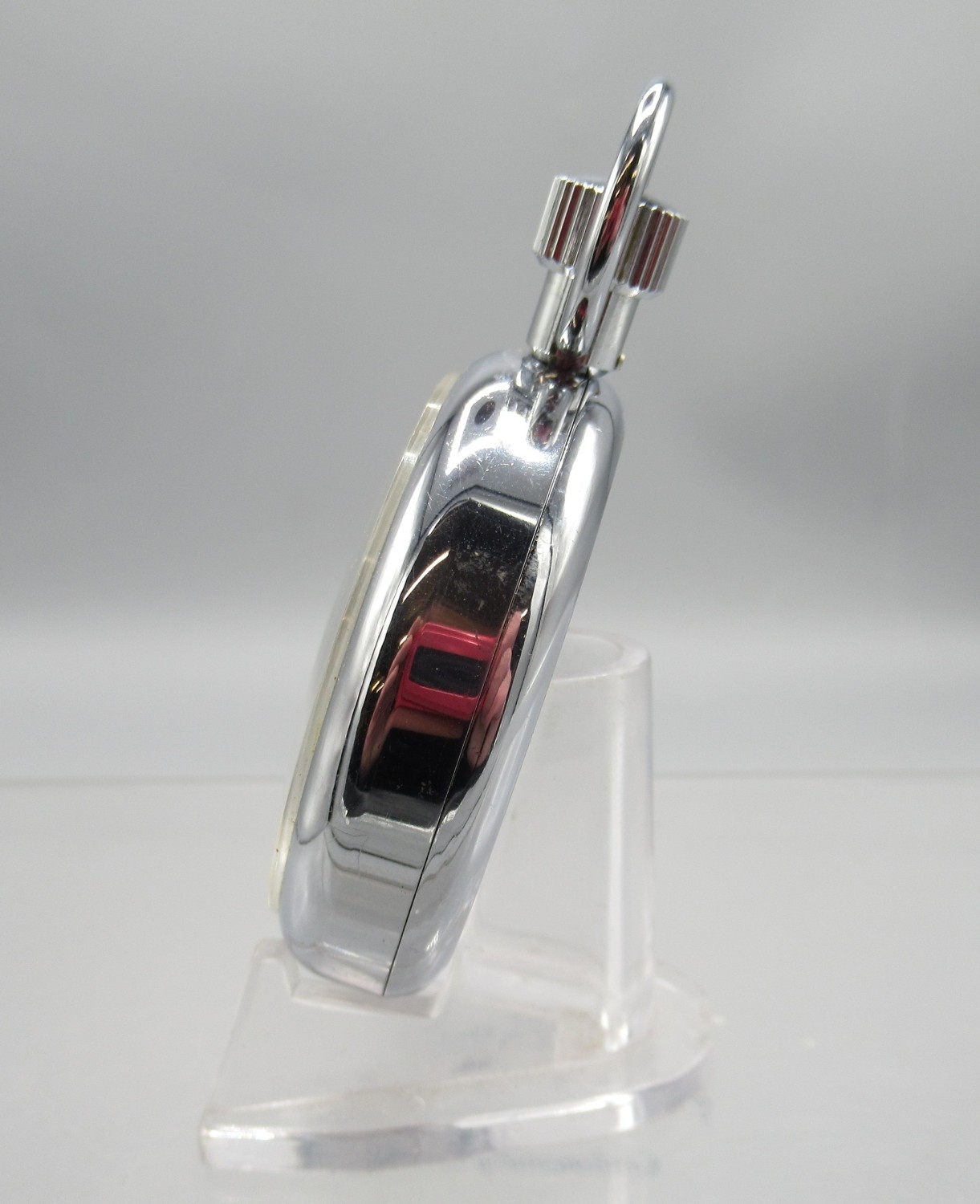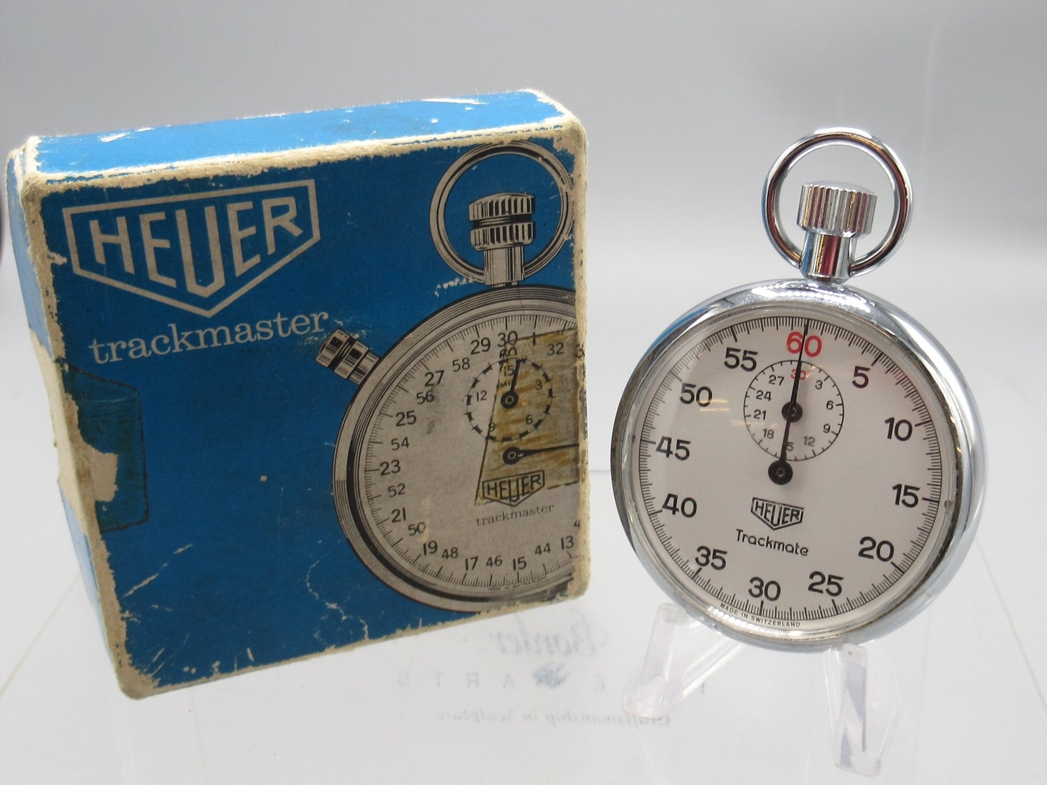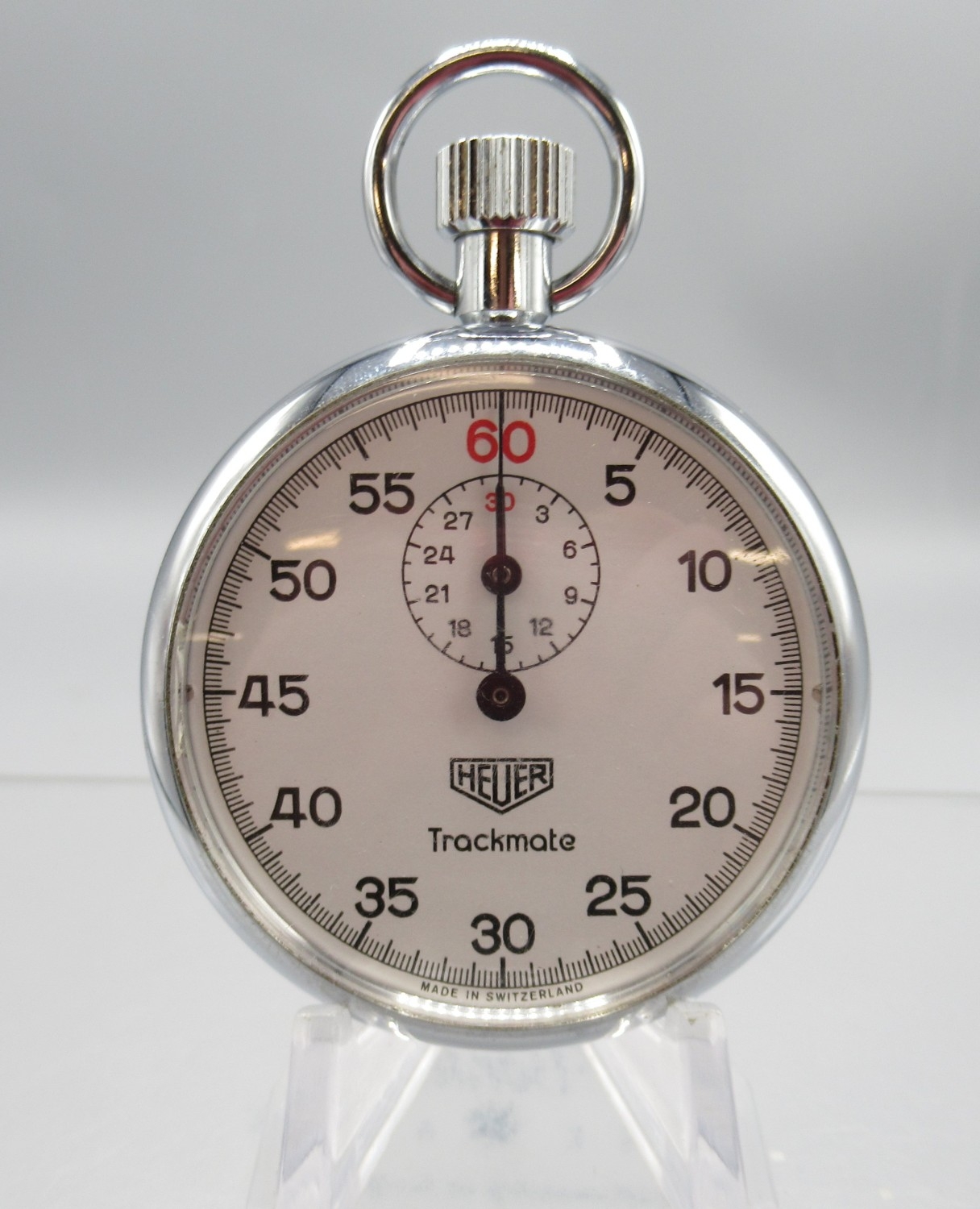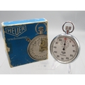Heuer Trackmate chrome stopwatch, signed white Arabic dial with 30 minute black subsidiary dial, snap on case back, HLSA Sportex 1 jewel unadjusted movement, D52mm with matched box