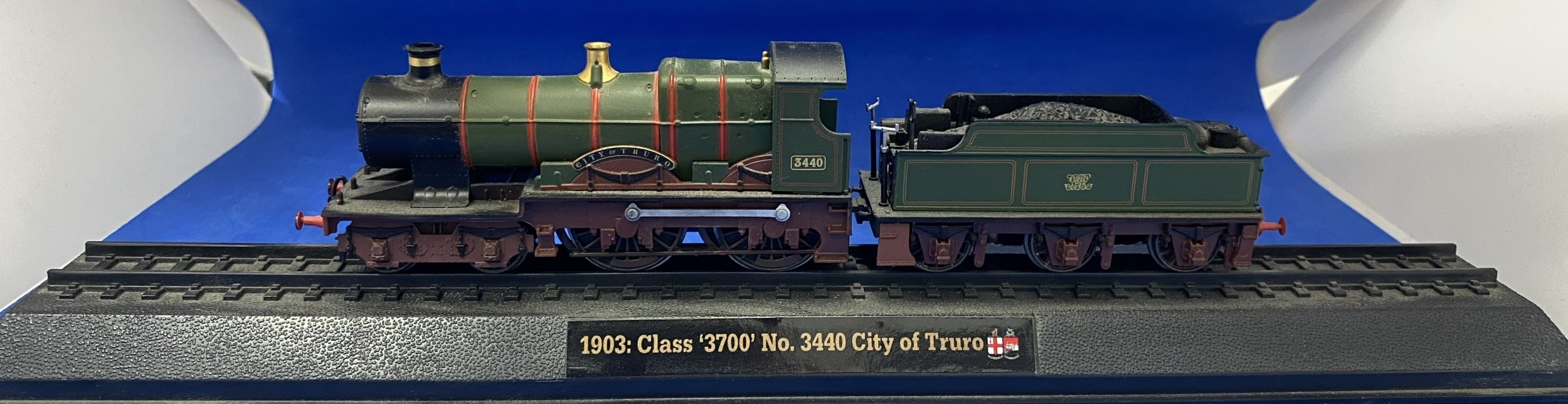 1903: Class '3700' No. 3440 City of Truro, train model on rail base.