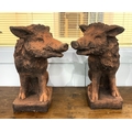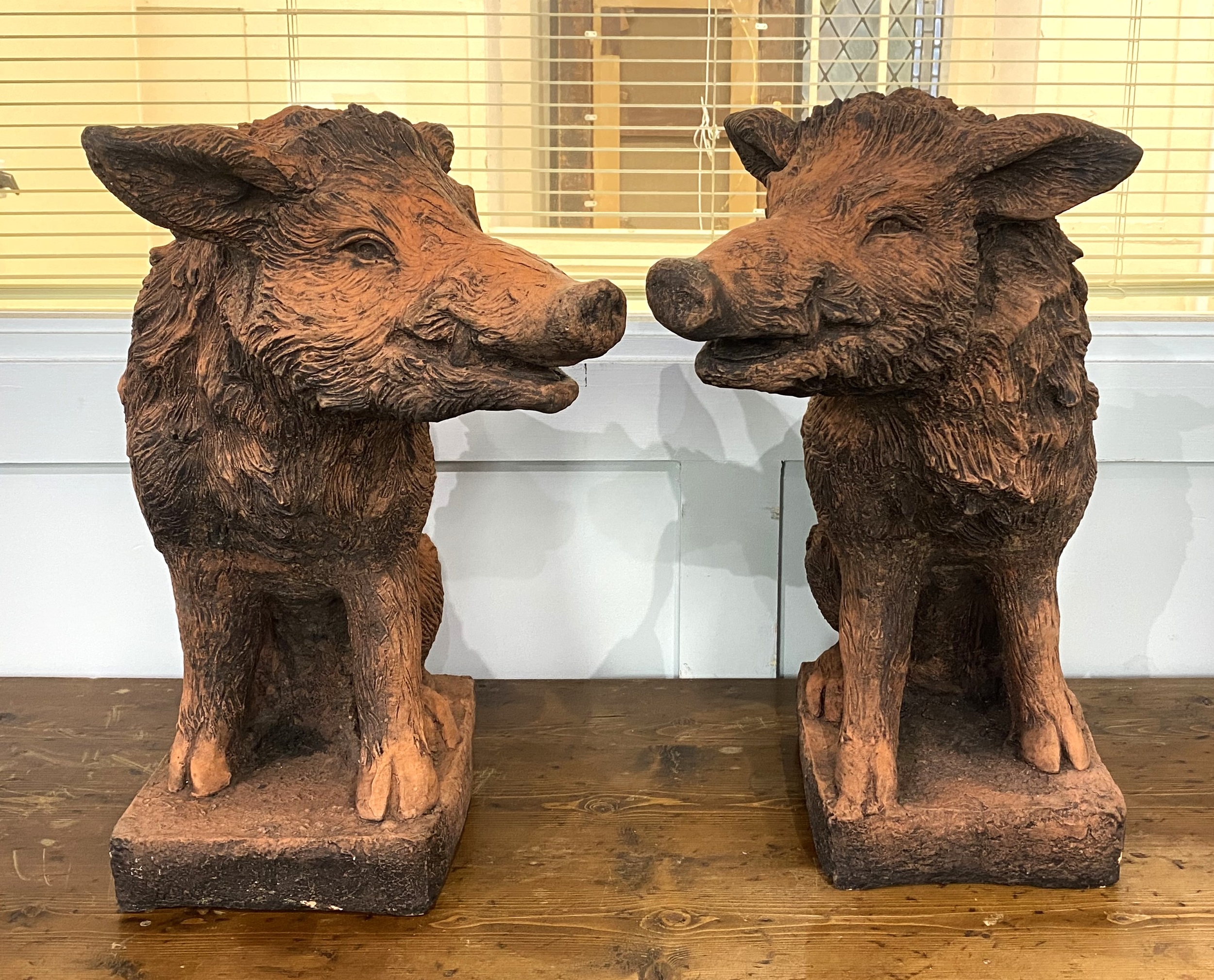 A pair of wild boar garden statues / gate post finials, constructed in frost proof terracotta coloured reconstituted stone, 55cm high.