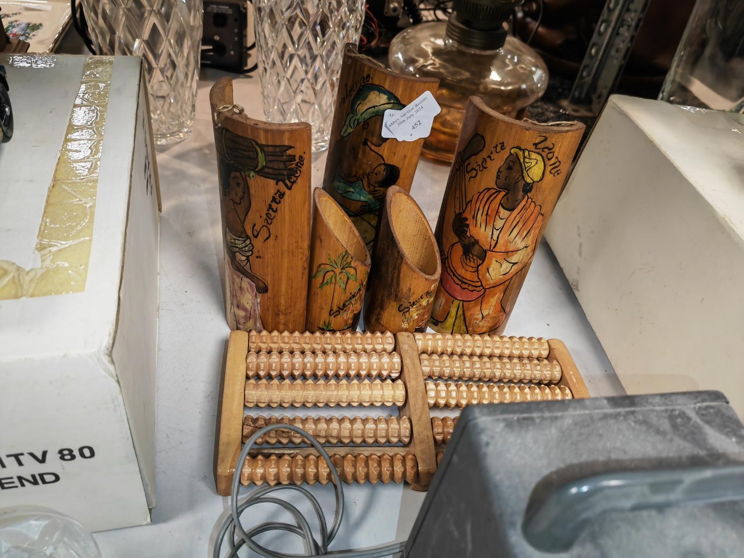 3 Curved Wooden African Pictures On Pots Plus A Back Massager