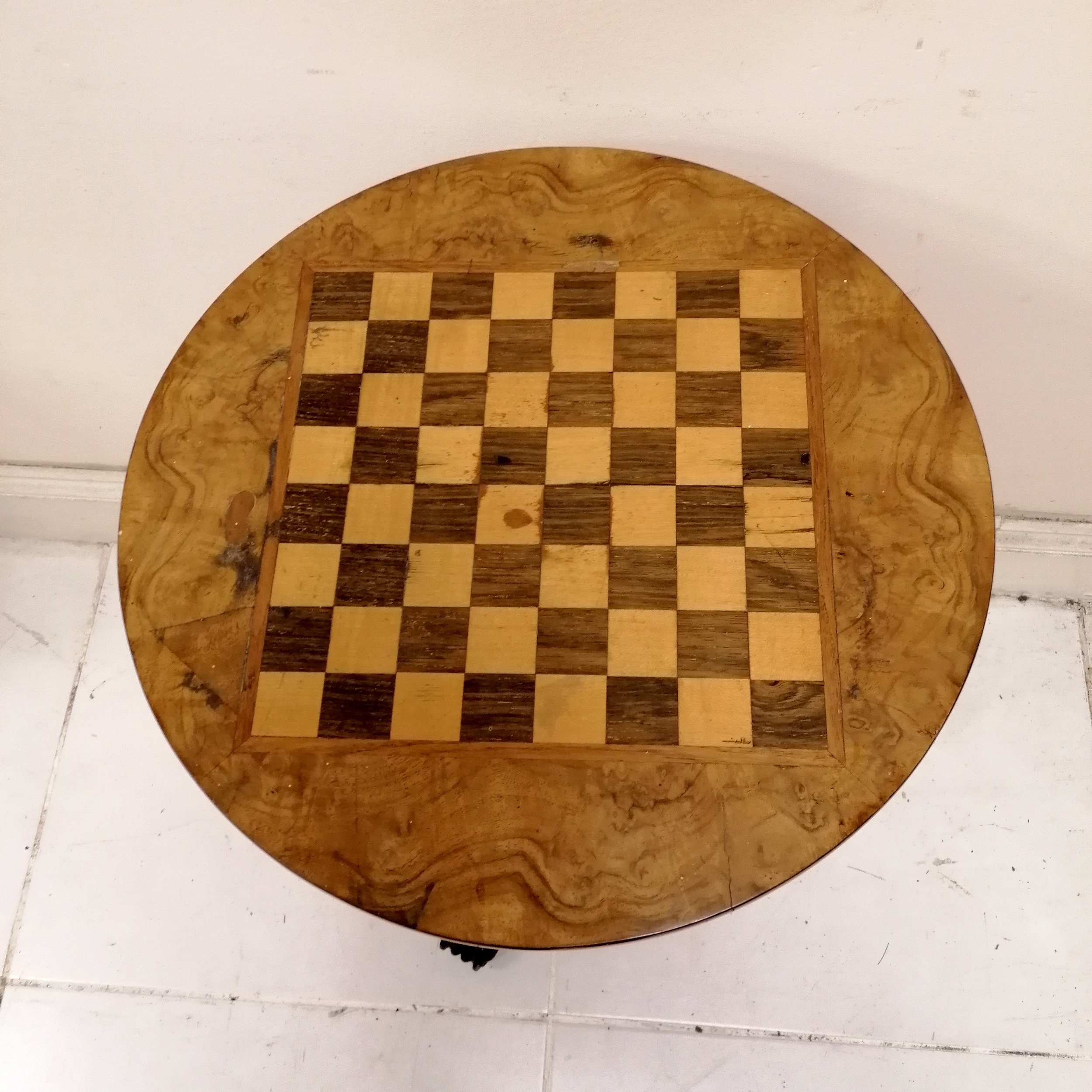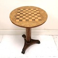 Antique circular topped games table on tripod base - 50cm diameter x 75cm high