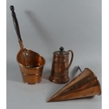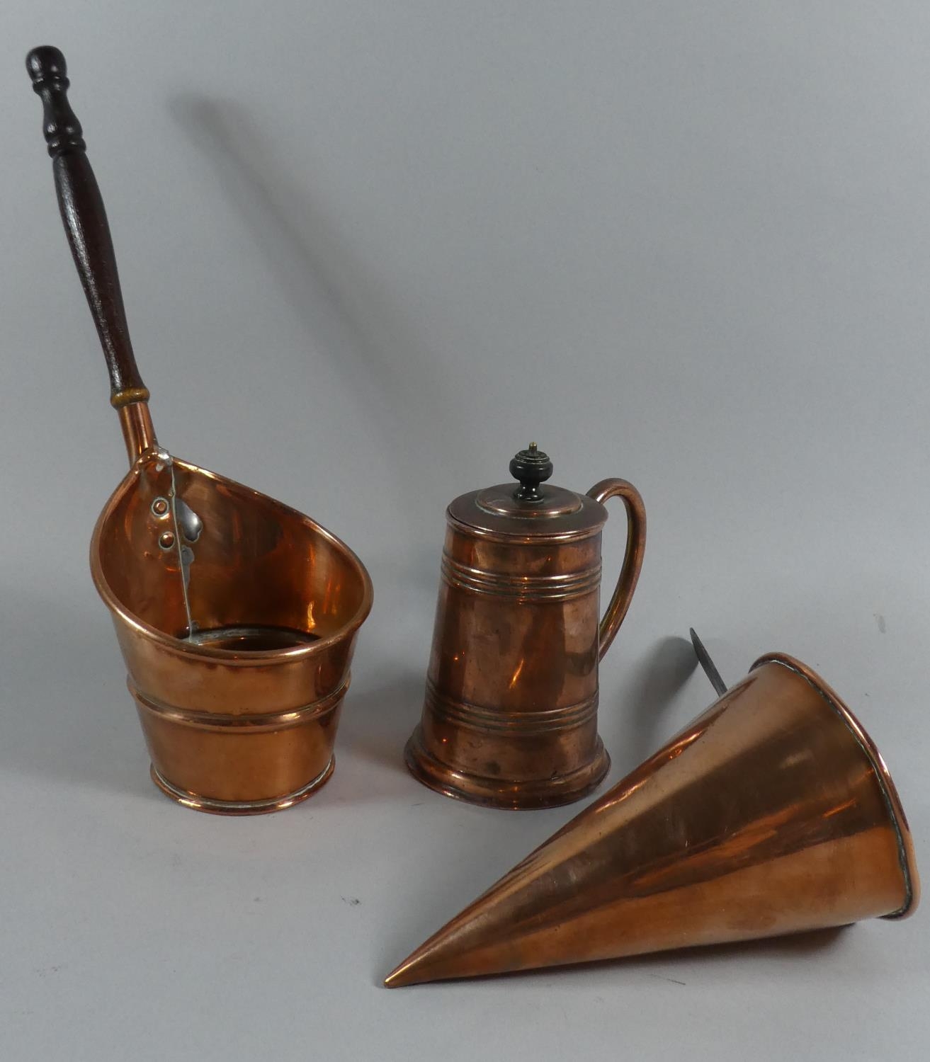 A 19th Century Copper Ale Warmer, a Wooden Handled Scoop and a Lidded Tankard