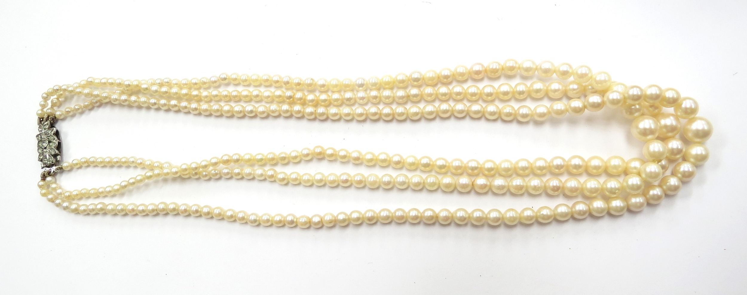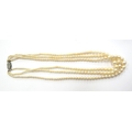 A three row graduated cultured pearl necklace, 42cm long, with silver clasp, cased