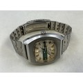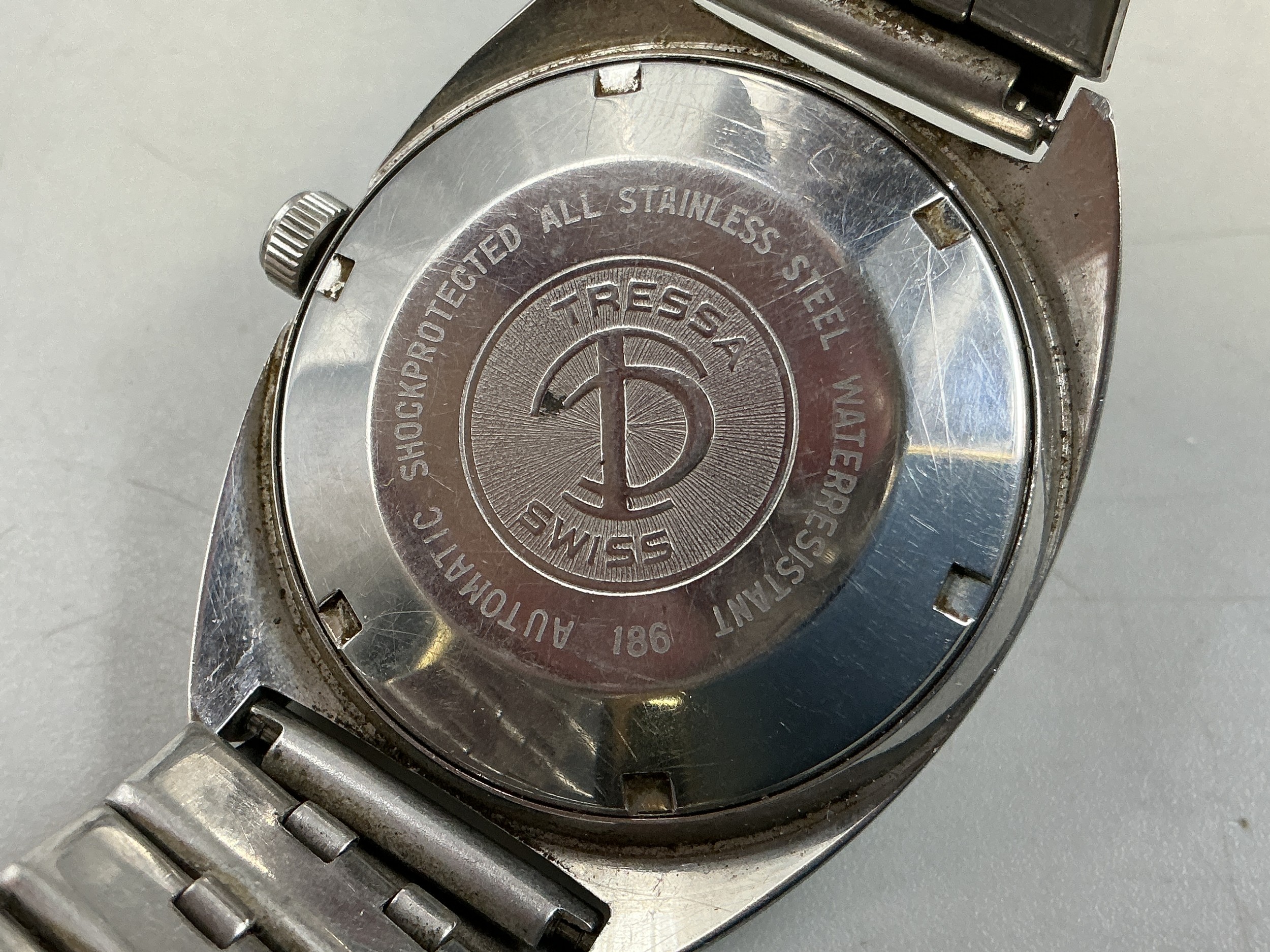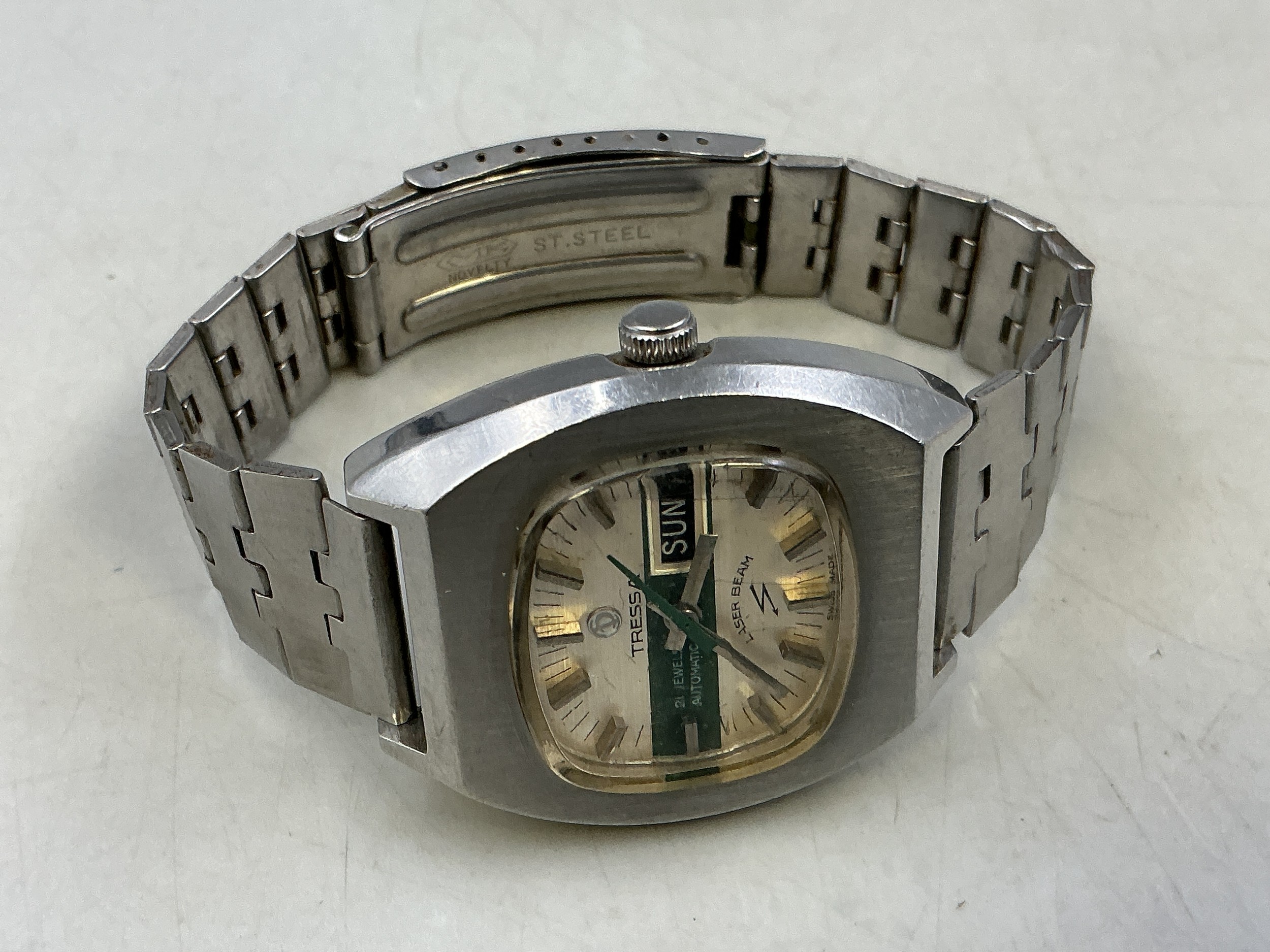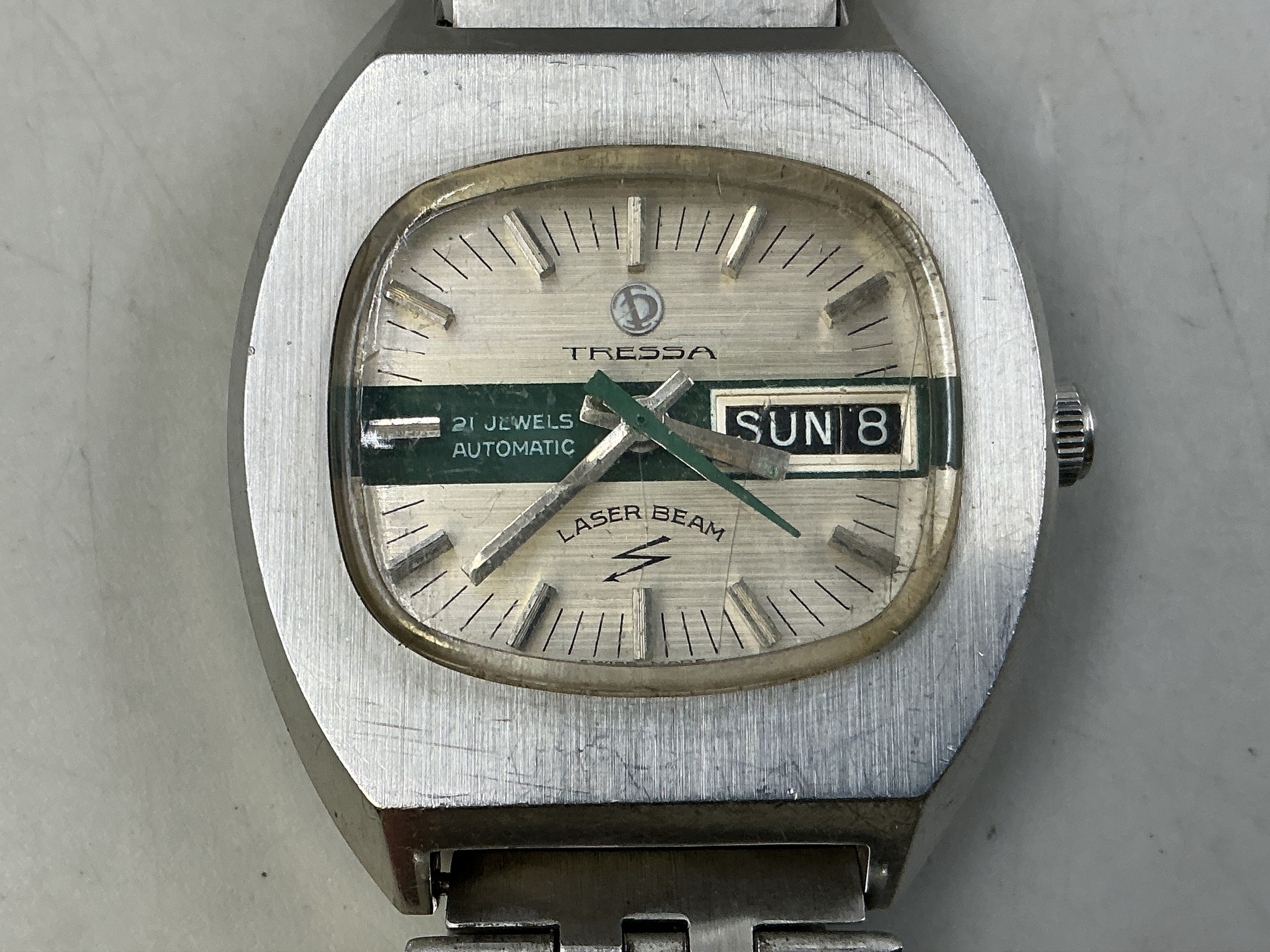 A Vintage Gents Tressa Lazer Beam 21 Jewels Automatic Day/Date Watch - Green Striped TV Dial, Stainless Steel Case and Strap. Working