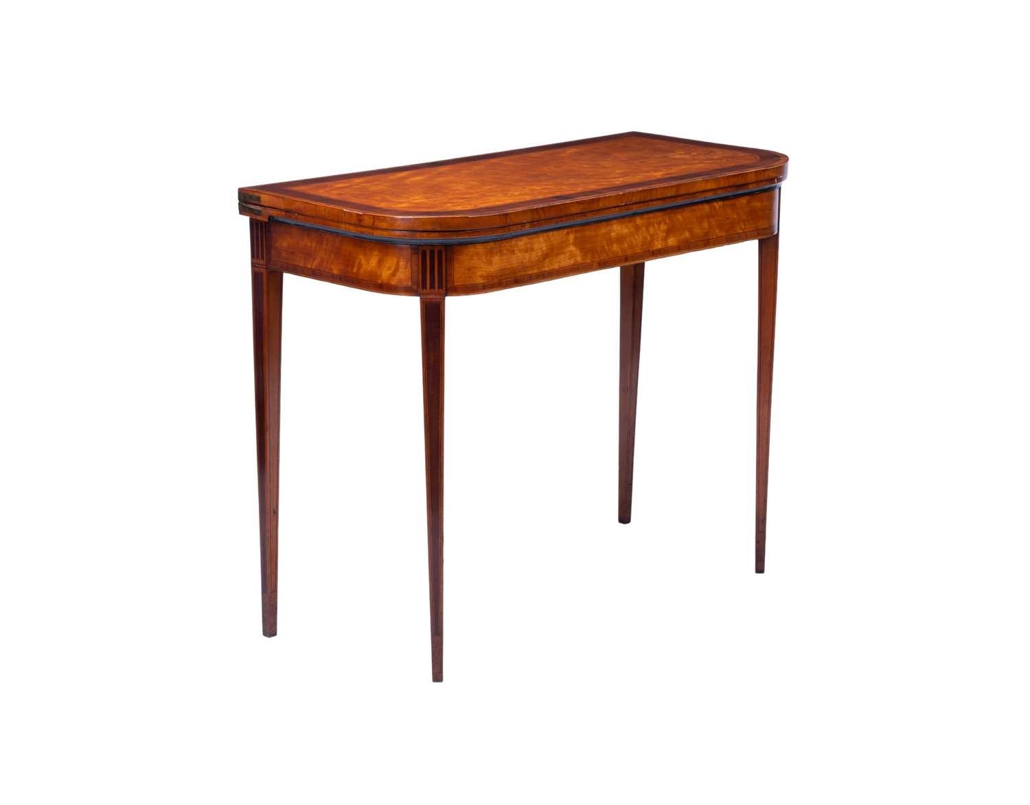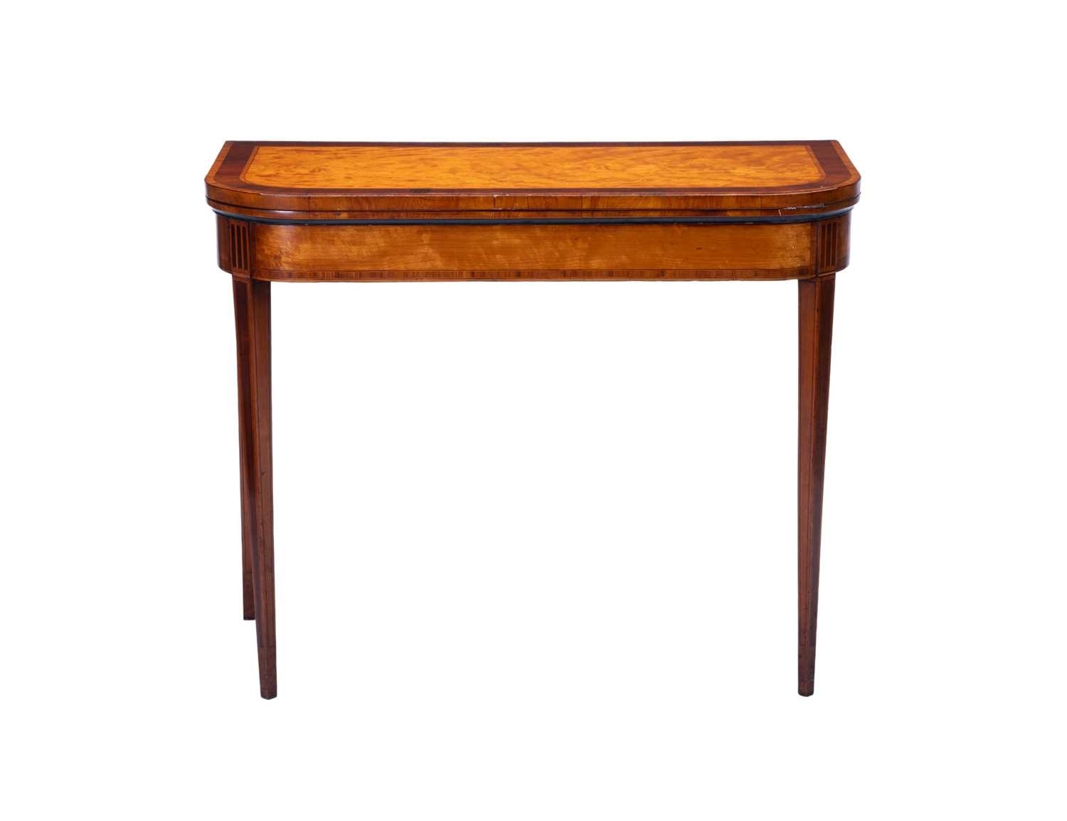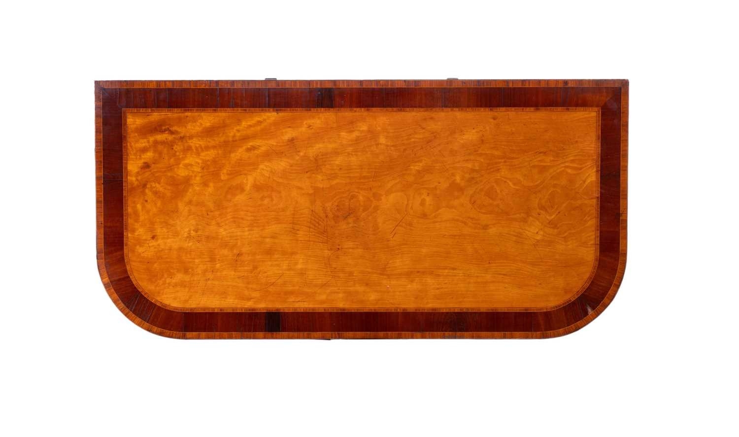A George III satinwood and rosewood banded D-shaped card table, on square tapering legs, 75 cm high x 92 cm wide.