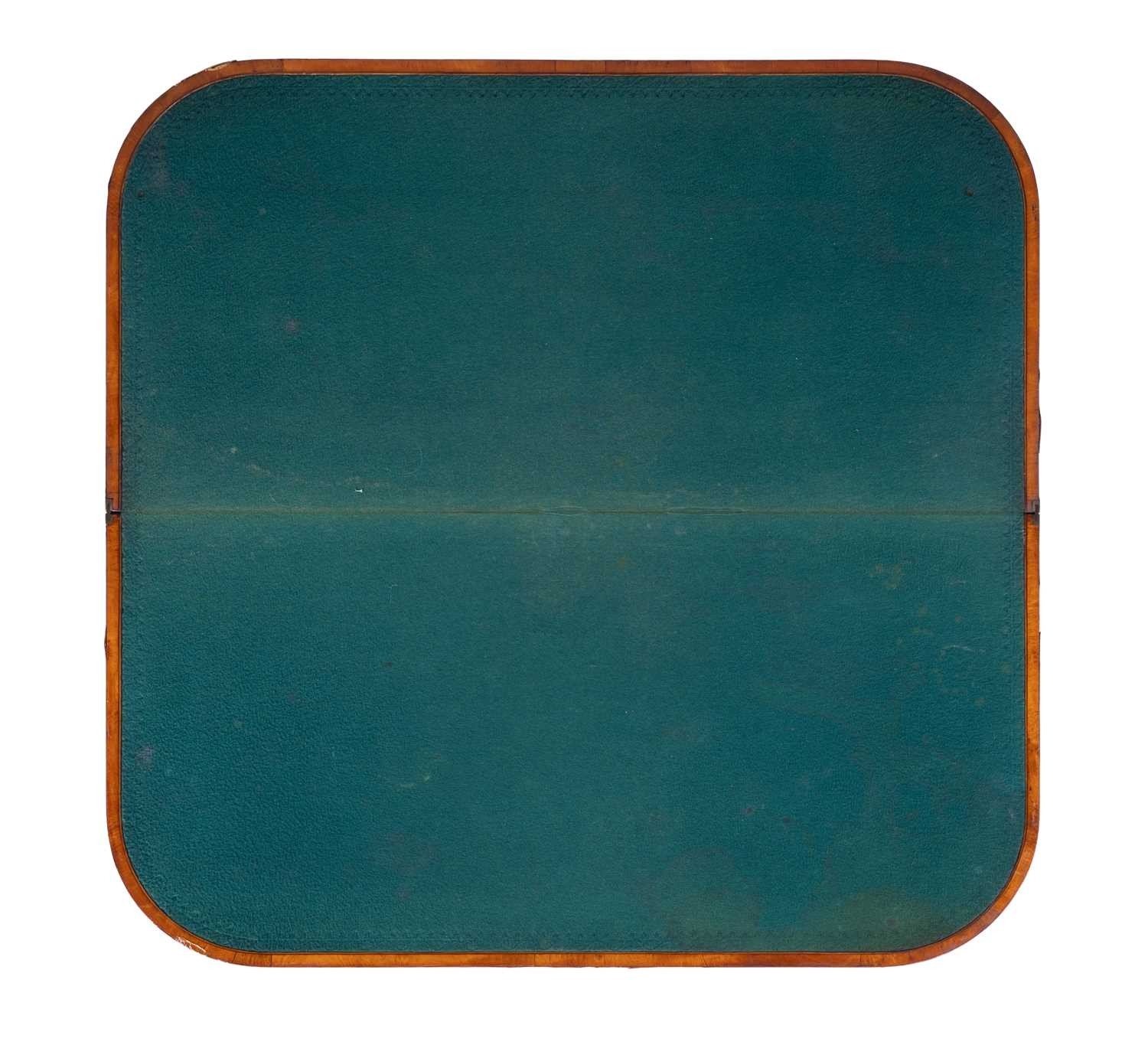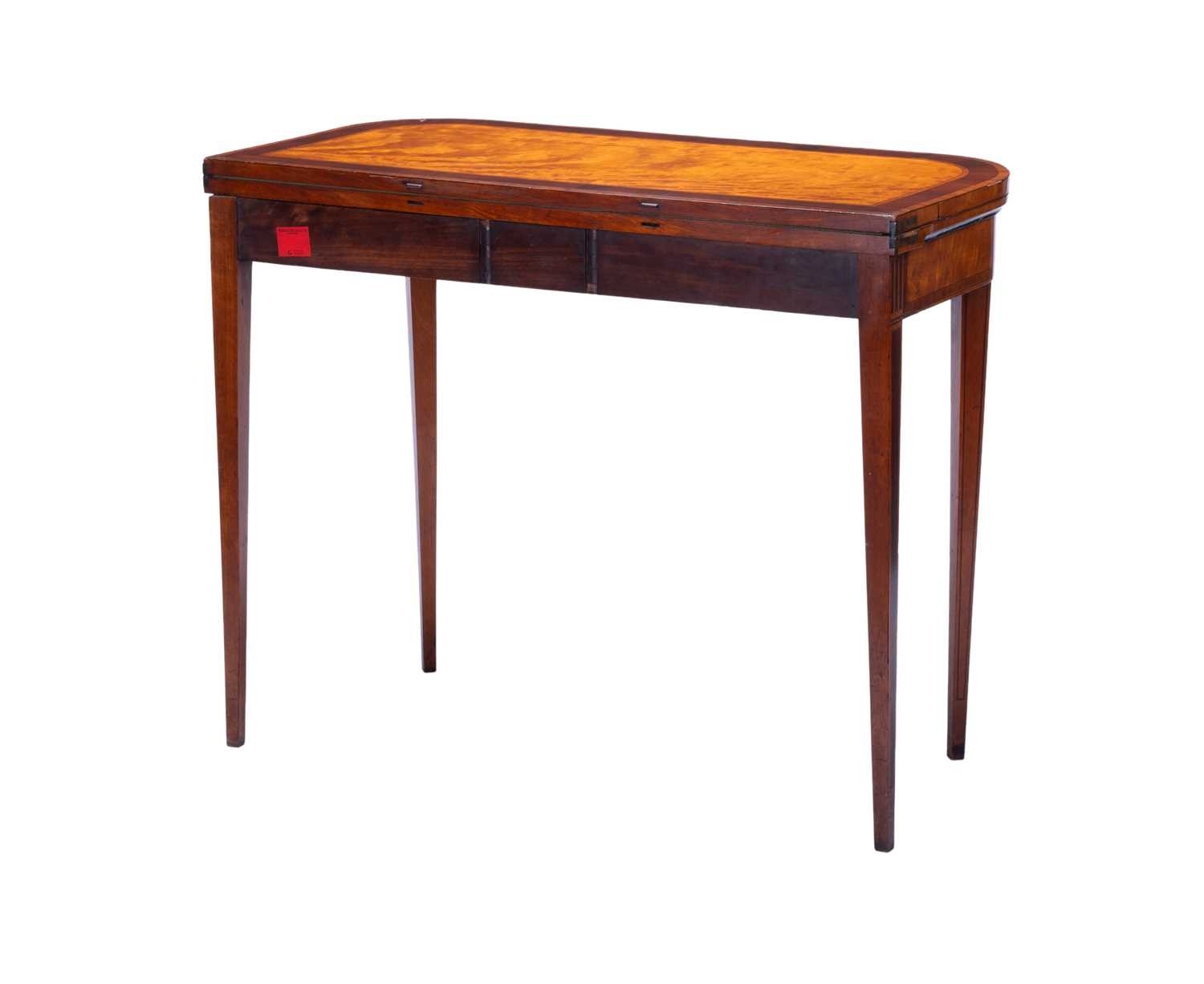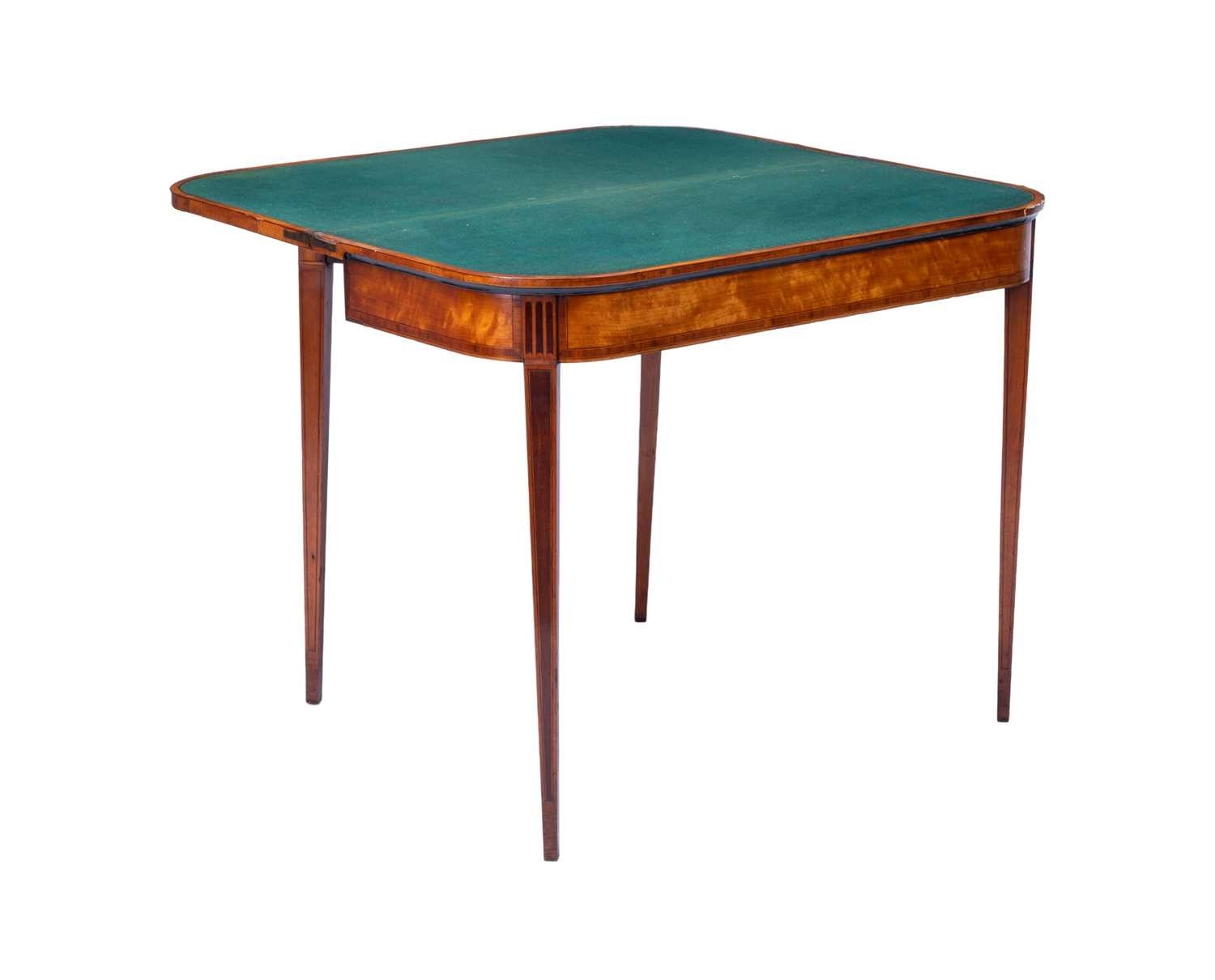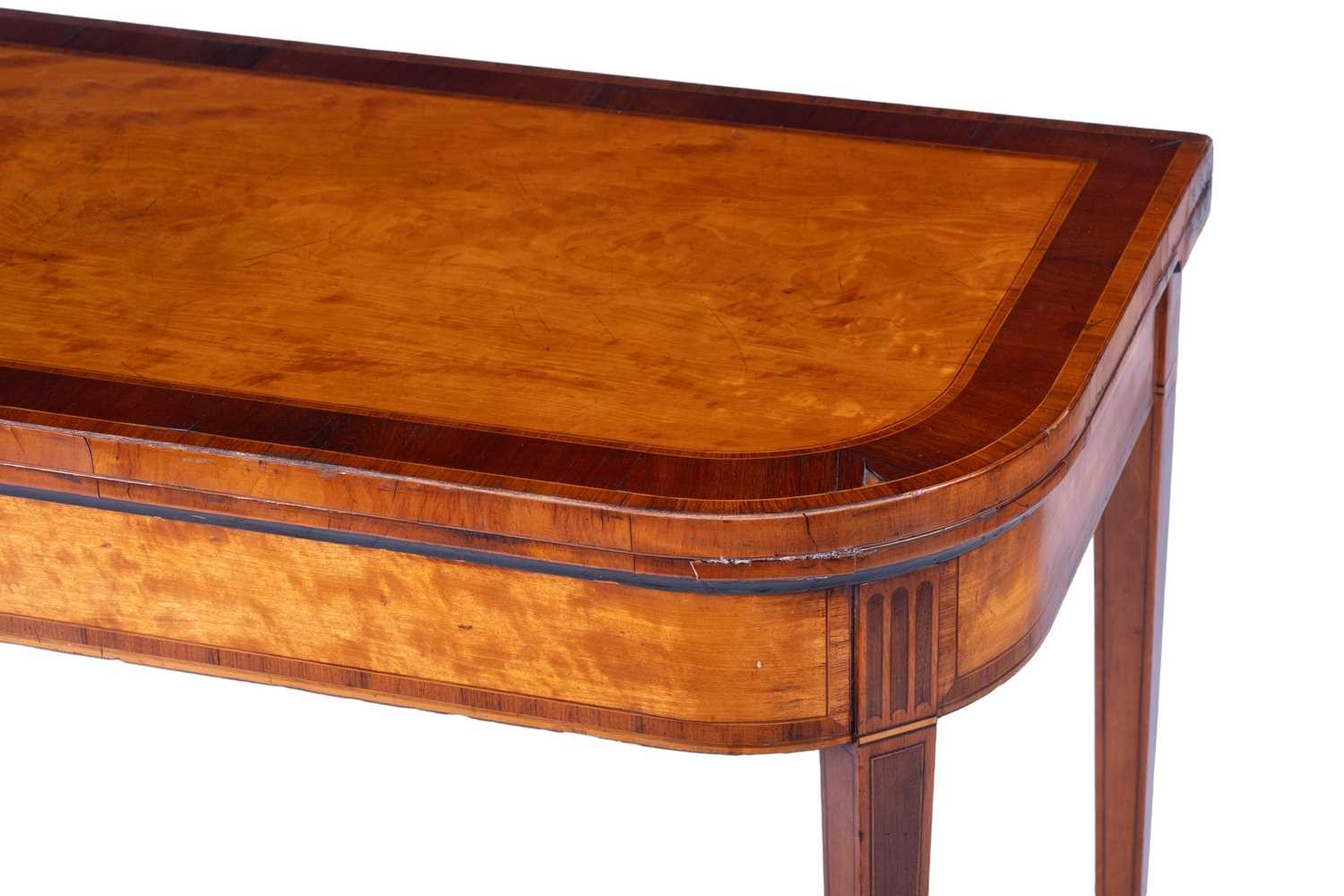A George III satinwood and rosewood banded D-shaped card table, on square tapering legs, 75 cm high x 92 cm wide.
