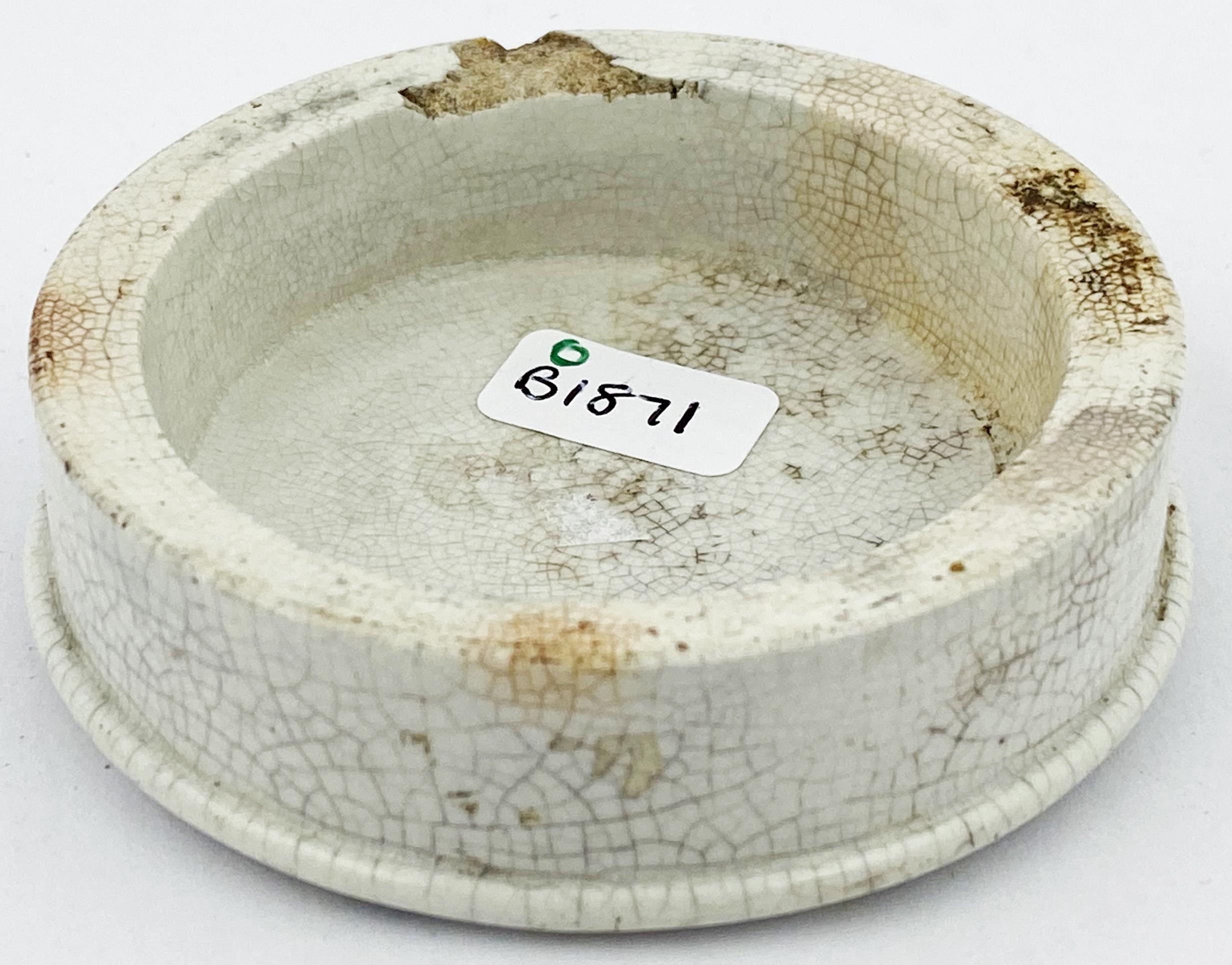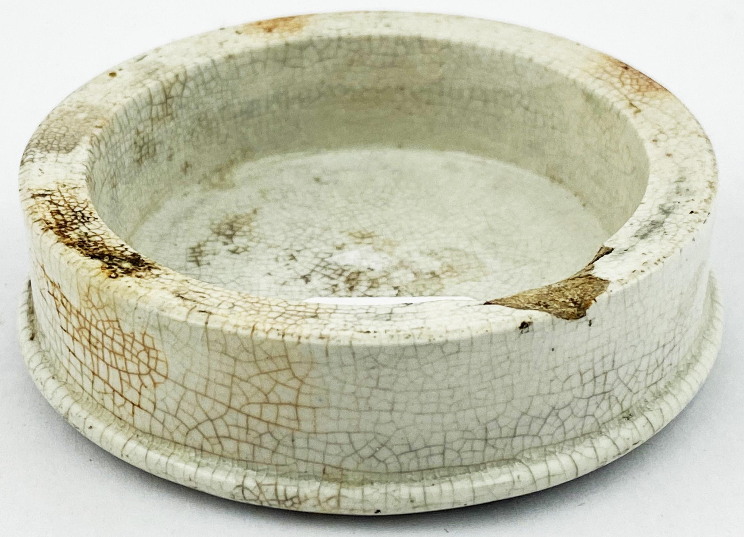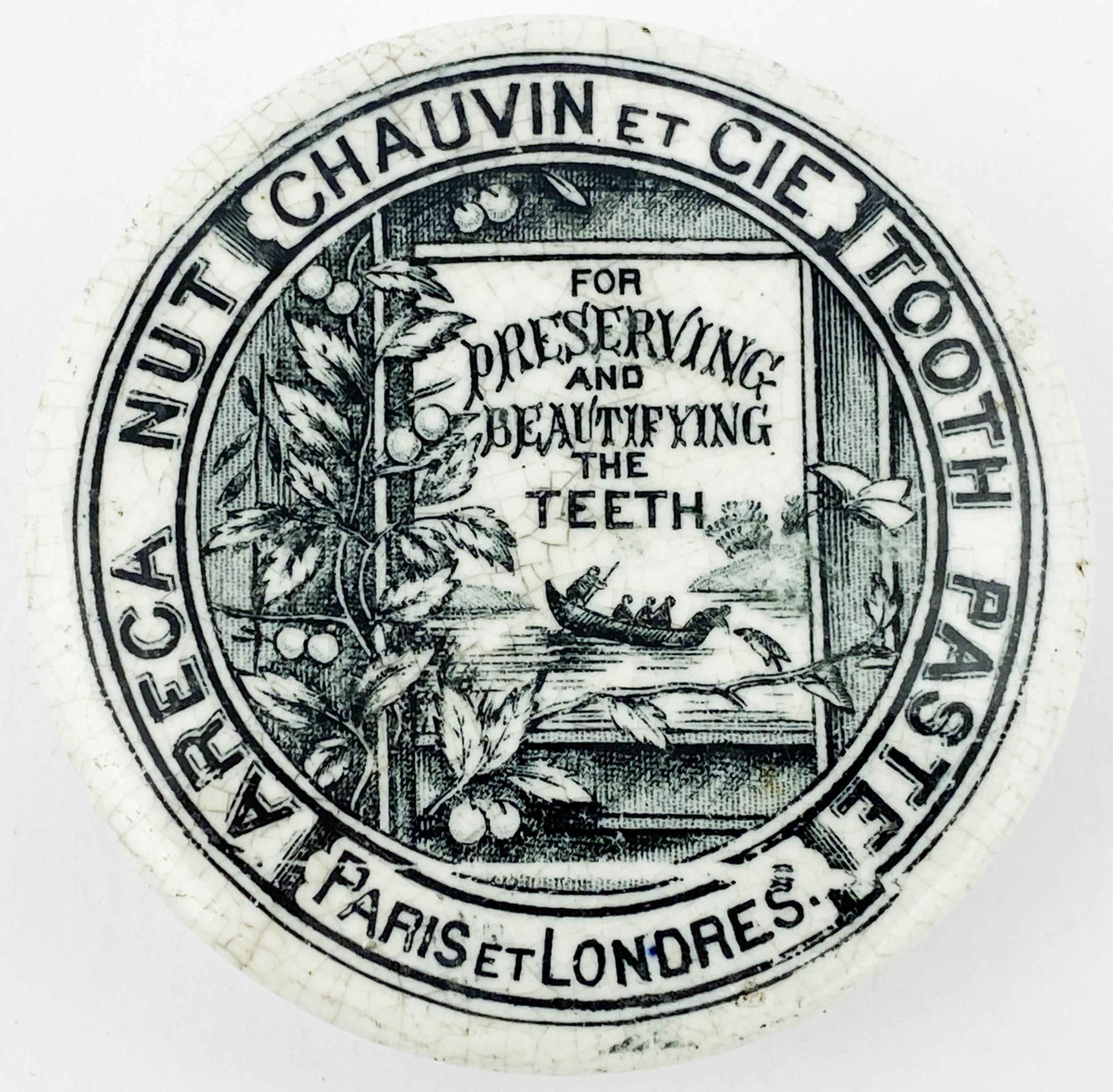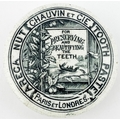 PARIS POT LID. 2.75ins diam. Black transfer, boat scene pic to centre. CHAUVIN ET CIE/ PARIS ET LONDRES. Staining & under side flake. (