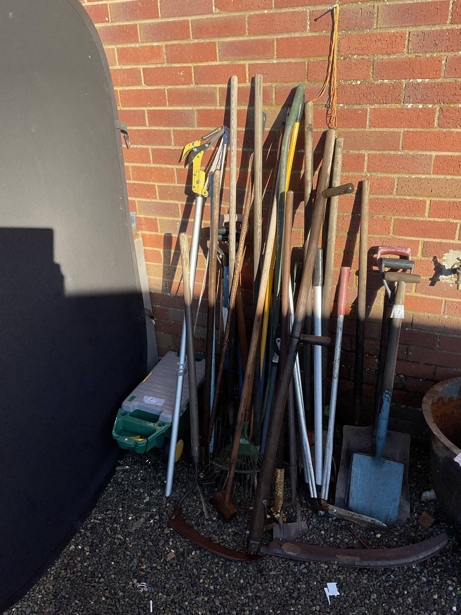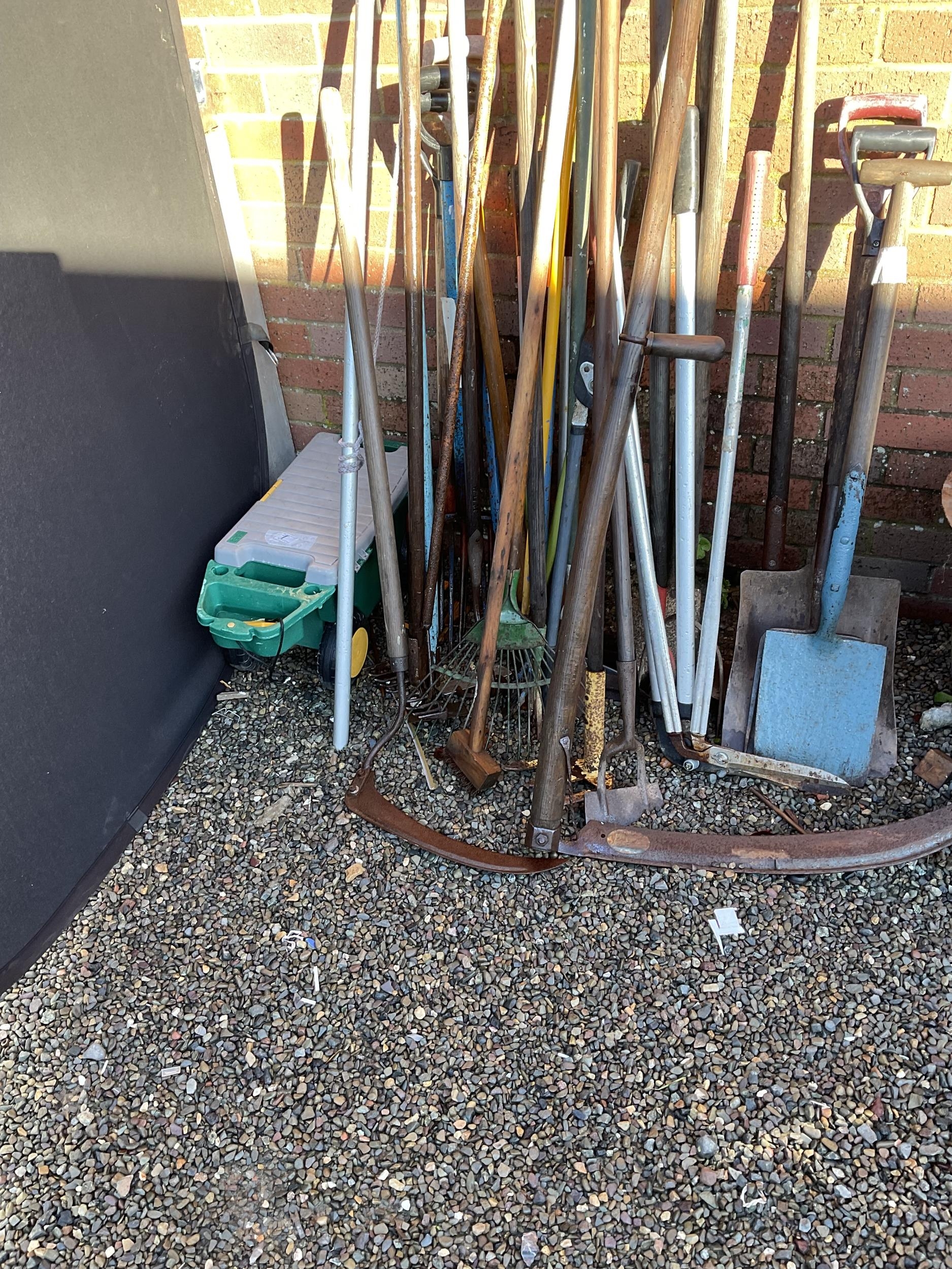 LARGE QTY OF TOOLS TO INCLUDE SPADES, RAKES ETC