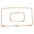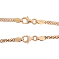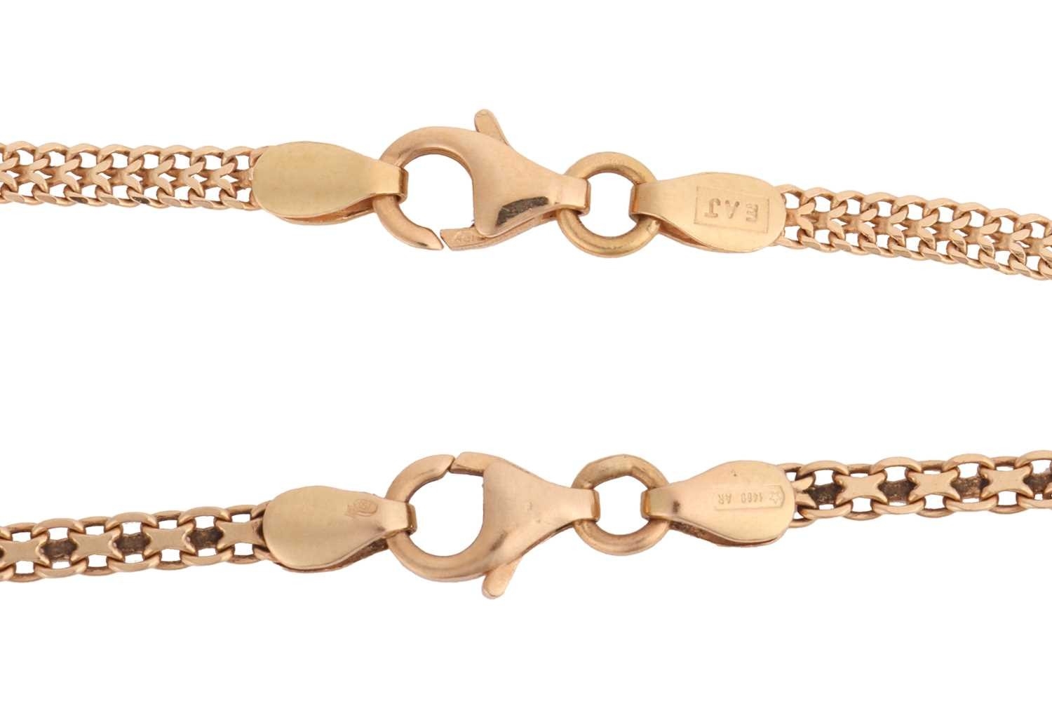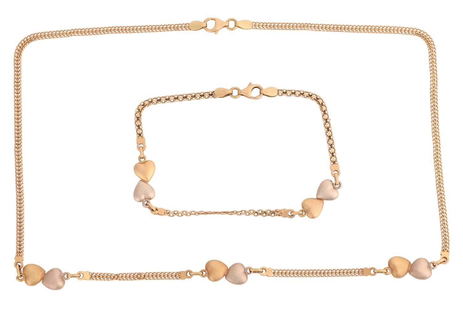 A double-heart necklace and matching bracelet, the necklace consisting of a flat mesh-style chain interspersed by three double-heart spacers, in bi-colour metal, featuring a brushed and polished finish either side, together with a matching bracelet with two double-heart spacers on a fancy-link chain, leading to a trigger clasp; the necklace measuring approximately 43.0cm and the bracelet approximately 19.5cm, both in yellow metal marked '750' with Italian maker's marks; 12.1 grams (2).