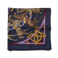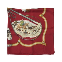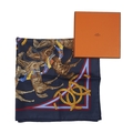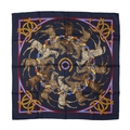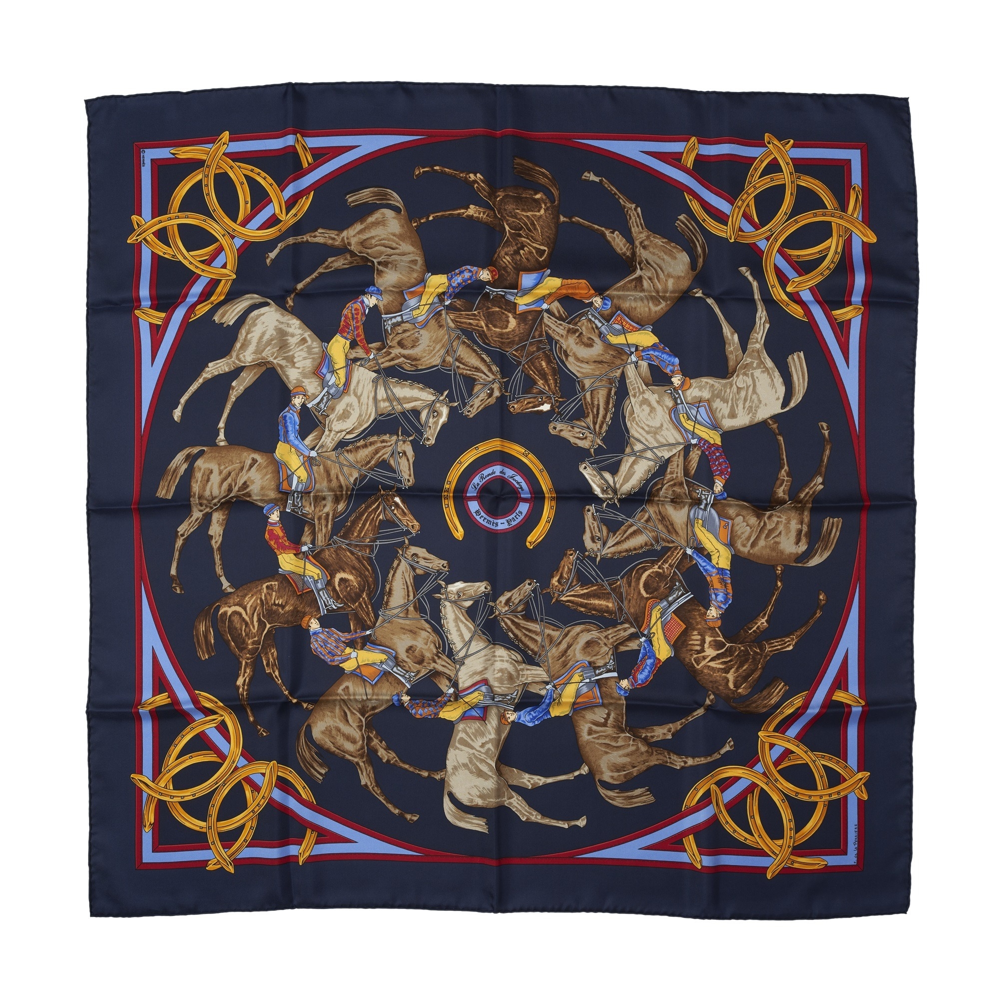 Hermes, a La Ronde des Jockeys silk scarf, designed by Francoise de la Perriere and first issued in 1969/70, featuring twelve jockeys on horses circling the centre of the scarf, measuring 90 by 90cm, with maker's box