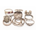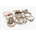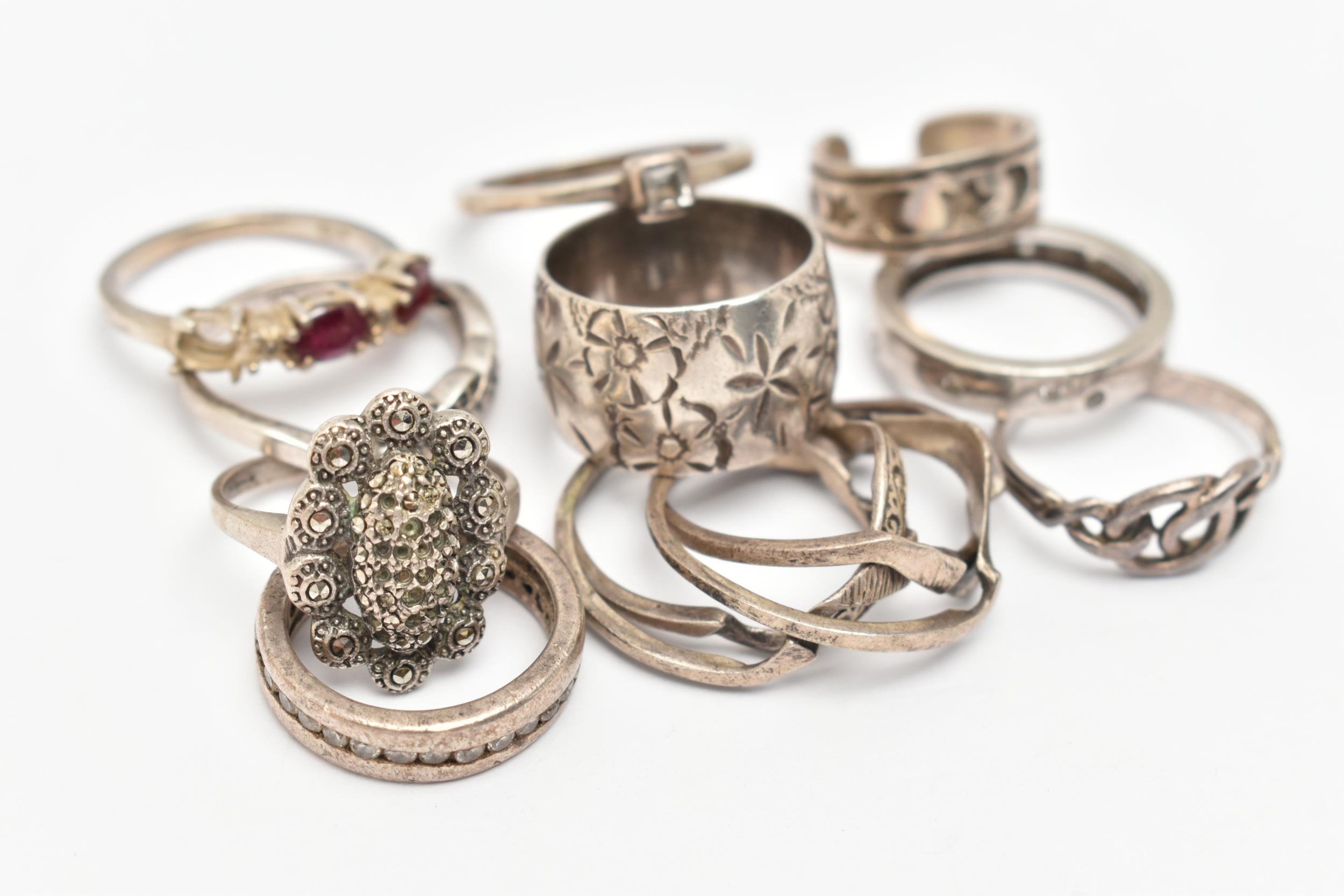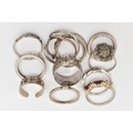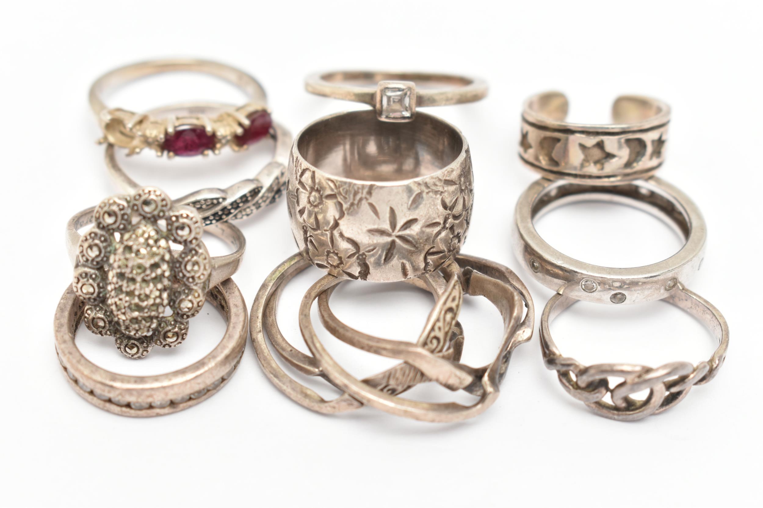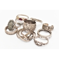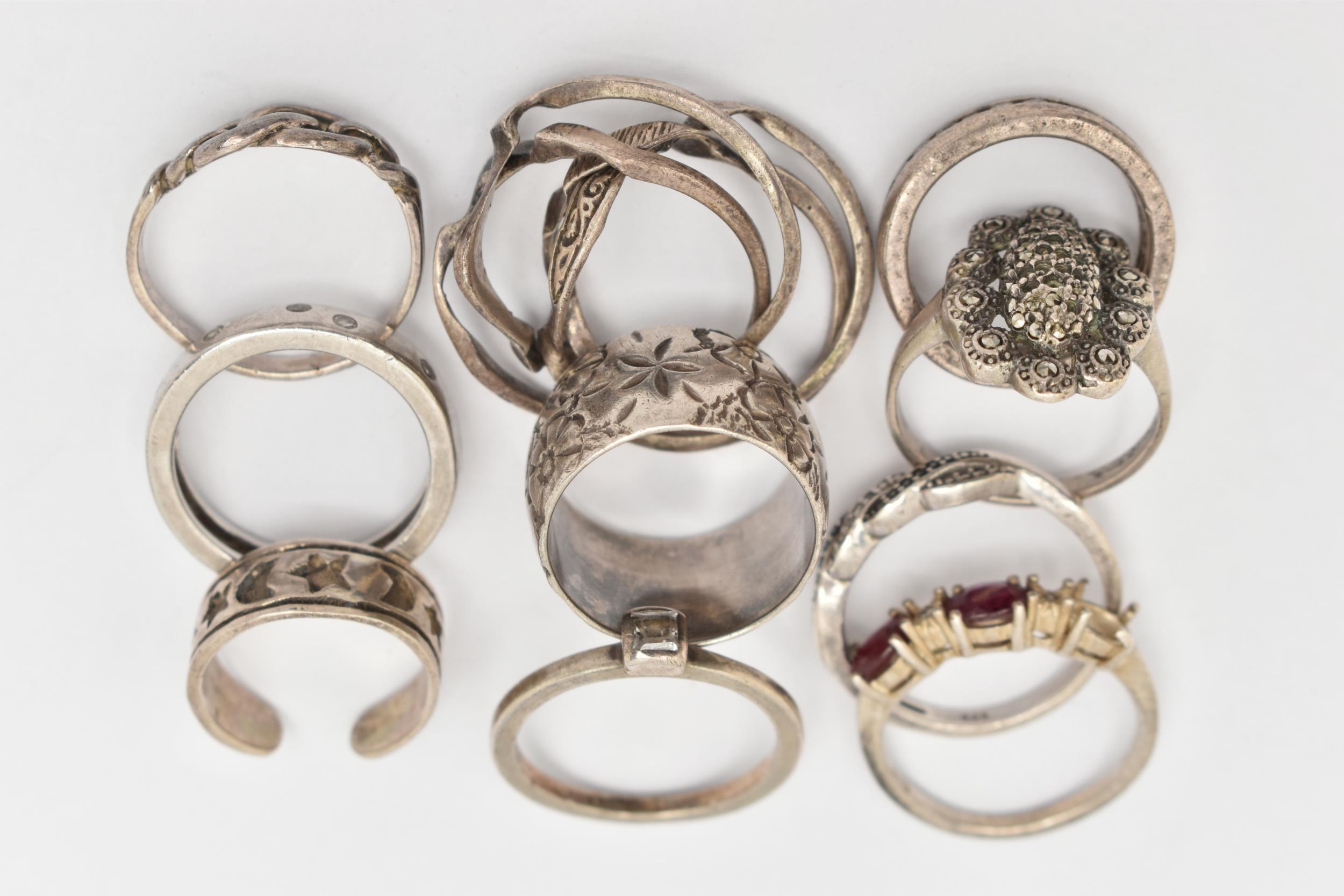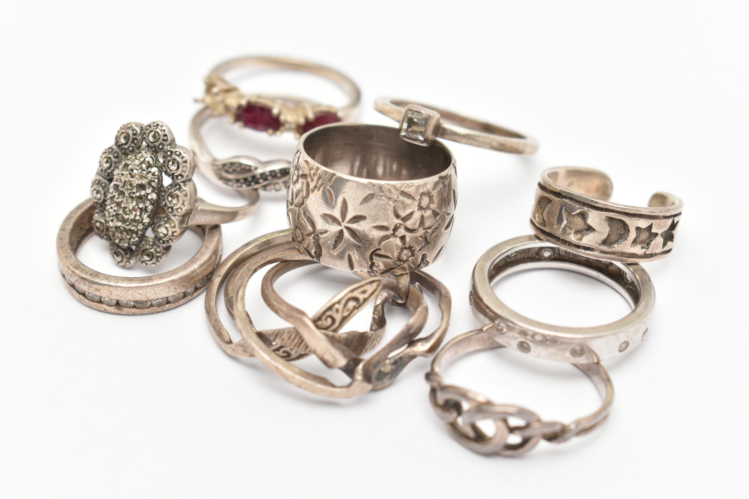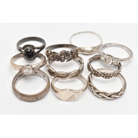 TEN WHITE METAL RINGS, various designs, one wide band hallmarked silver, 8.3 grams, six stamped 925, and three unmarked white metal rings, approximate gross weight of white metal 29.8 grams (condition report: general wear and tear, used conditions some may require attention, would benefit from a gentle clean)