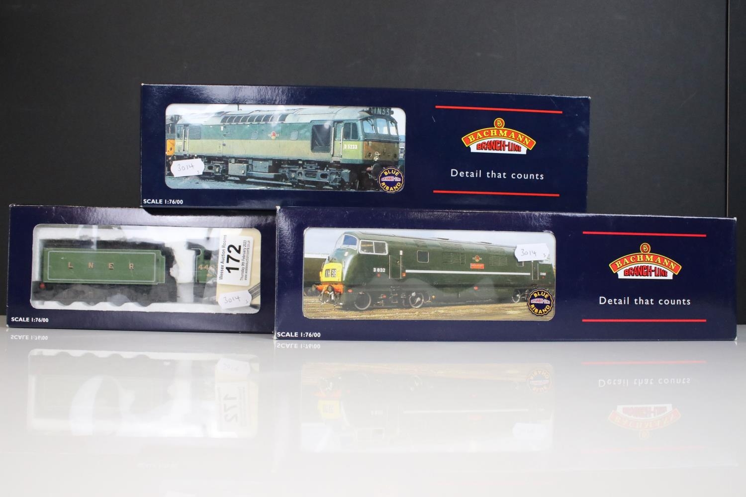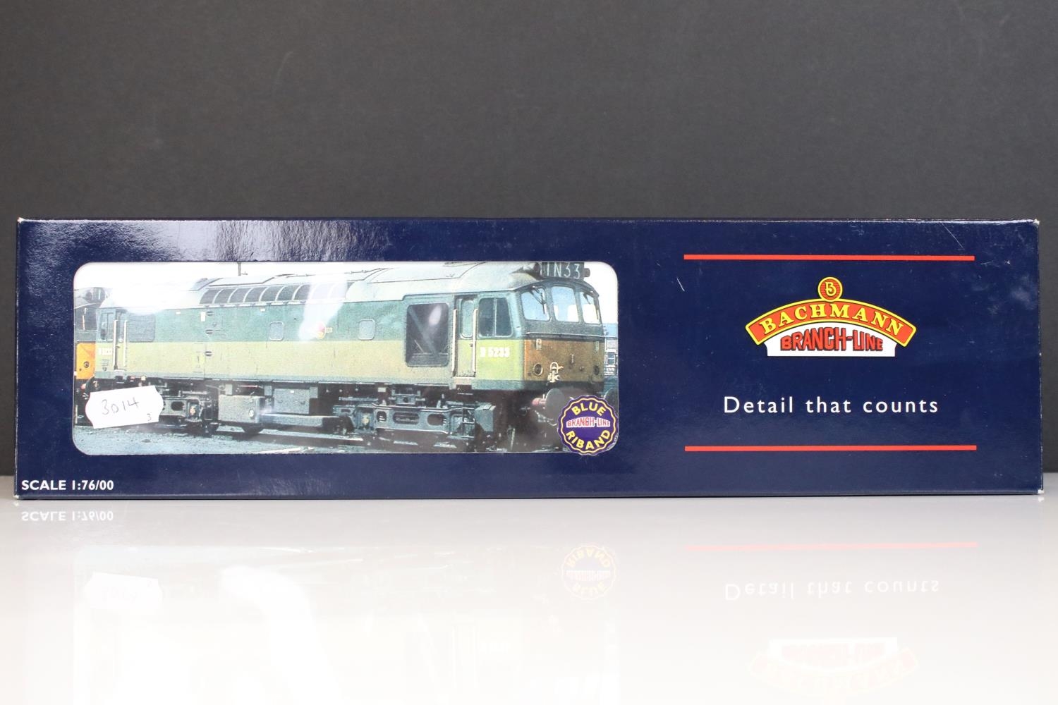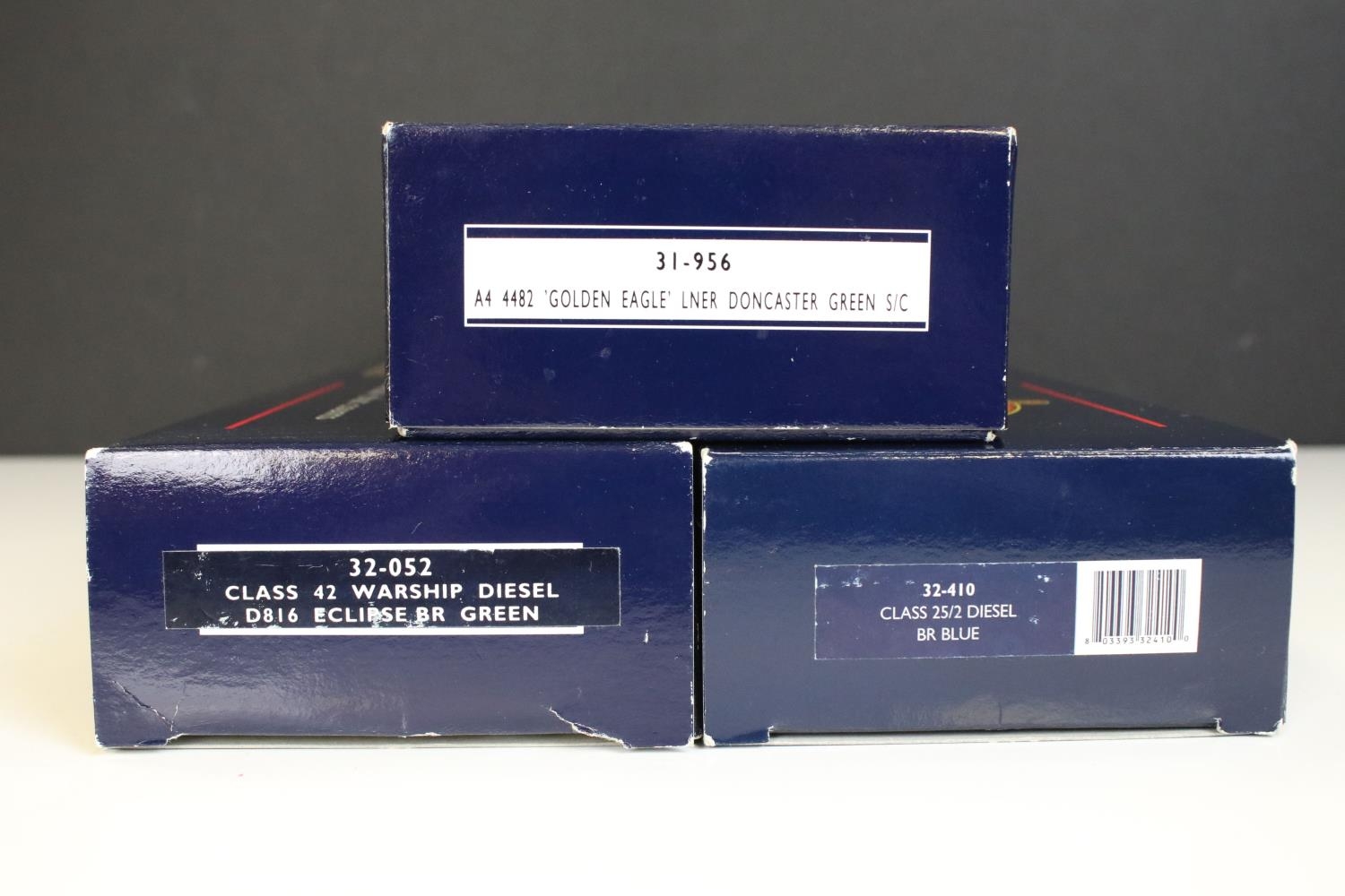 Three boxed Bachmann OO gauge locomotives to include 31956 A4 4482 Golden Eagle LNER Doncaster green S/C, 32052 Class 42 Warship Diesel D816 Eclipse BR green and 32410 Class 25/2 Diesel BR Blue