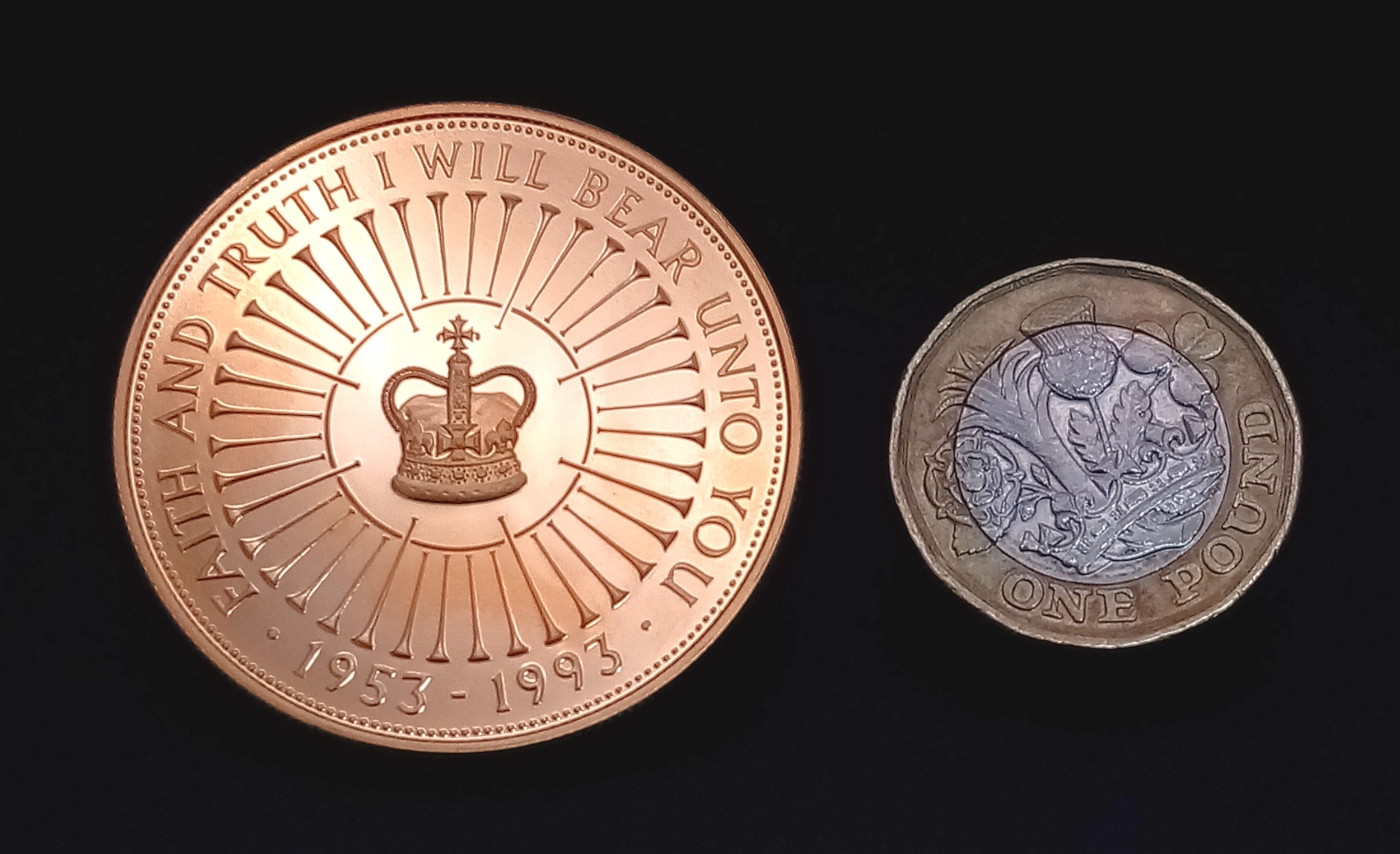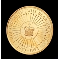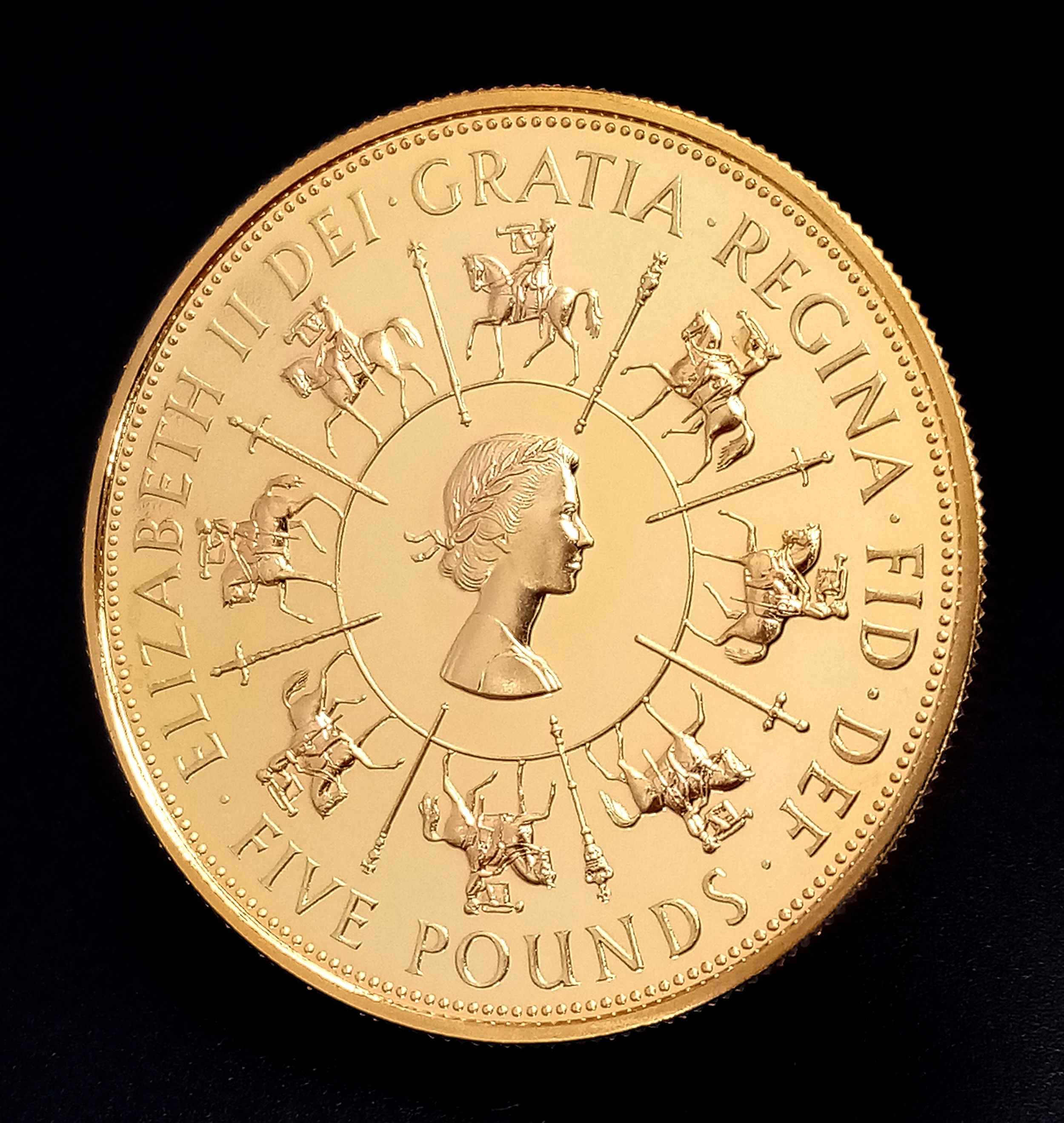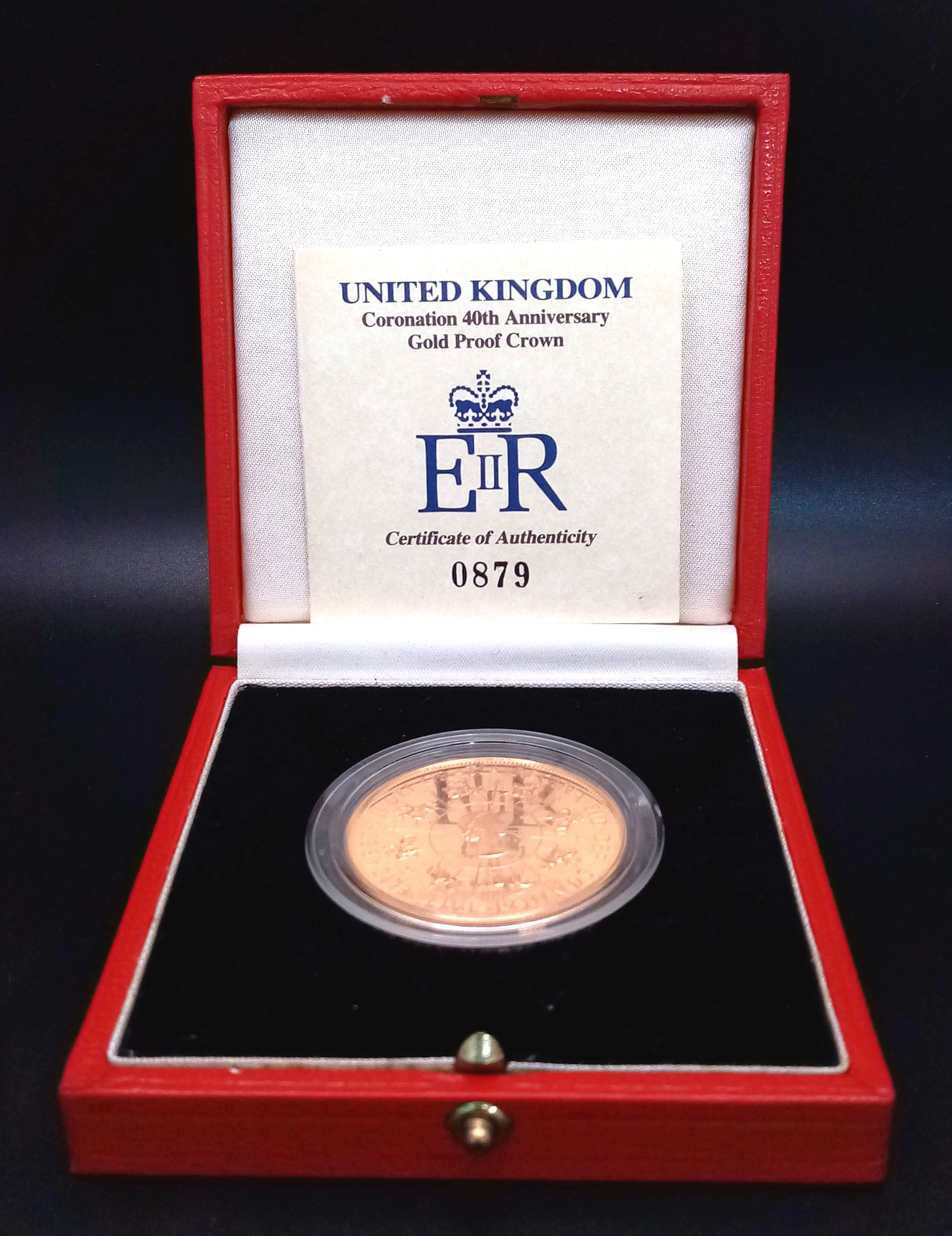 A Royal Mint United Kingdom Coronation 40th Anniversary Gold Coin. To celebrate the Fortieth Anniversary of the Coronation, laureate head right surrounded by eight buglers on horseback and the inscription ELIZABETH II DEI GRATIA REGINA FID DEF FIVE POUNDS rev. St Edward's Crown encircled by 40 trumpets and the inscription FAITH AND TRUTH I WILL BEAR UNTO YOU 1953-1993. 39.94g of 22k gold. Limited edition - 0879 of 2500. Comes with a certificate of authenticity and presentation case. In excellent condition. A wonderful coin collectible or gift to hand down to loved ones.