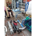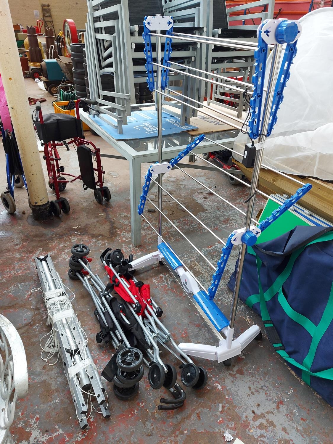 Four items to include a Nubreeze electric clothes drying rack, two lightweight folding pushchairs and an aluminium rotary clothes dryer