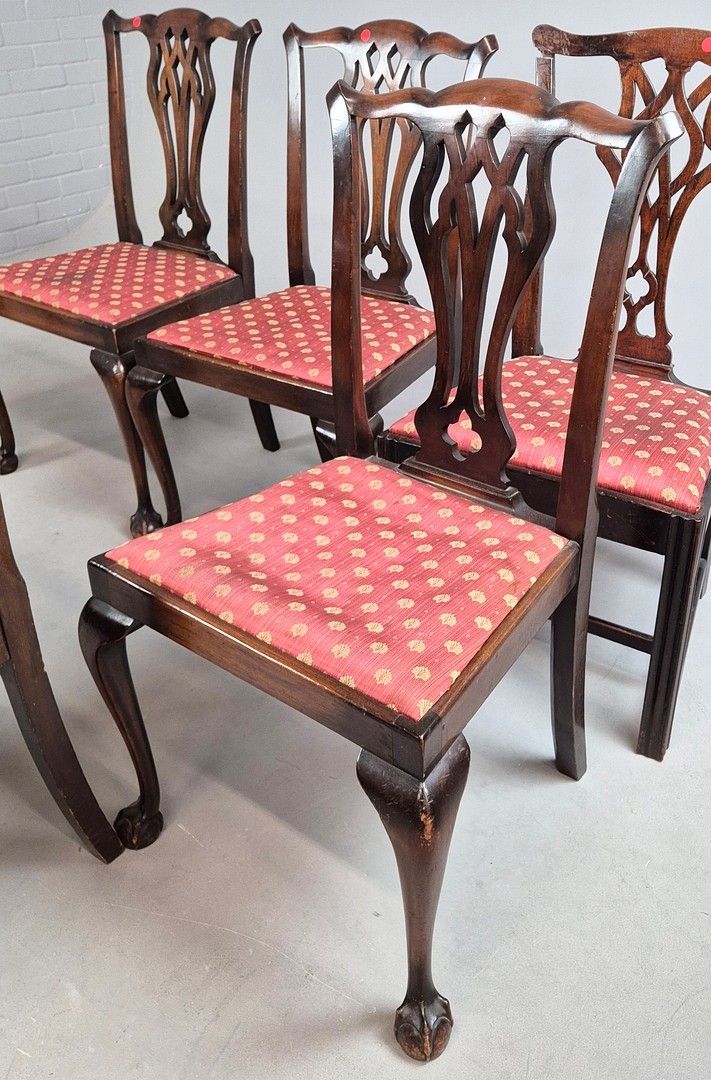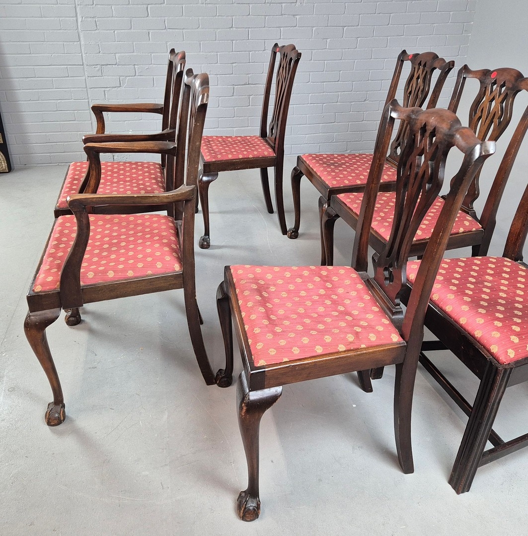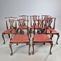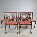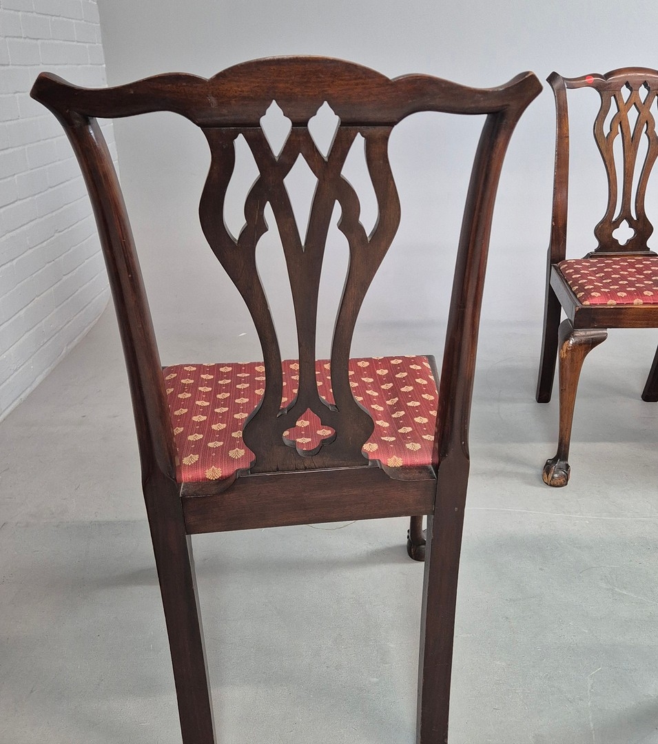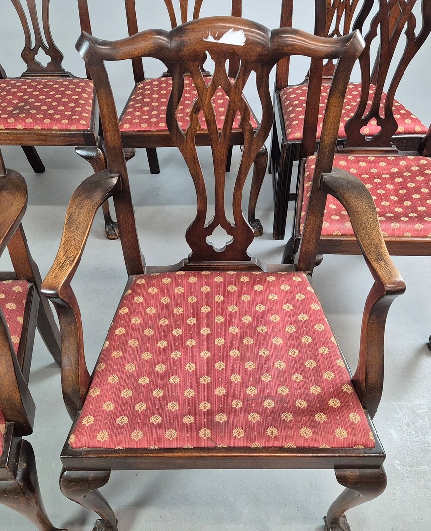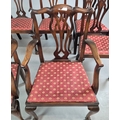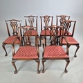 DINING CHAIRS, A MATCHED SET OF SEVEN (7). Georgian style including two carvers and one earlier period Georgian chair, mahogany, with decorative black splats, with cabriole supports and ball a and claw feet. Carvers each 56cm w x 100cm t.