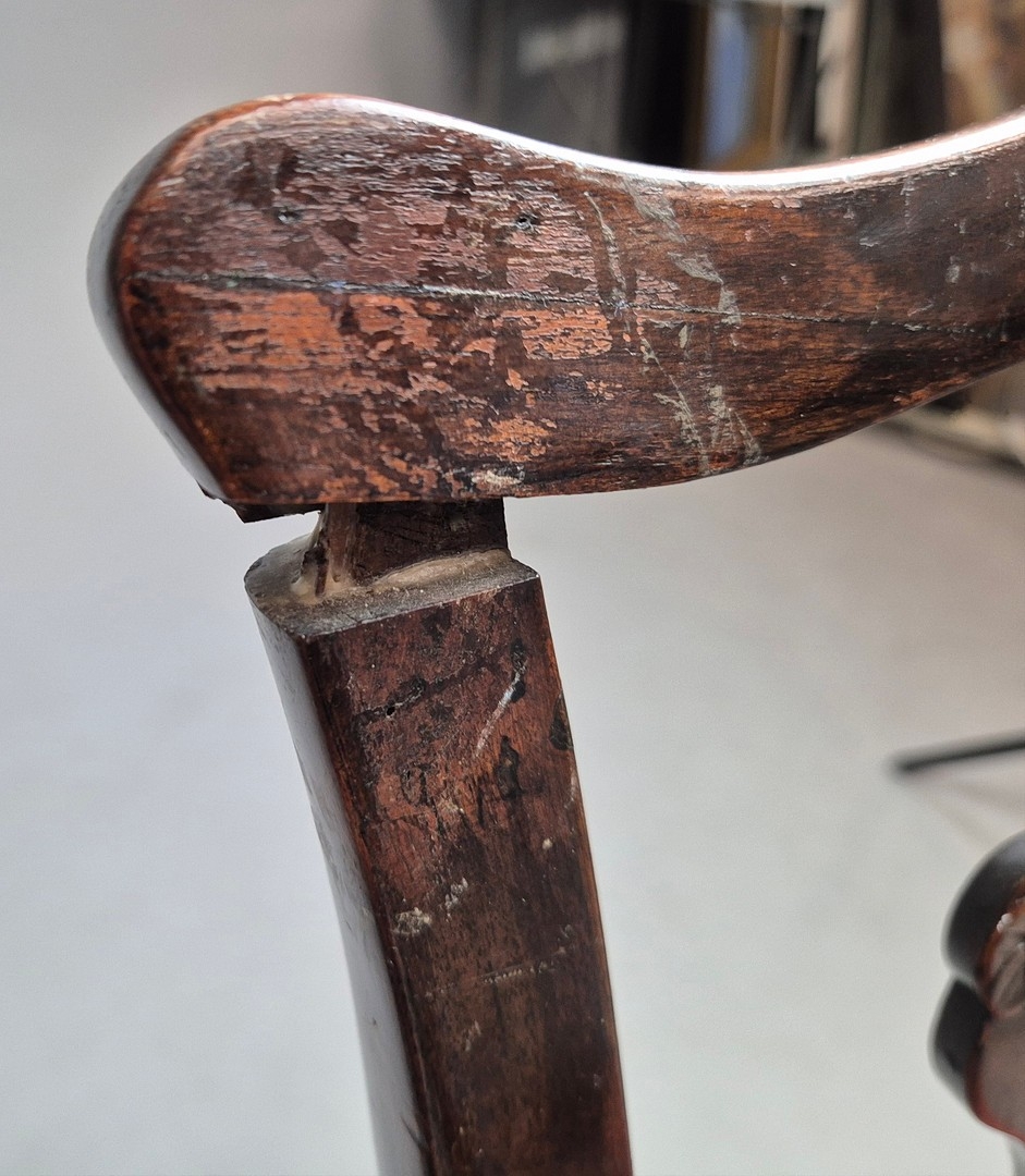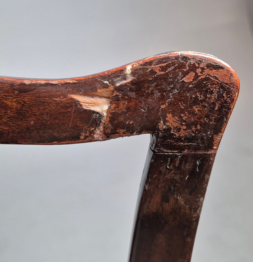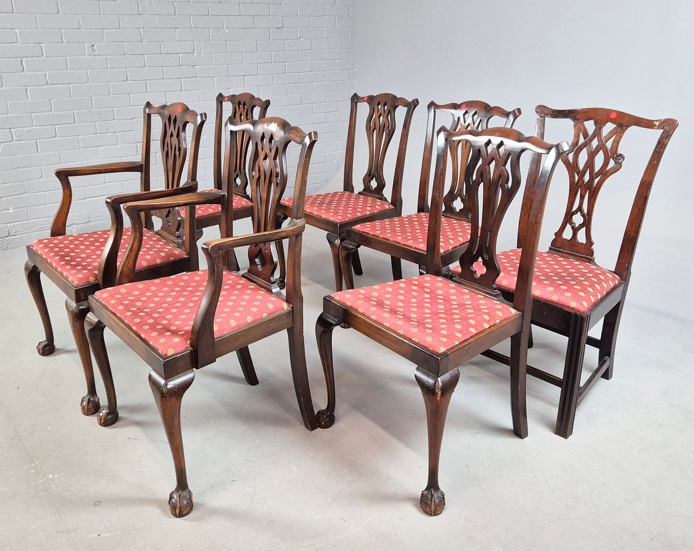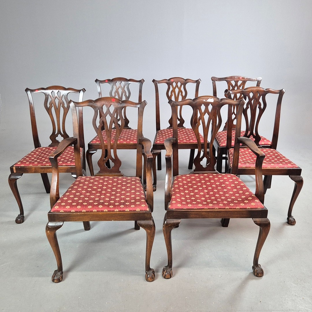 DINING CHAIRS, A MATCHED SET OF SEVEN (7). Georgian style including two carvers and one earlier period Georgian chair, mahogany, with decorative black splats, with cabriole supports and ball a and claw feet. Carvers each 56cm w x 100cm t.