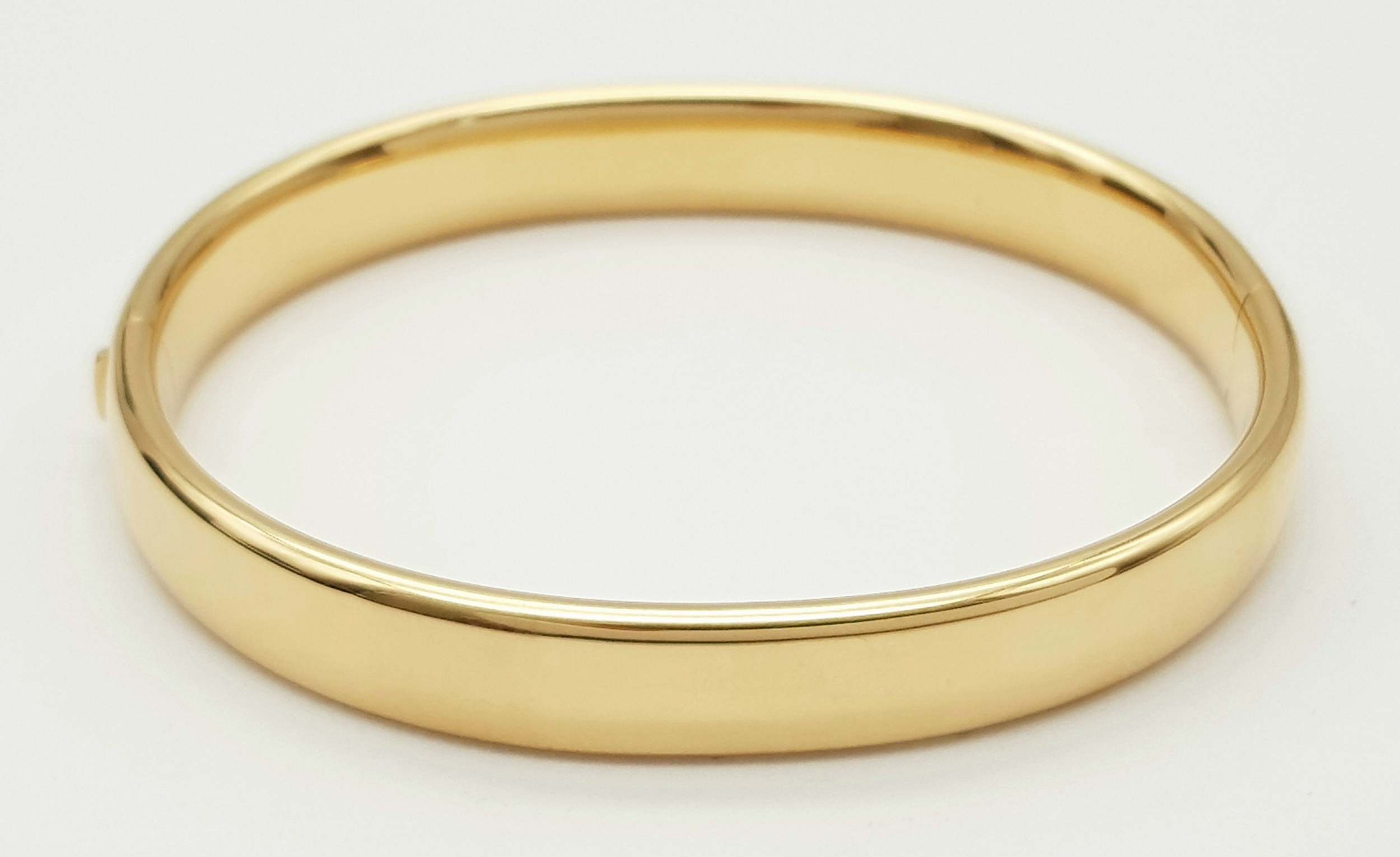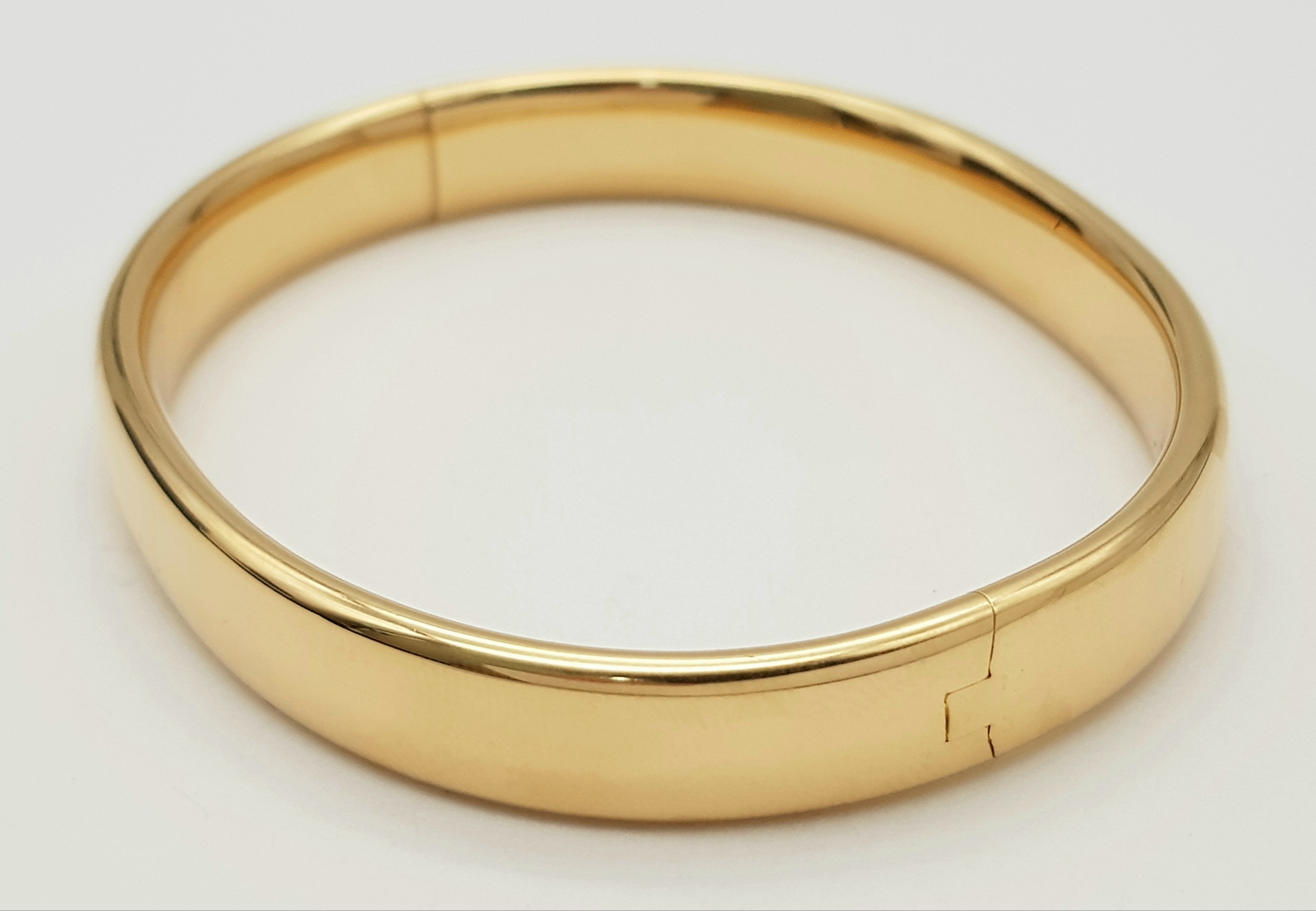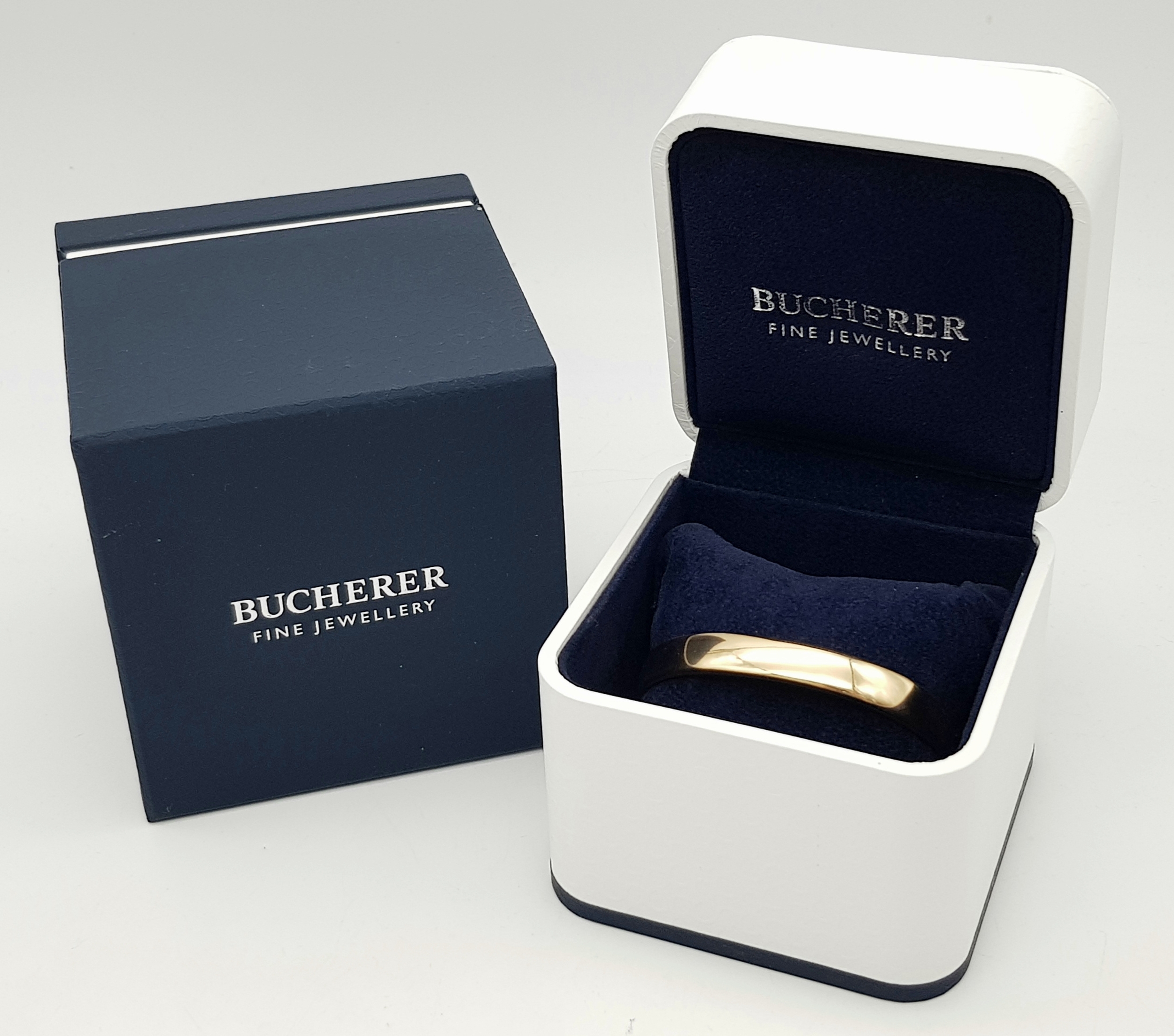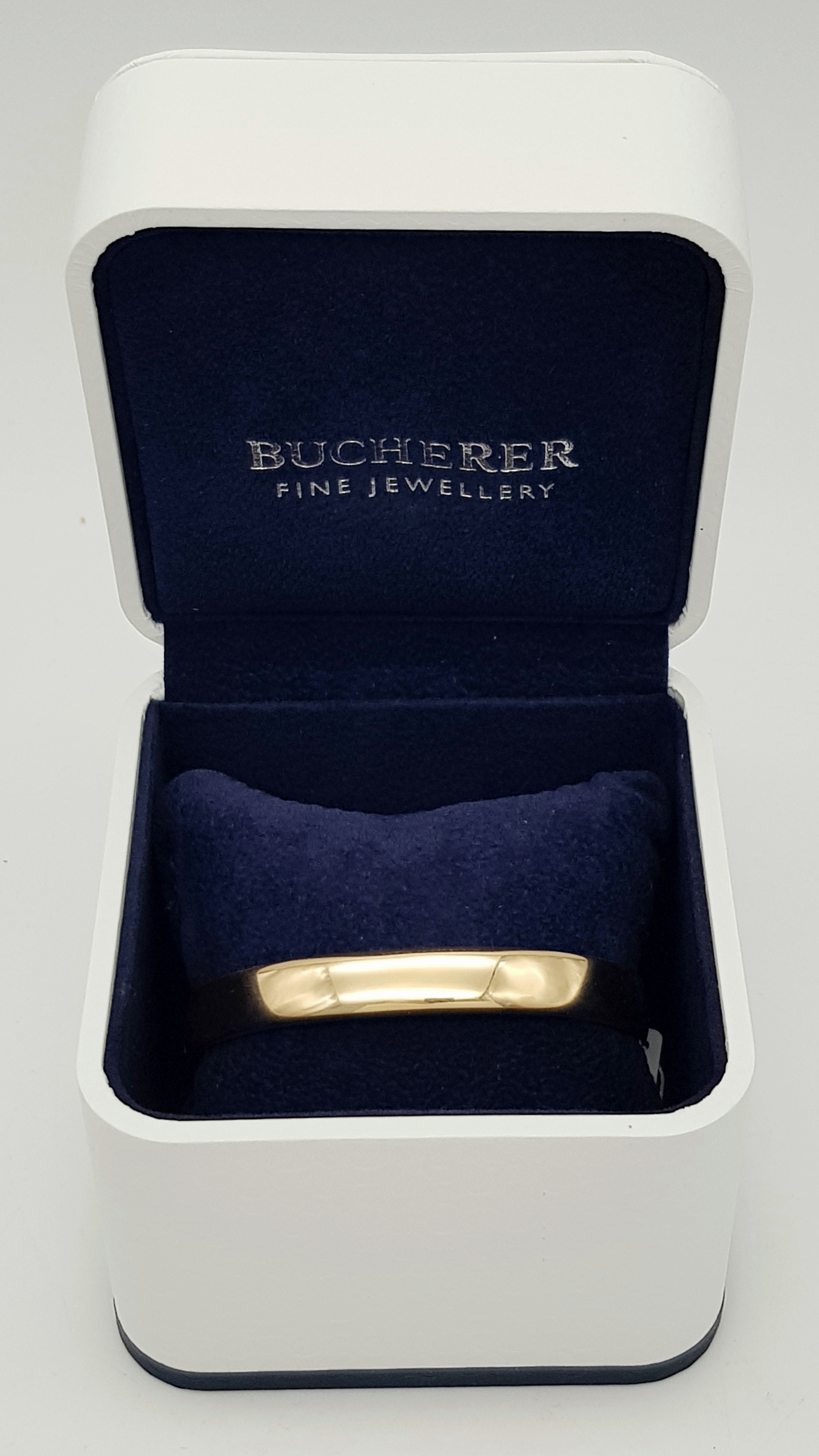 A Bucherer 18K yellow gold solid bangle. Total weight 24.3G. Diameter 6.8cm. Comes with original presentation case. Ref J167