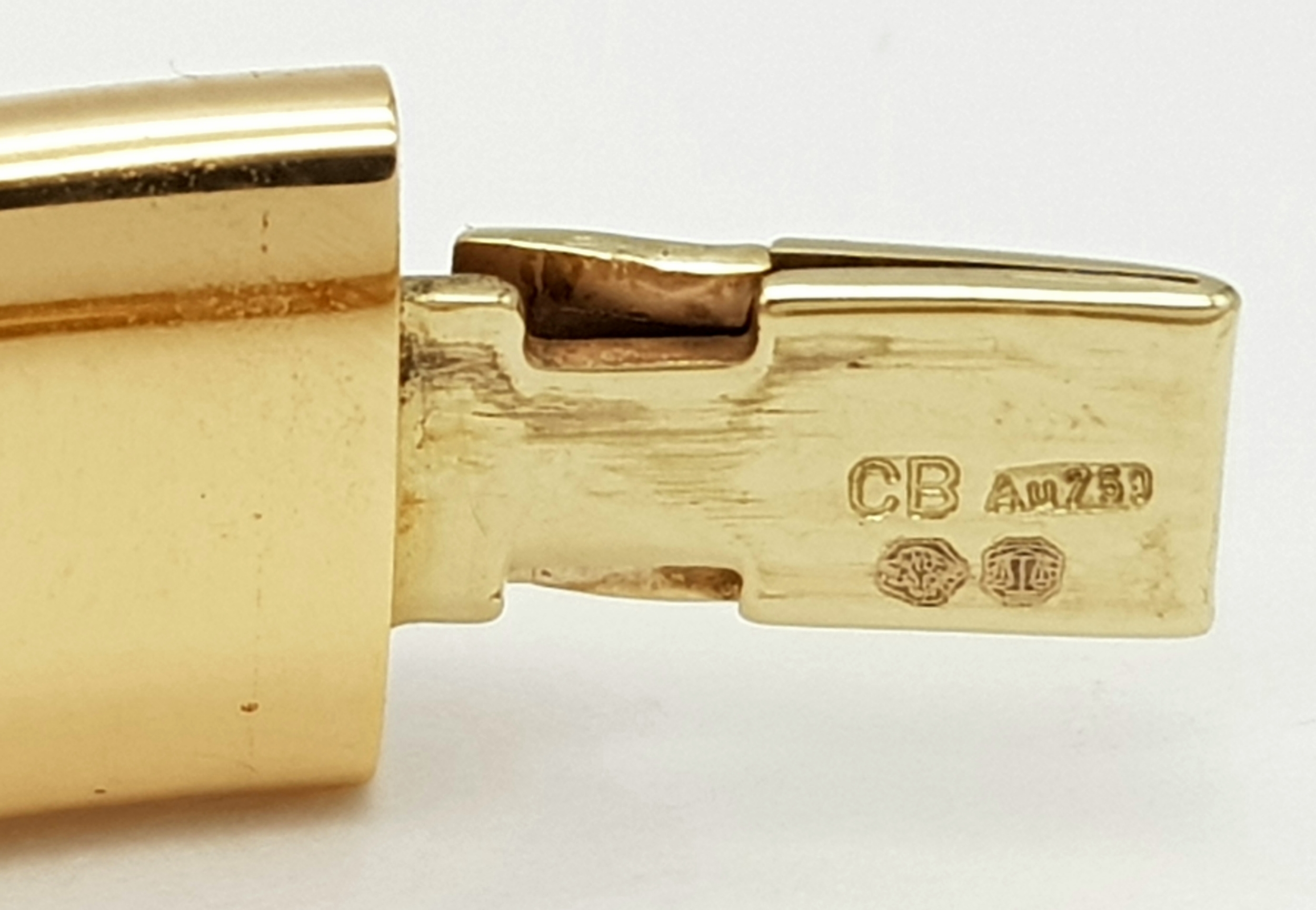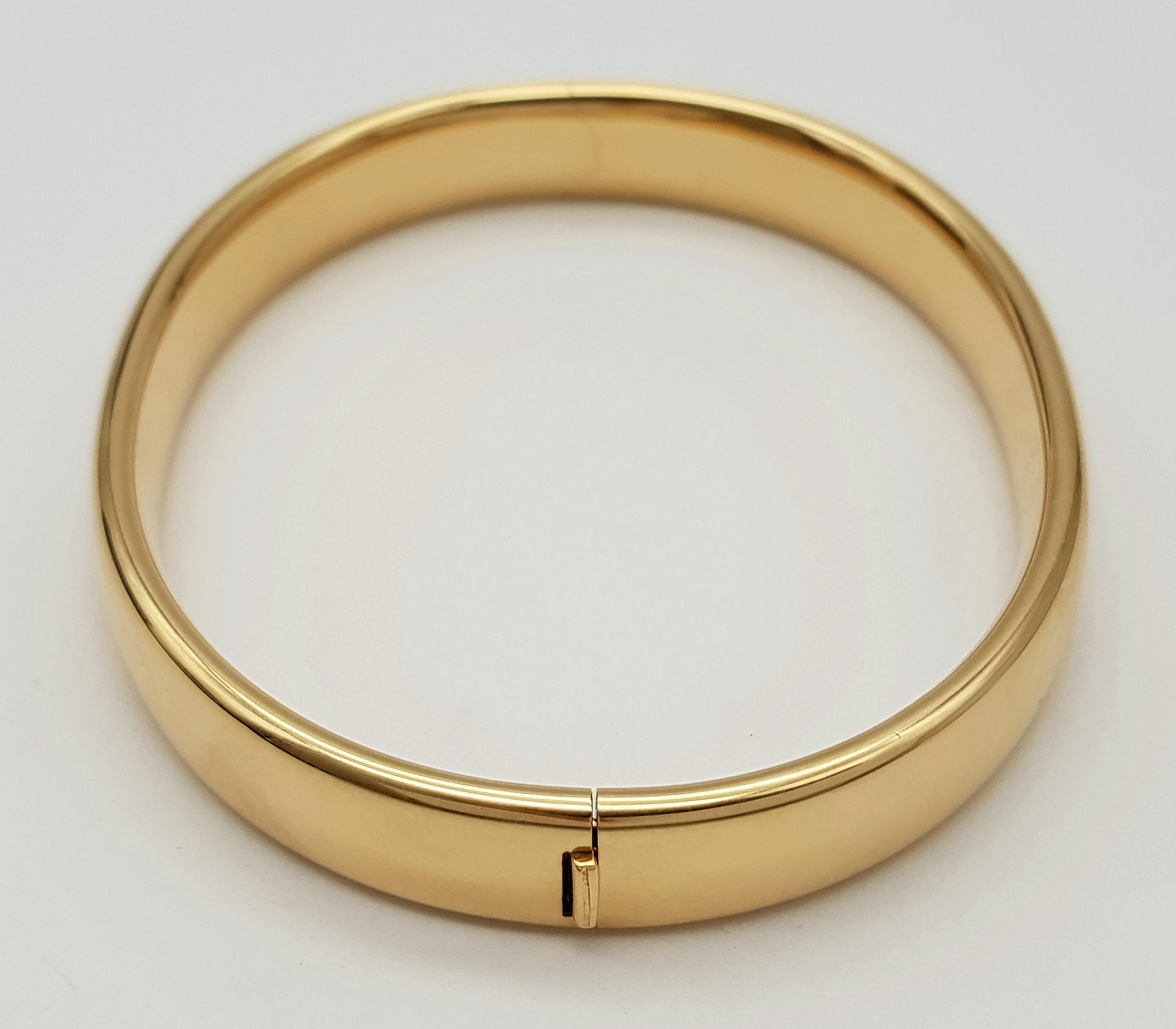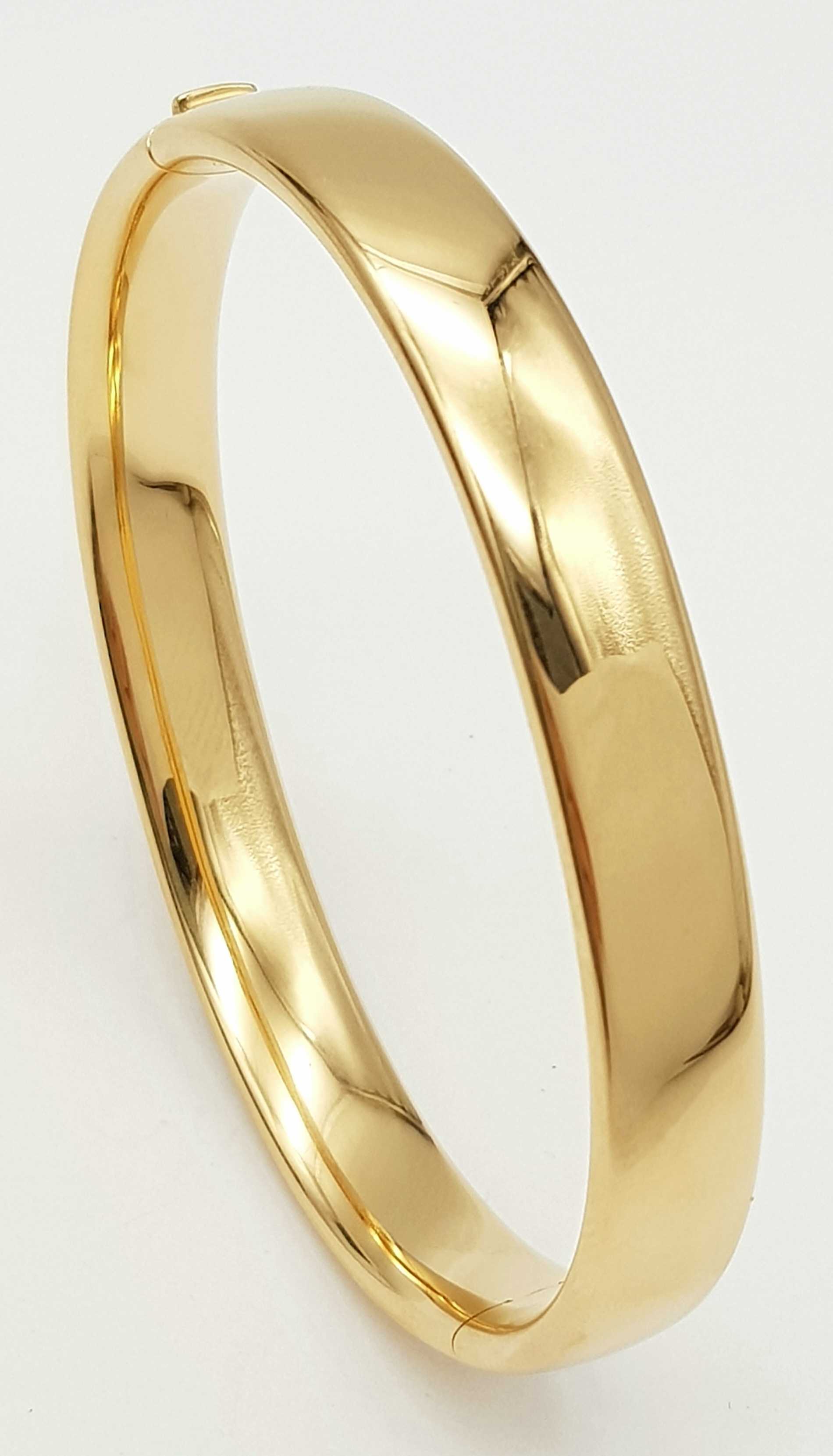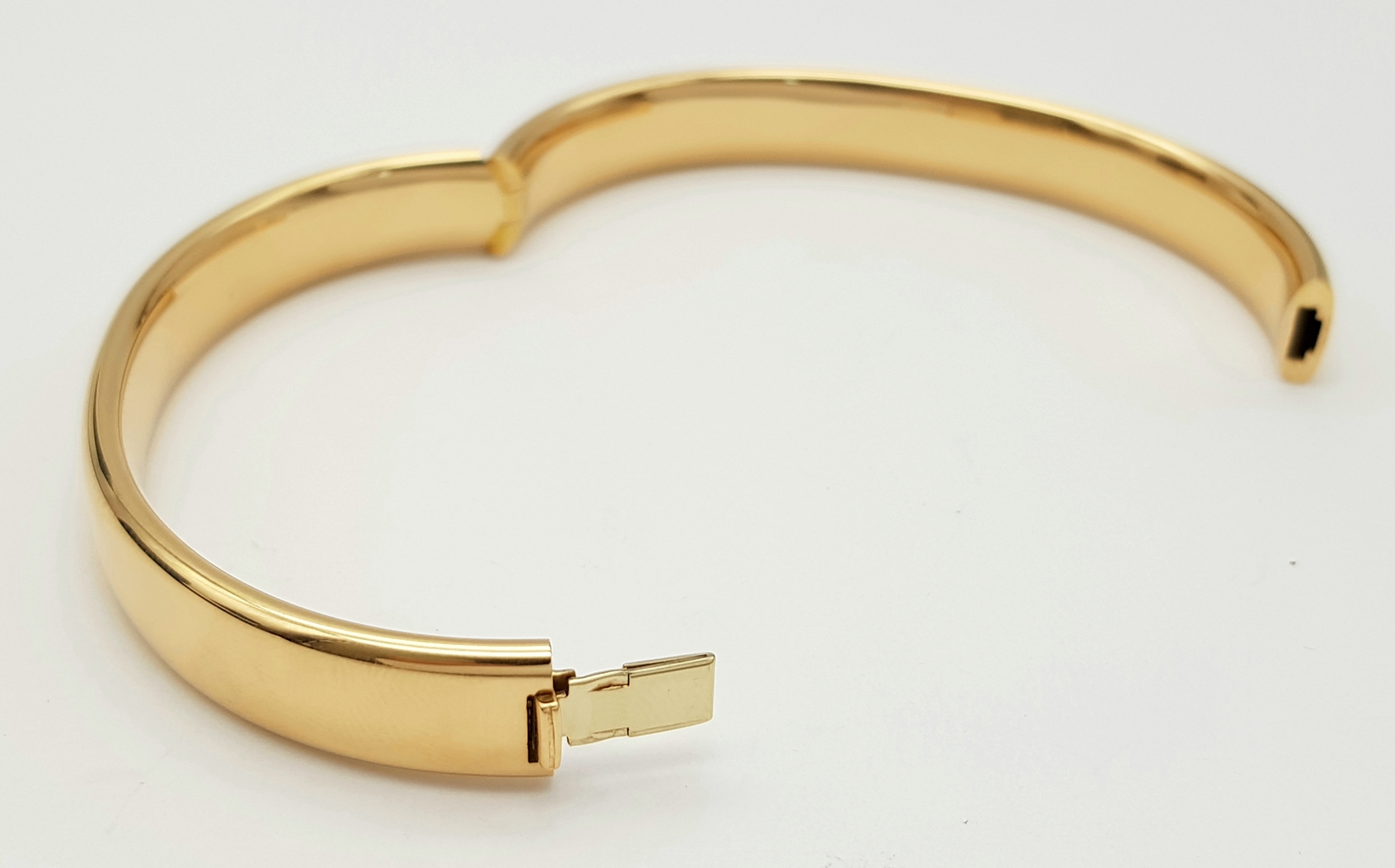 A Bucherer 18K yellow gold solid bangle. Total weight 24.3G. Diameter 6.8cm. Comes with original presentation case. Ref J167