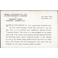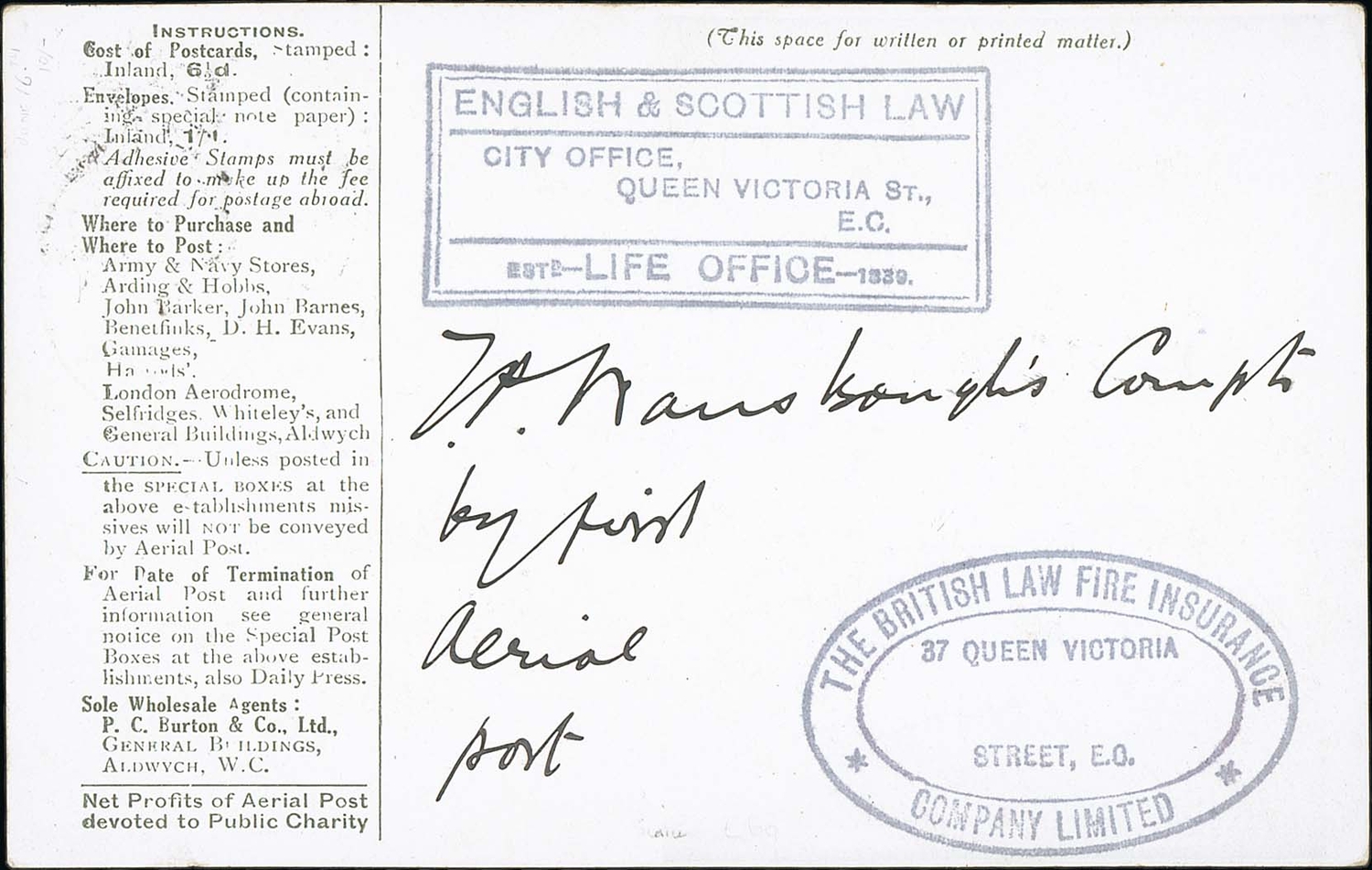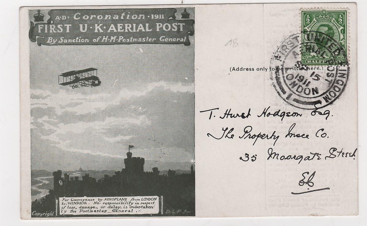 1911 (Sep 15) Green London postcard, the reverse with handstamps of "ENGLISH & SCOTTISH LAW LIFE OFFICE" and "THE BRITISH LAW FIRE INSURANCE COMPANY LIMITED" in Queen Victoria St., London E.C, manuscript "J.P Wansboughs Compts by first aerial post", with Aerial Post c.d.s code "1". A very scarce advert, very fine. Photo on Page 12.