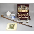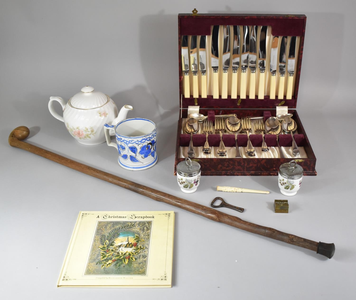 A Collection of Sundries to Include Walking Stick, Tankard, Teapot, Egg Coddlers, Christmas Scrapbook and Canteen of Cutlery