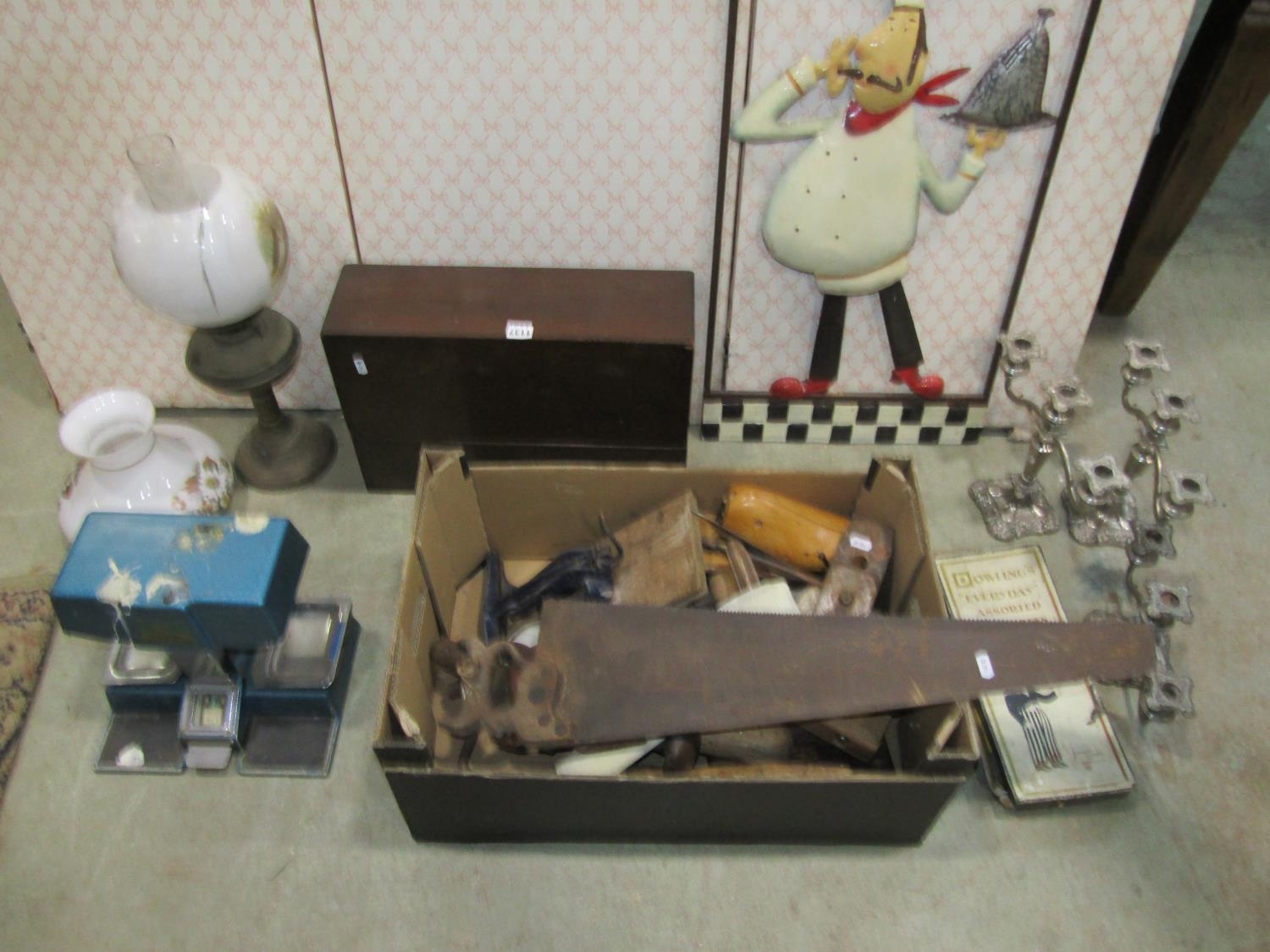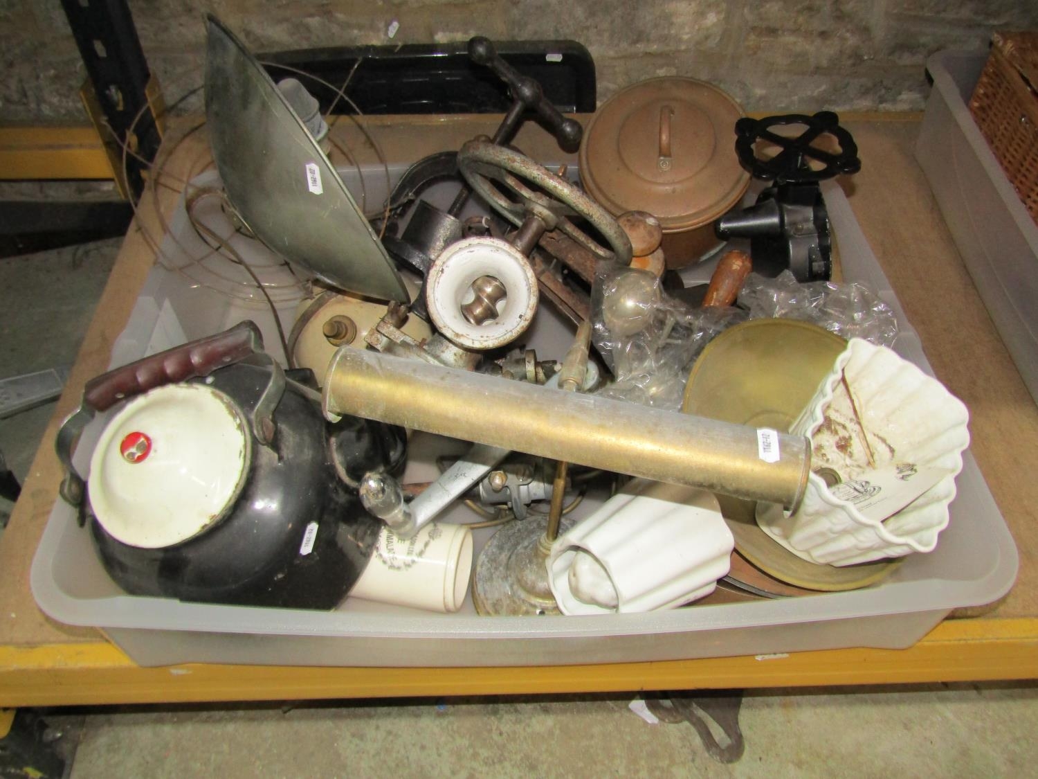 Mixed vintage kitchenalia to include mellow moulds, together with mixed lighting, tools, etc