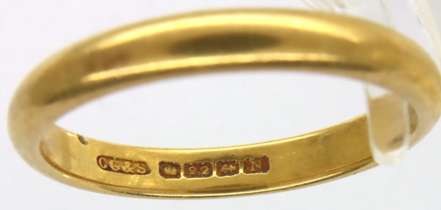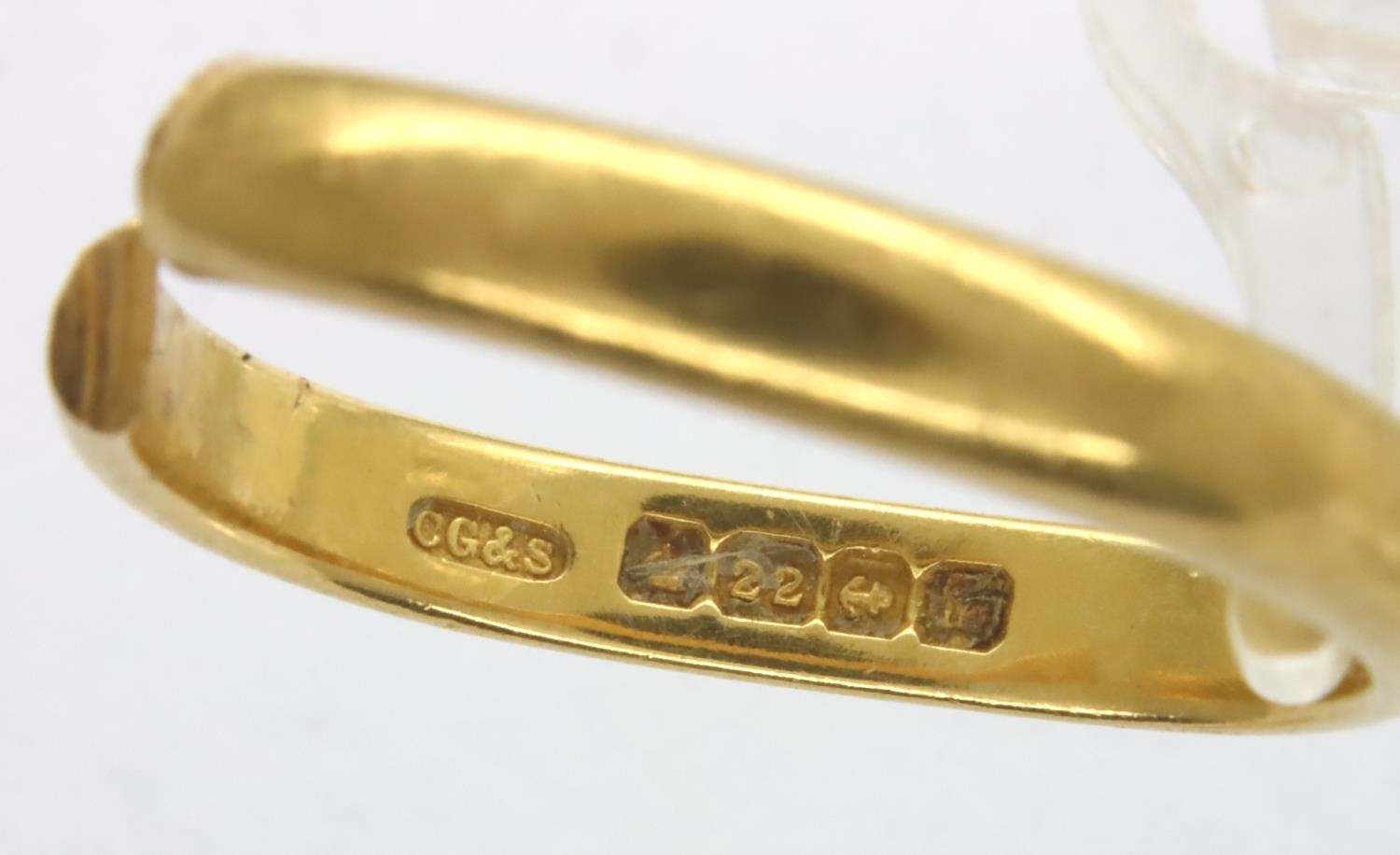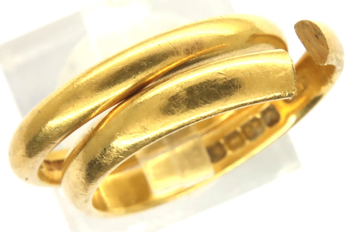 Two 22ct gold band rings, one cut, one size Q/R, combined 9.3g. P&P Group 1 (£14+VAT for the first lot and £1+VAT for subsequent lots)