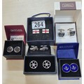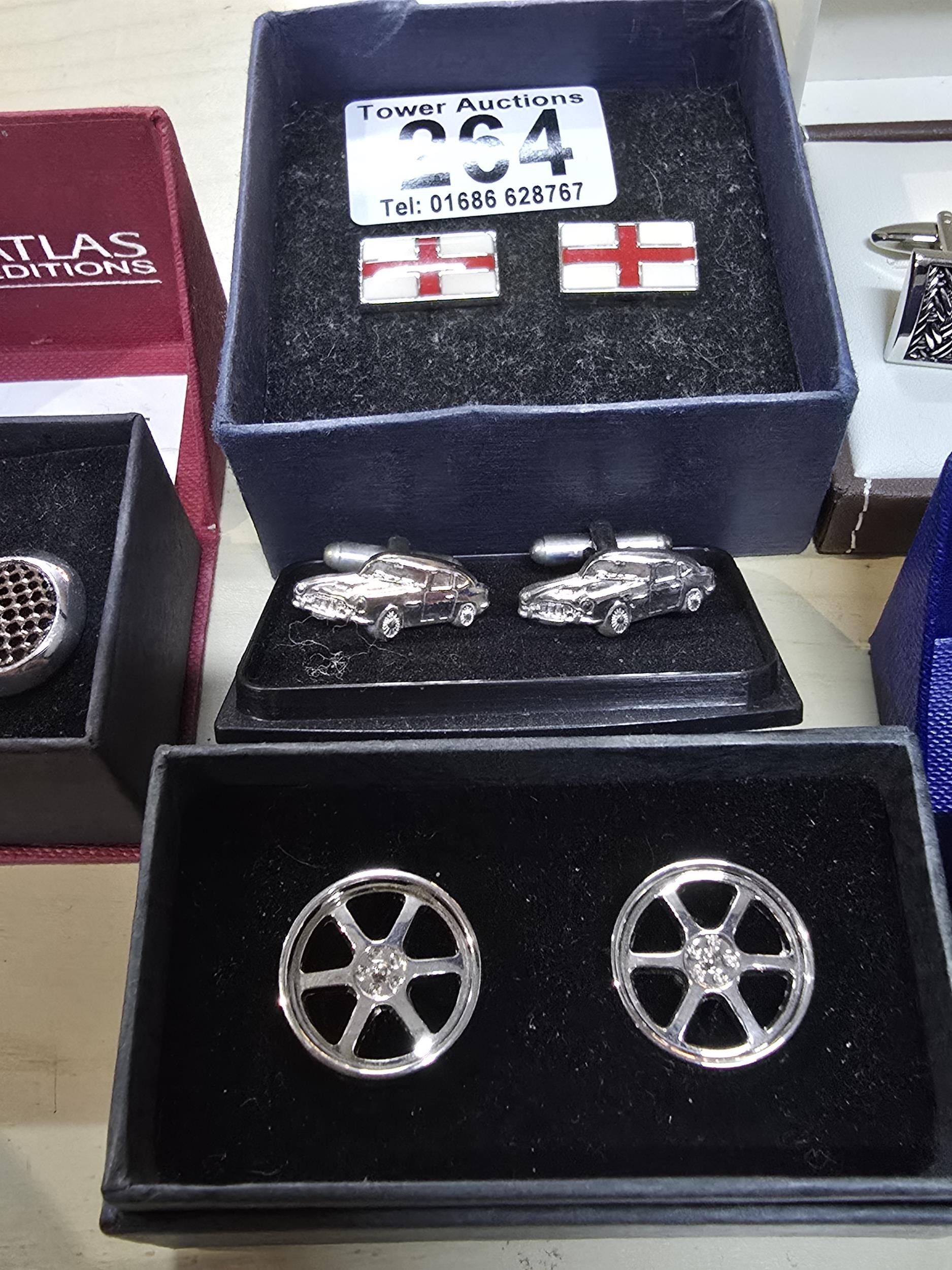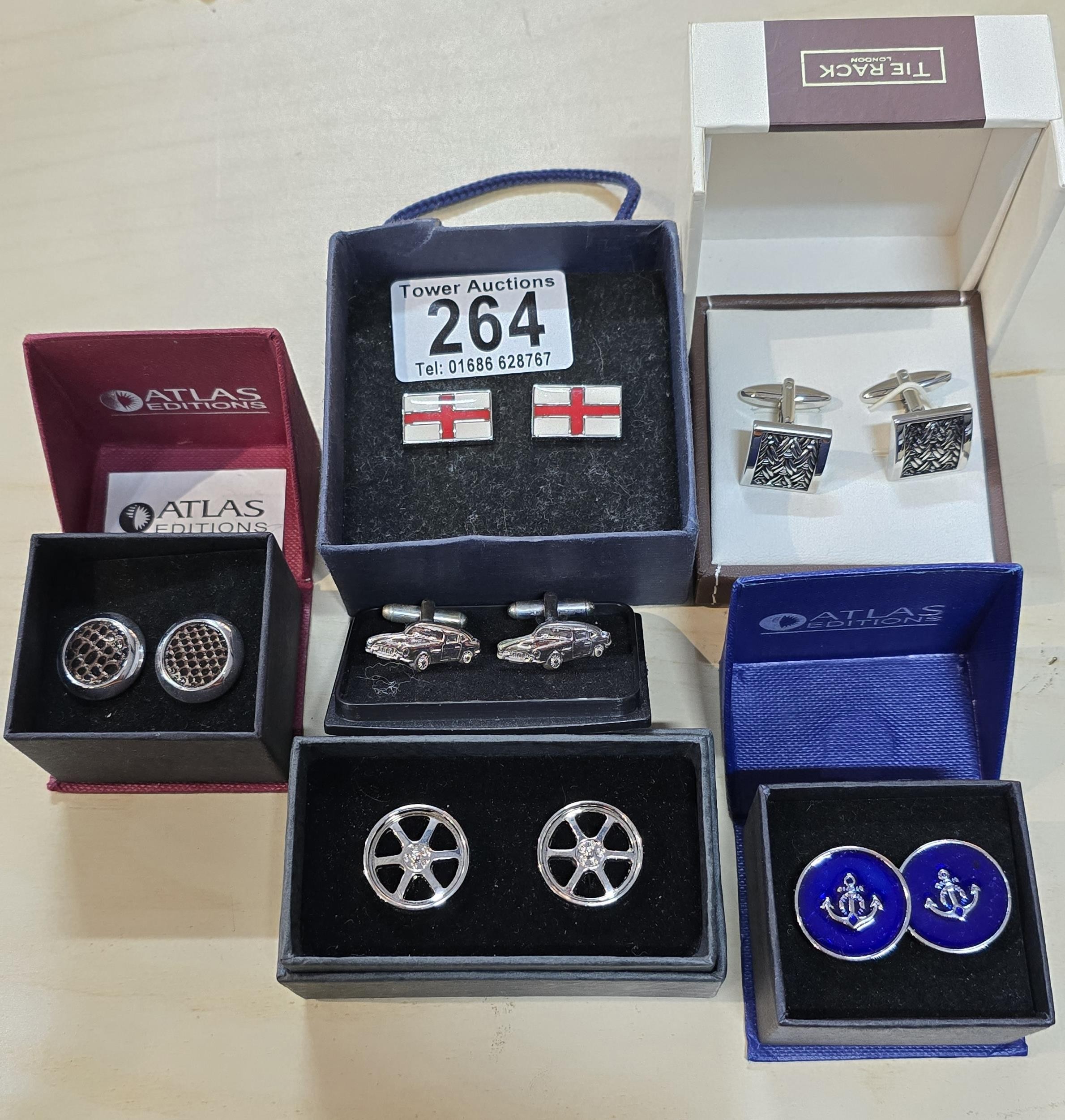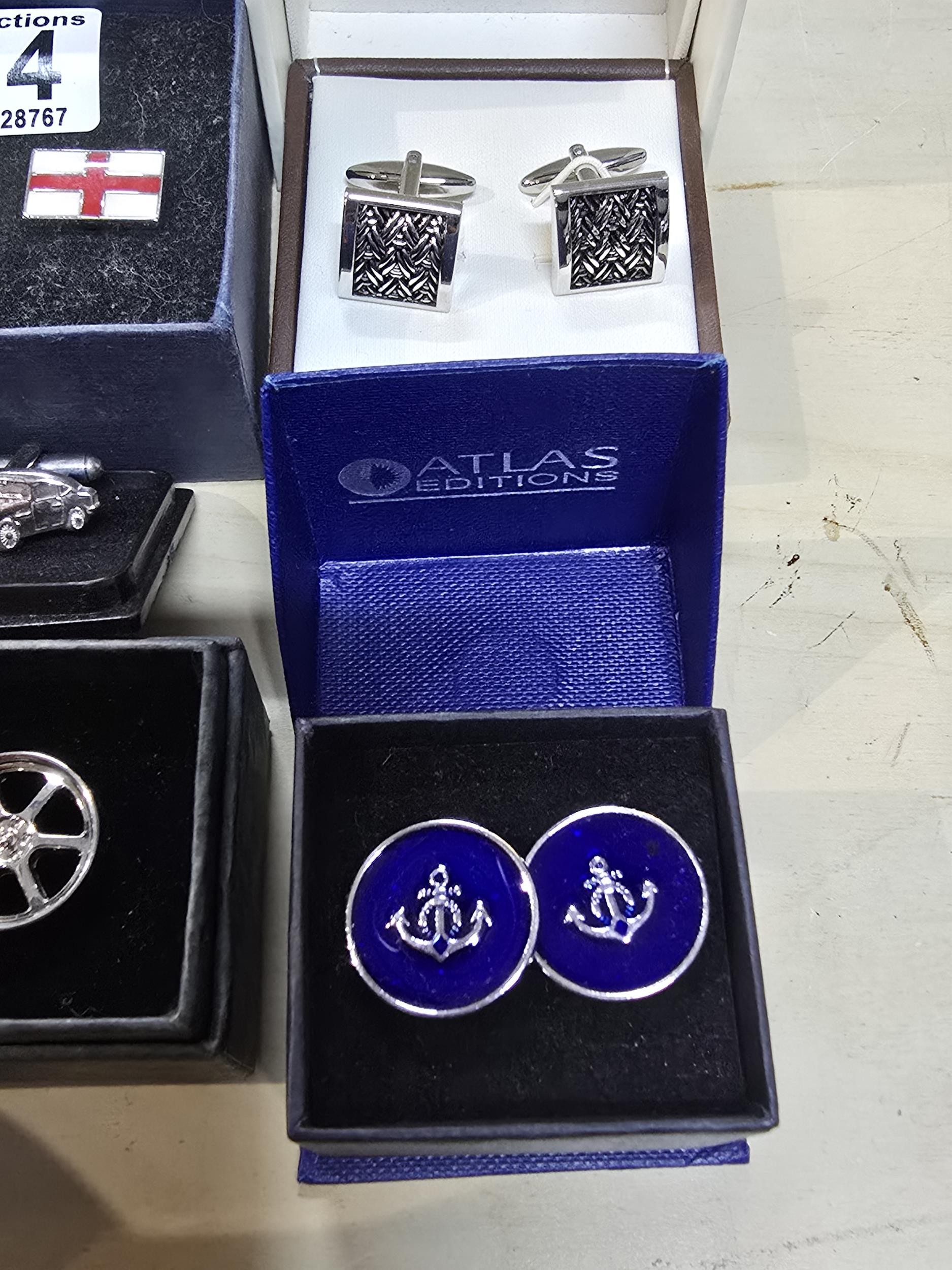 A collection of 6x as new unused pairs of cuff links to include an attractive enamelled pair of cuff links with a nautical anchor decoration by Atlas Editions, a pair of car formed cuff links, alloy wheel formed cuff links, enamelled England flag cuff links, etc. All have various brand names and are in the original boxes.