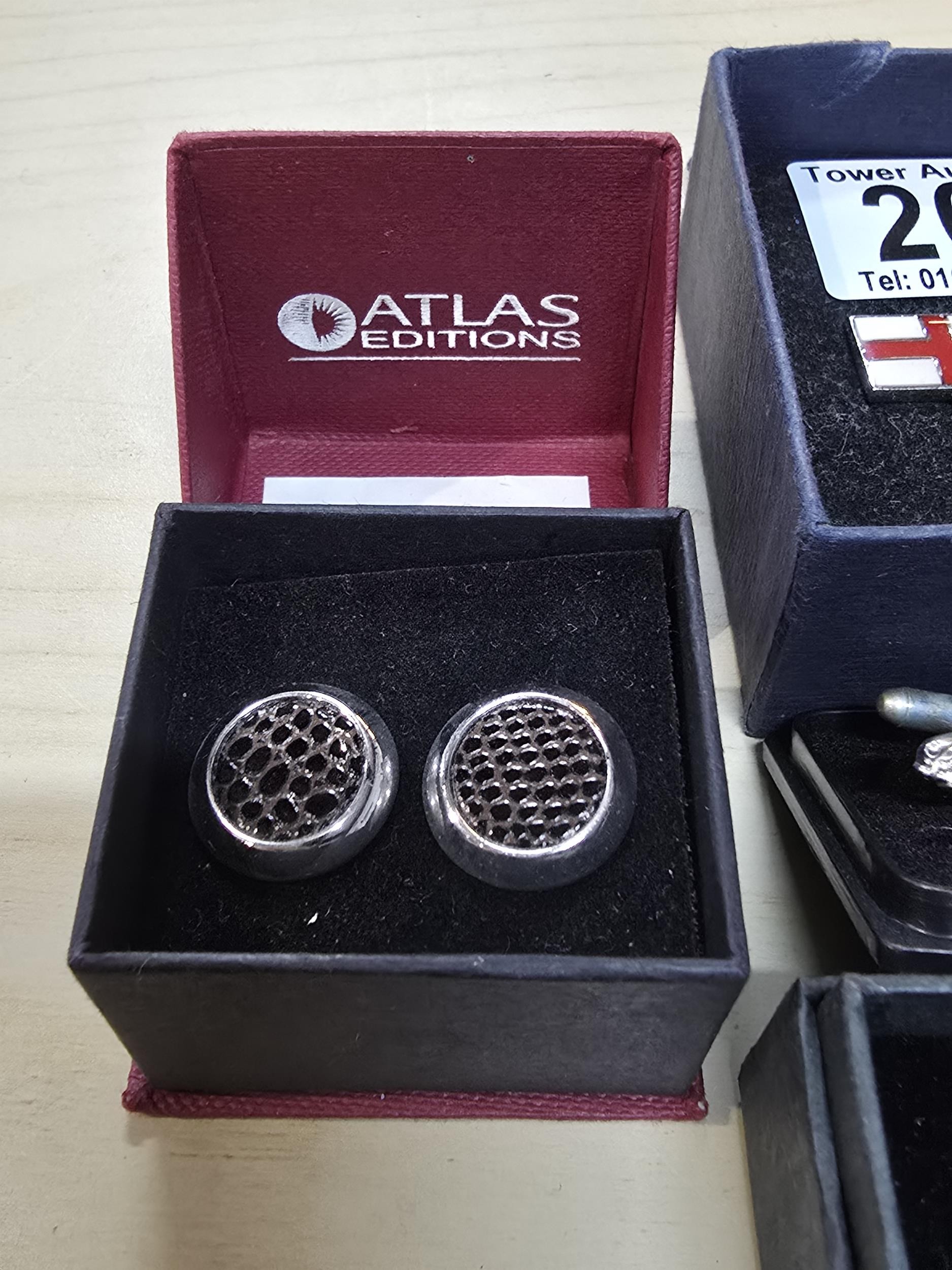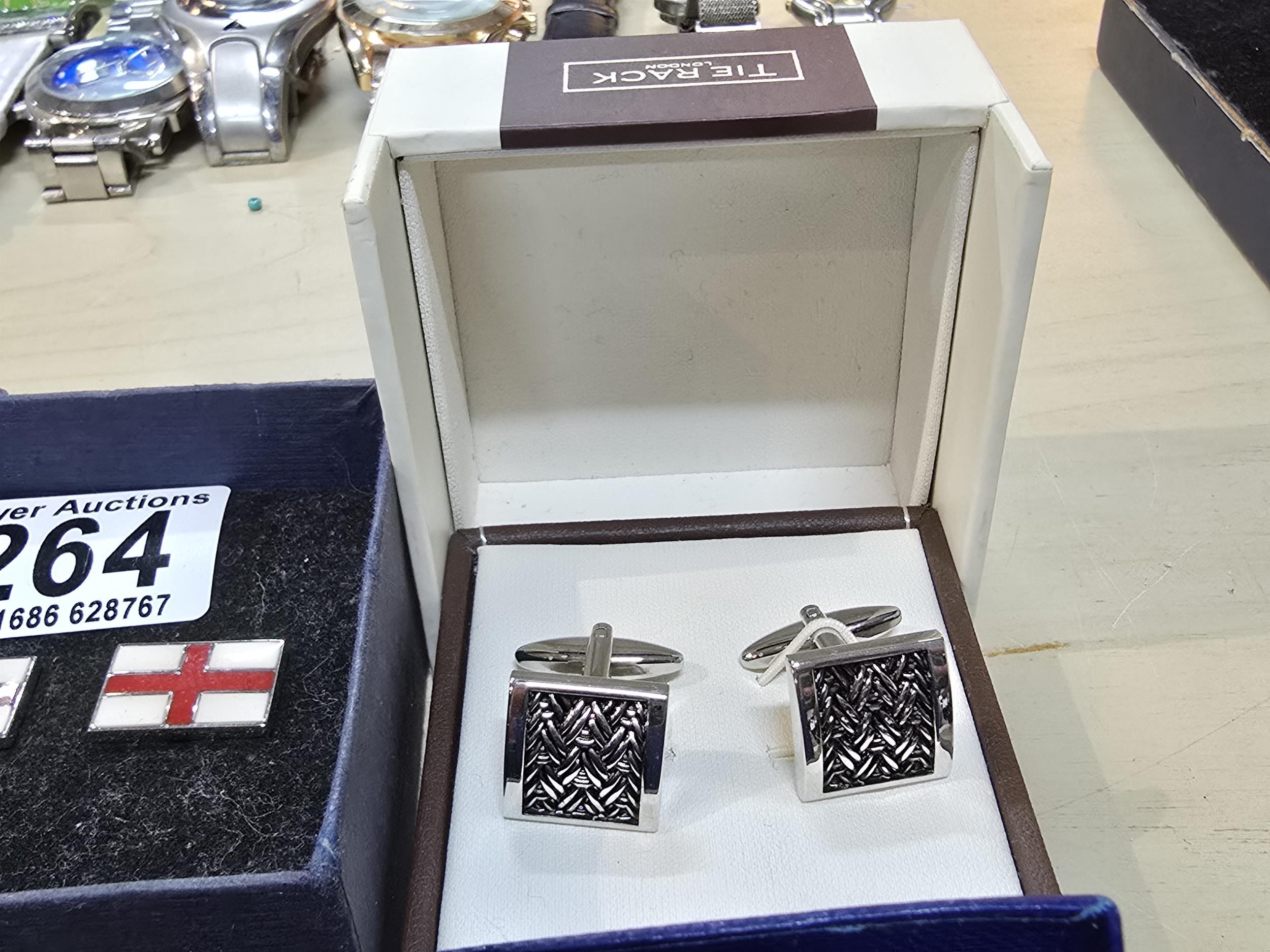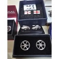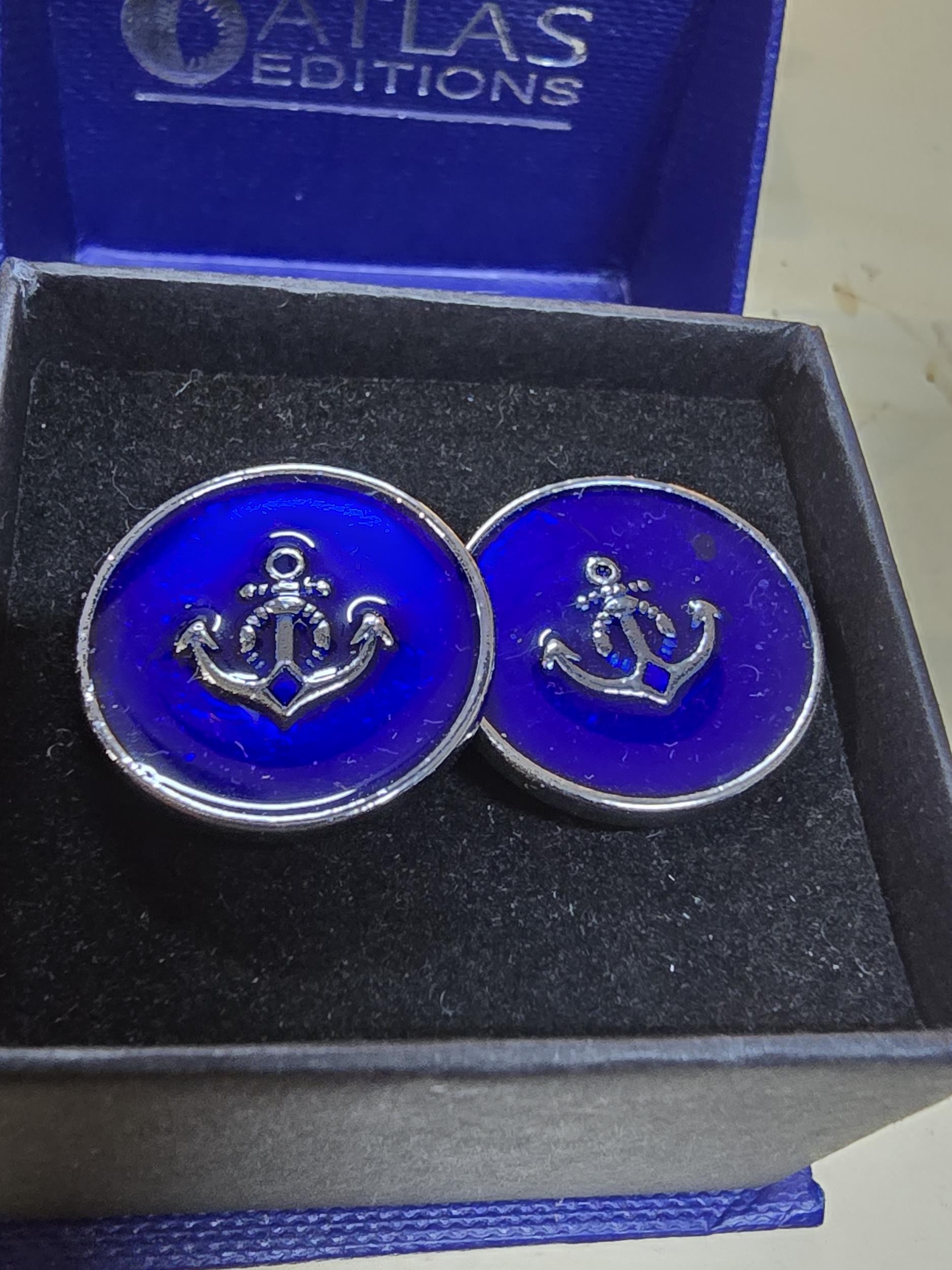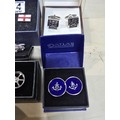 A collection of 6x as new unused pairs of cuff links to include an attractive enamelled pair of cuff links with a nautical anchor decoration by Atlas Editions, a pair of car formed cuff links, alloy wheel formed cuff links, enamelled England flag cuff links, etc. All have various brand names and are in the original boxes.