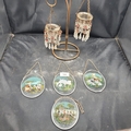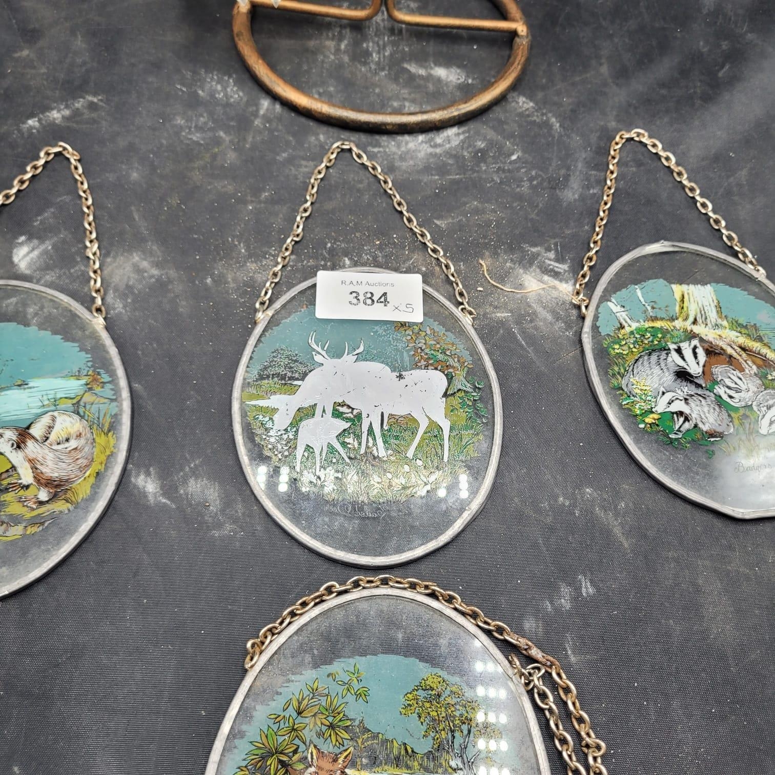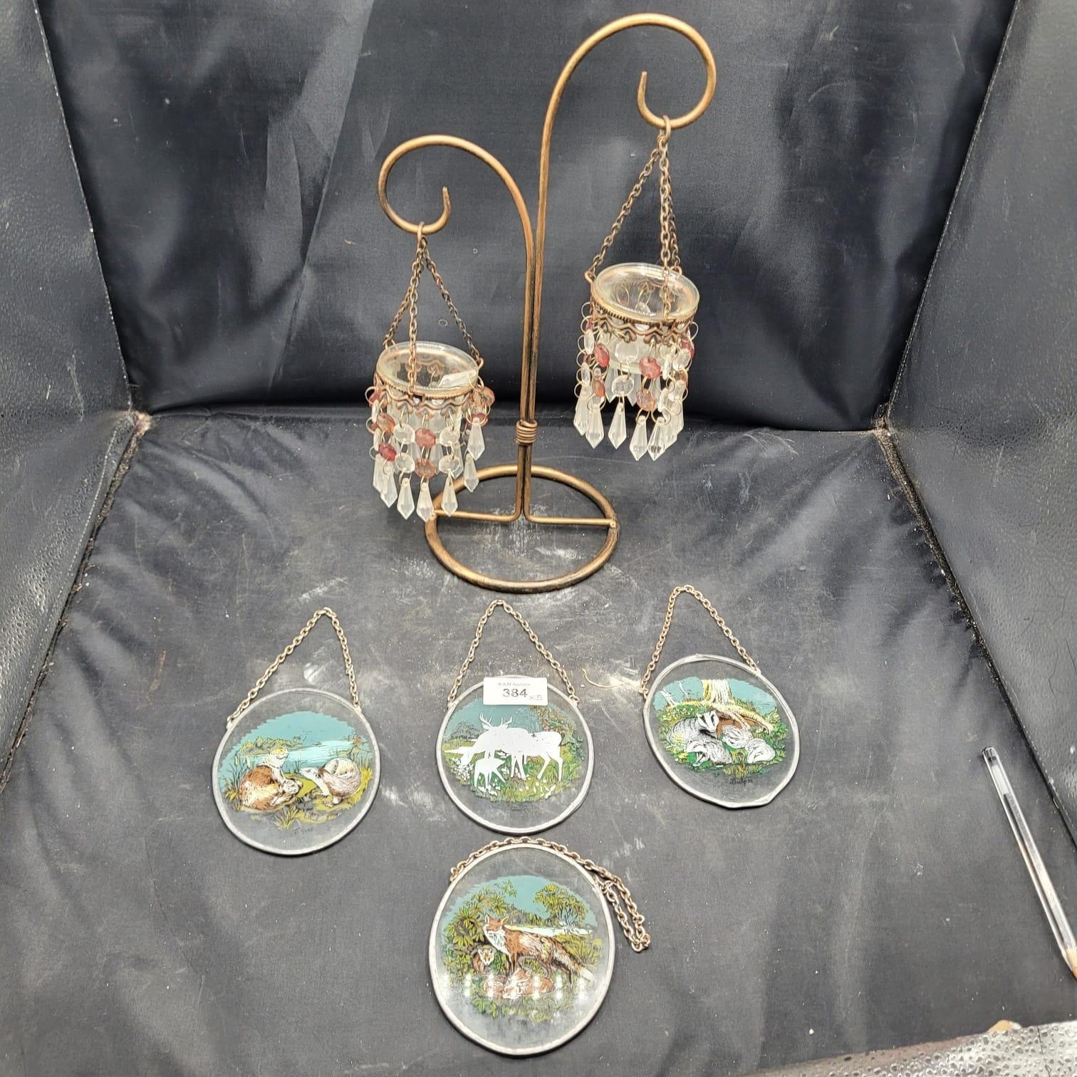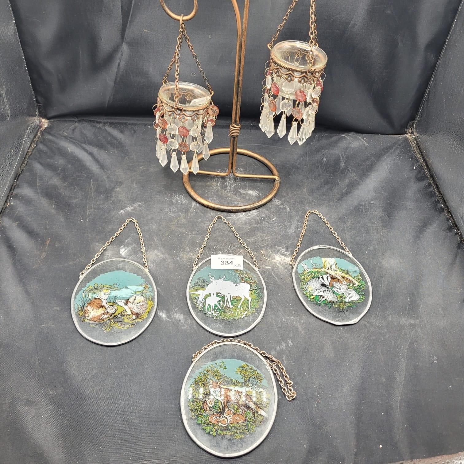 A Decorative Metal Stand with Two Chandelier-Style Ornaments and a Group of Four Reverse-Painted Glass Animal Plaques