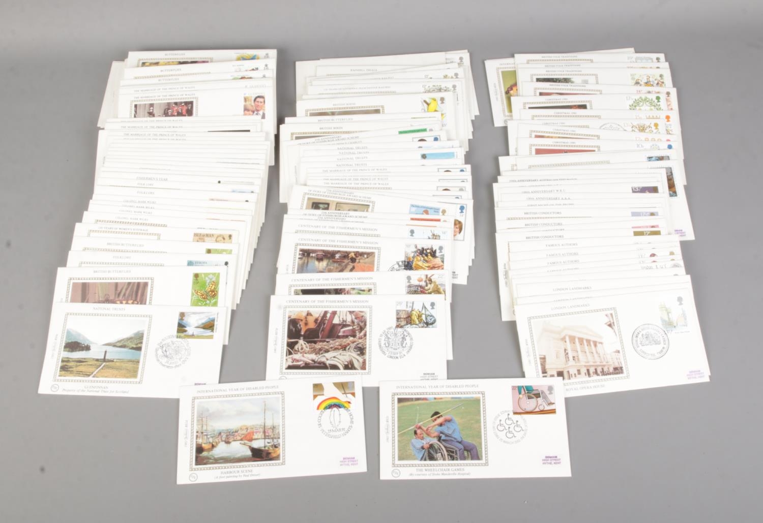 A good collection of Benham silk first day covers to include 100th Anniversary Australian Test Match, Famous Authors, London Landmarks, British Railway, etc.