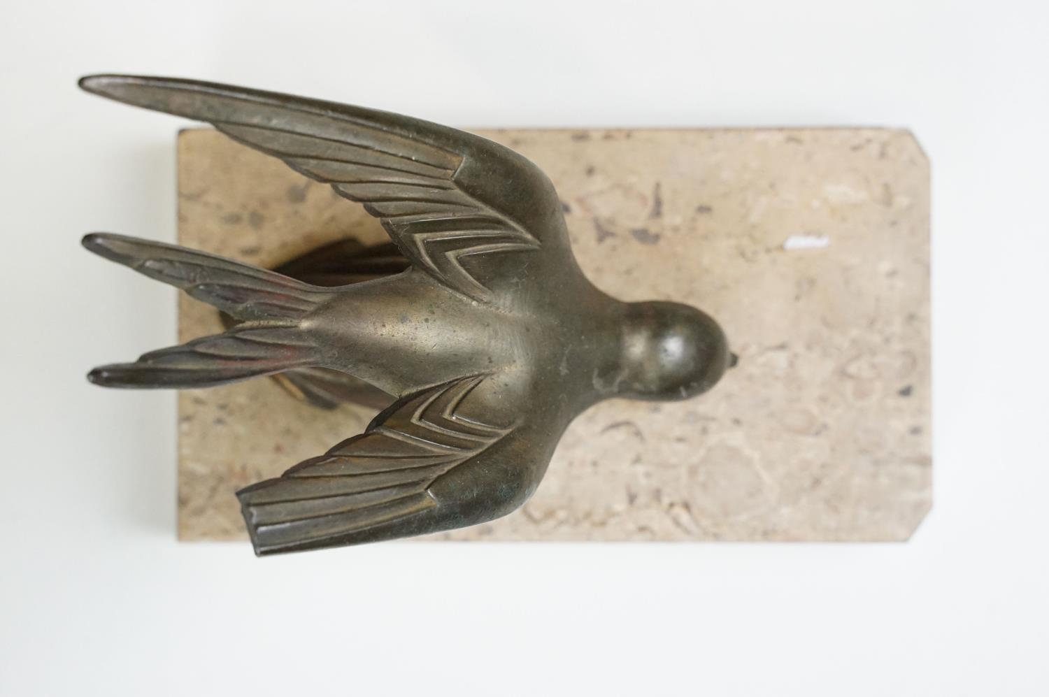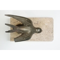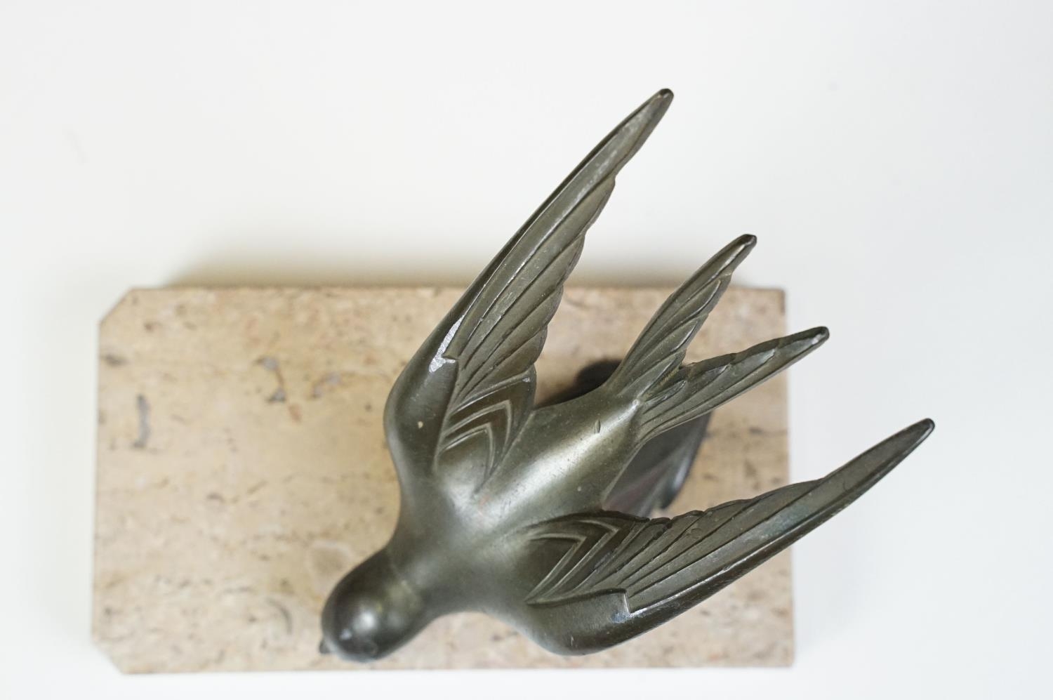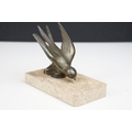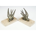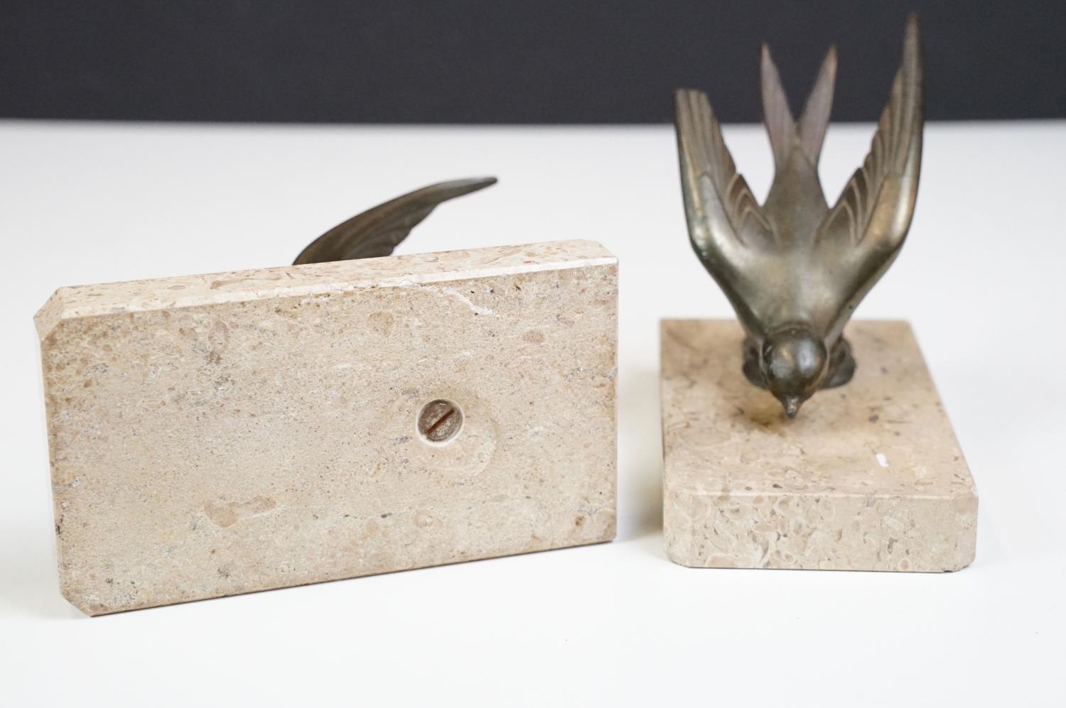 Pair of Art Deco marble bookends mounted with stylised spelter birds (one bird a/f), each 15cm long