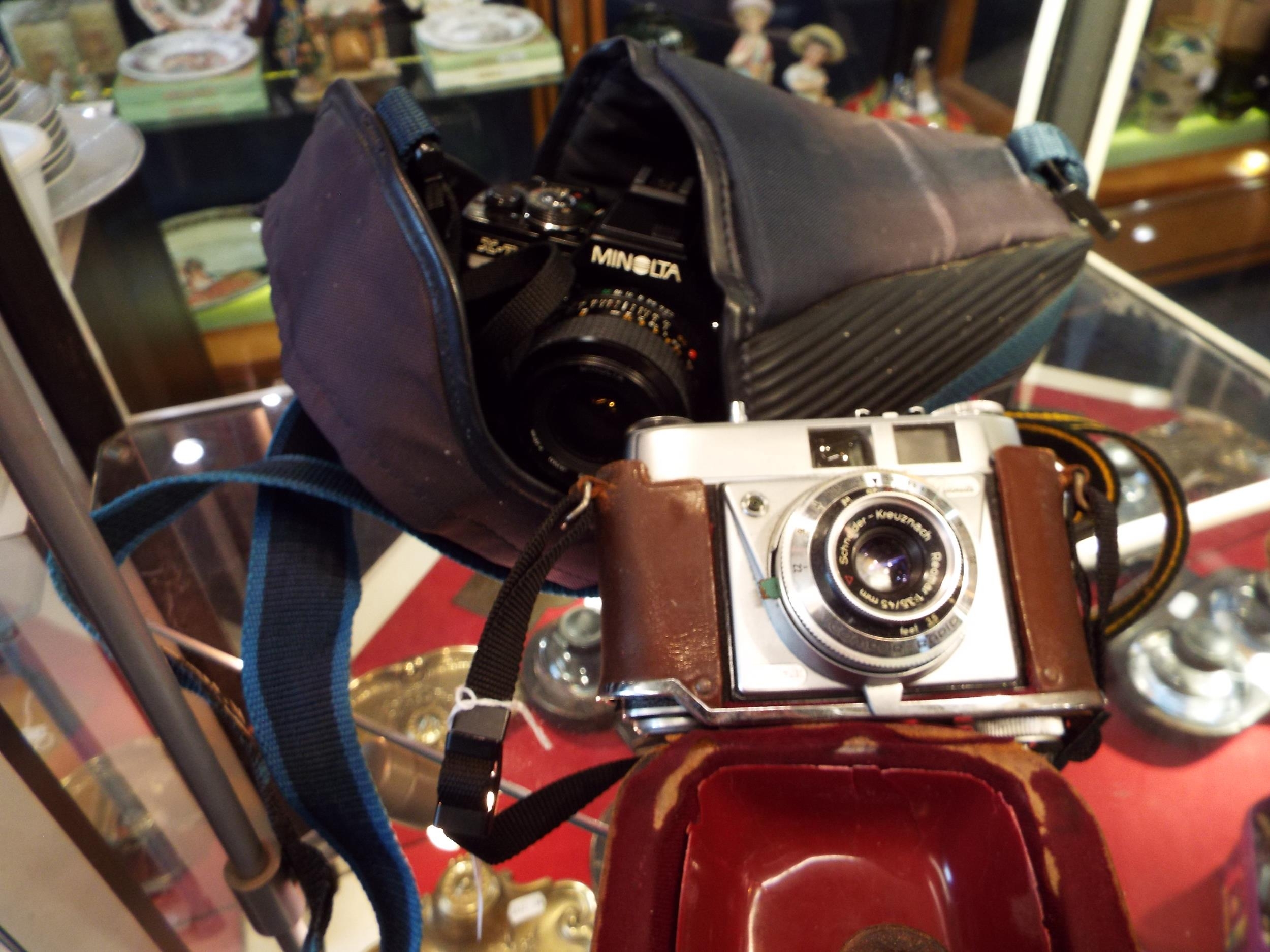 A vintage Minolta X-700 with 1:2.8 28mm lens, an MD 135mm lens and a vintage Kodak Retinette camera