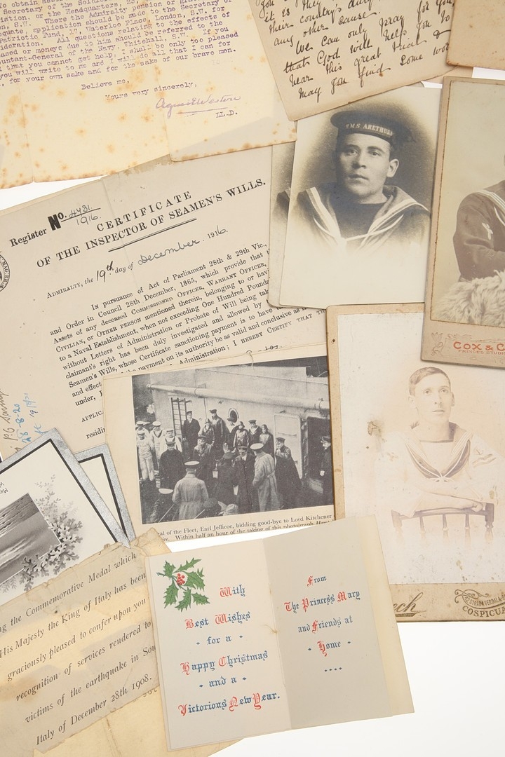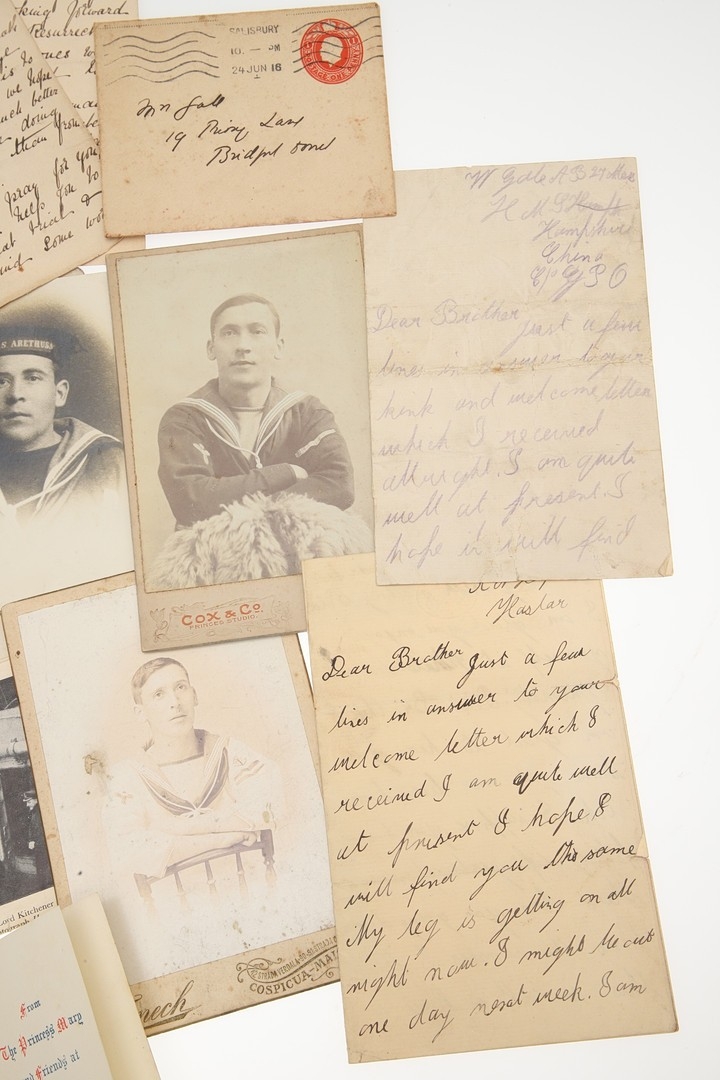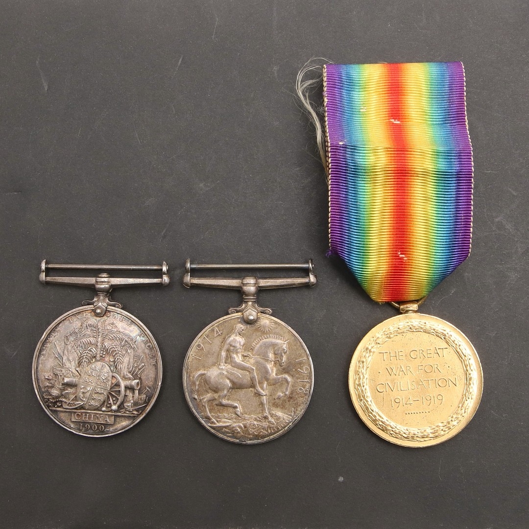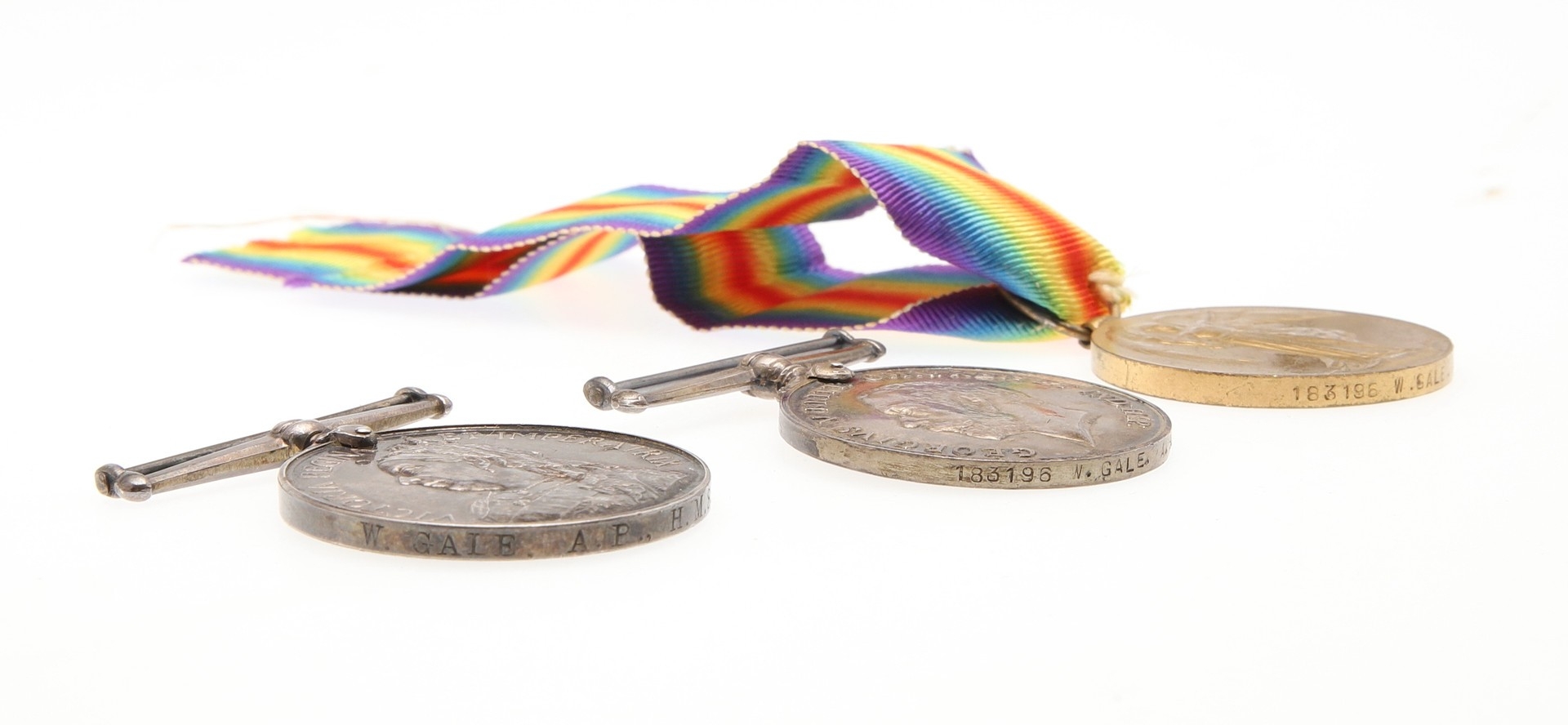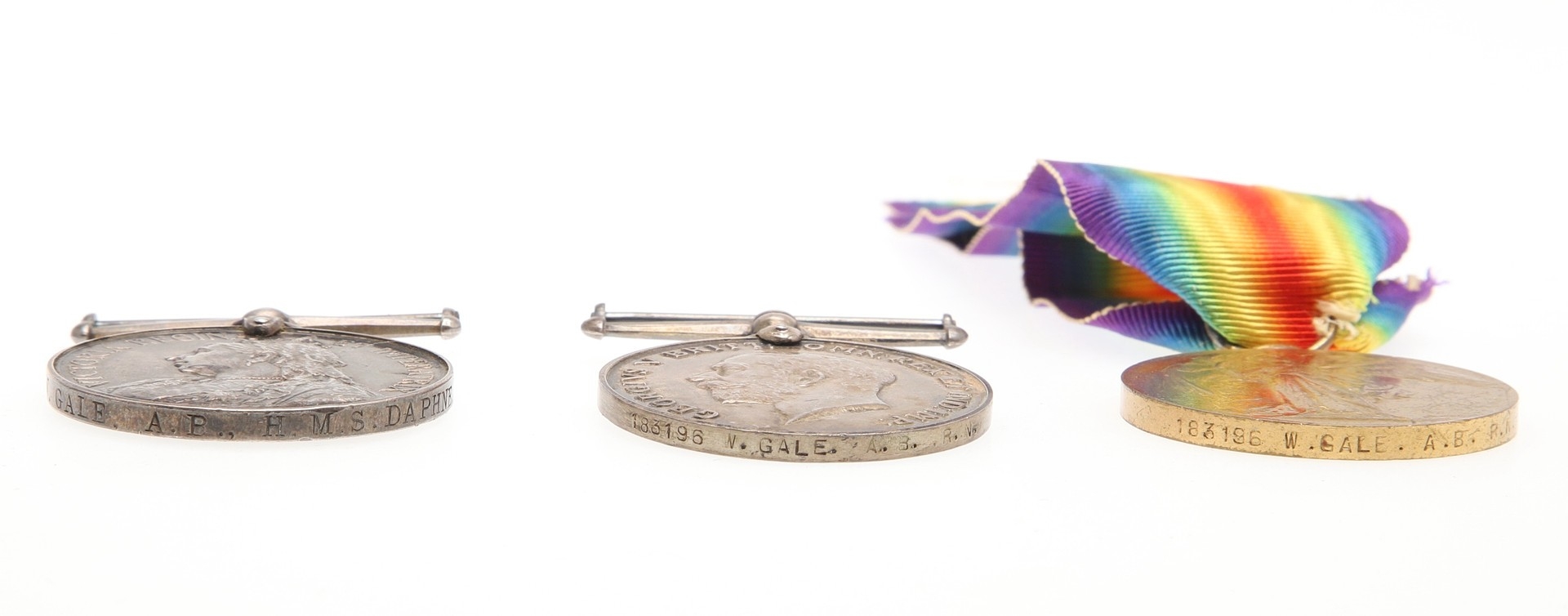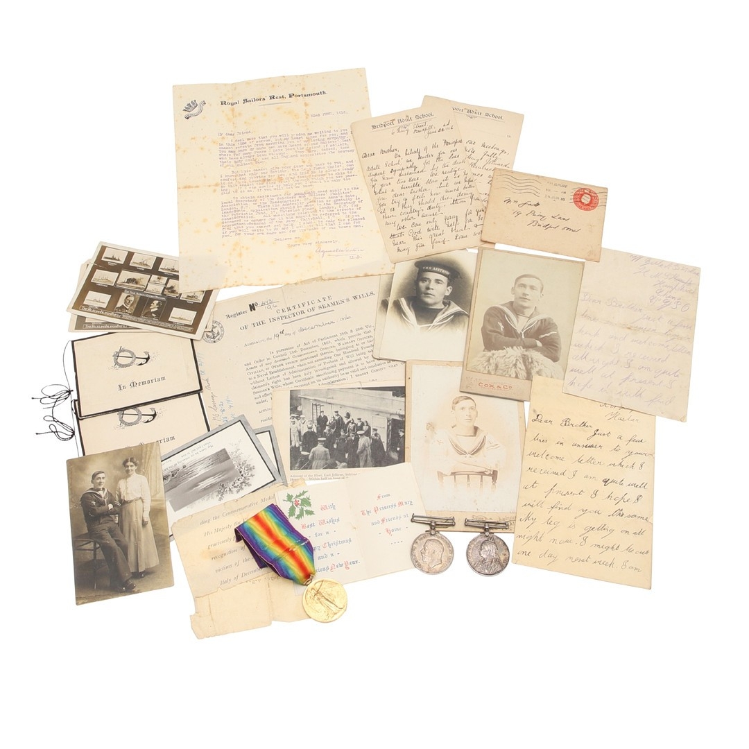 A CHINA MEDAL AND FIRST WORLD WAR PAIR TO A CASUALTY ABOARD HMS HAMPSHIRE. A group of three comprising a China War Medal 1900 named to W. Gale A.B. H.M.S. Daphne, and Great War pair comprising War medal and victory Medal named to 183196 W. Gale A.B. R.N. With a collection of documents and photographs in uniform, including a similar image of his brother, also a casualty at Jutland. William Gale was born on the 9th October 1889, the son of George (J.G.) and Kate Gale of 19 Priory Lane, Bridport. A labourer, he enlisted at Portsmouth on the 9th October 1897 for twelve years. His service record confirms his posting to HMS Daphne between 10th October 1900 and December 1901. He was also entitled to a Messina Earthquake (Commemorative) Medal, 1908, at which time he was serving aboard HMS Excellent. He died on the 5th June 1916, a week after the Battle of Jutland, when serving aboard HMS Hampshire which was sunk by a mine off Northern Scotland. He is commemorated on the Naval Memorial in Portsmouth. At the time she was taking Lord Kitchener to Russia, there were only 12 survivors from the crew of 655. William was the oldest of seven, his brother Charles Albert Gale, born in 1881, died at the battle of Jutland aboard HMS Invincible on the 31st May 1916 when she was sunk with all but six of her 1032 strong crew. He is also recorded on the Plymouth memorial. He was married to Minnie Gale of 12 South Mill Lane Bridport. With Photographs of both brothers in uniform, In Memoriam cards, Certificate from the inspector of Wills, remains of award letter for the 1908 medal, postcards and letters.