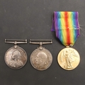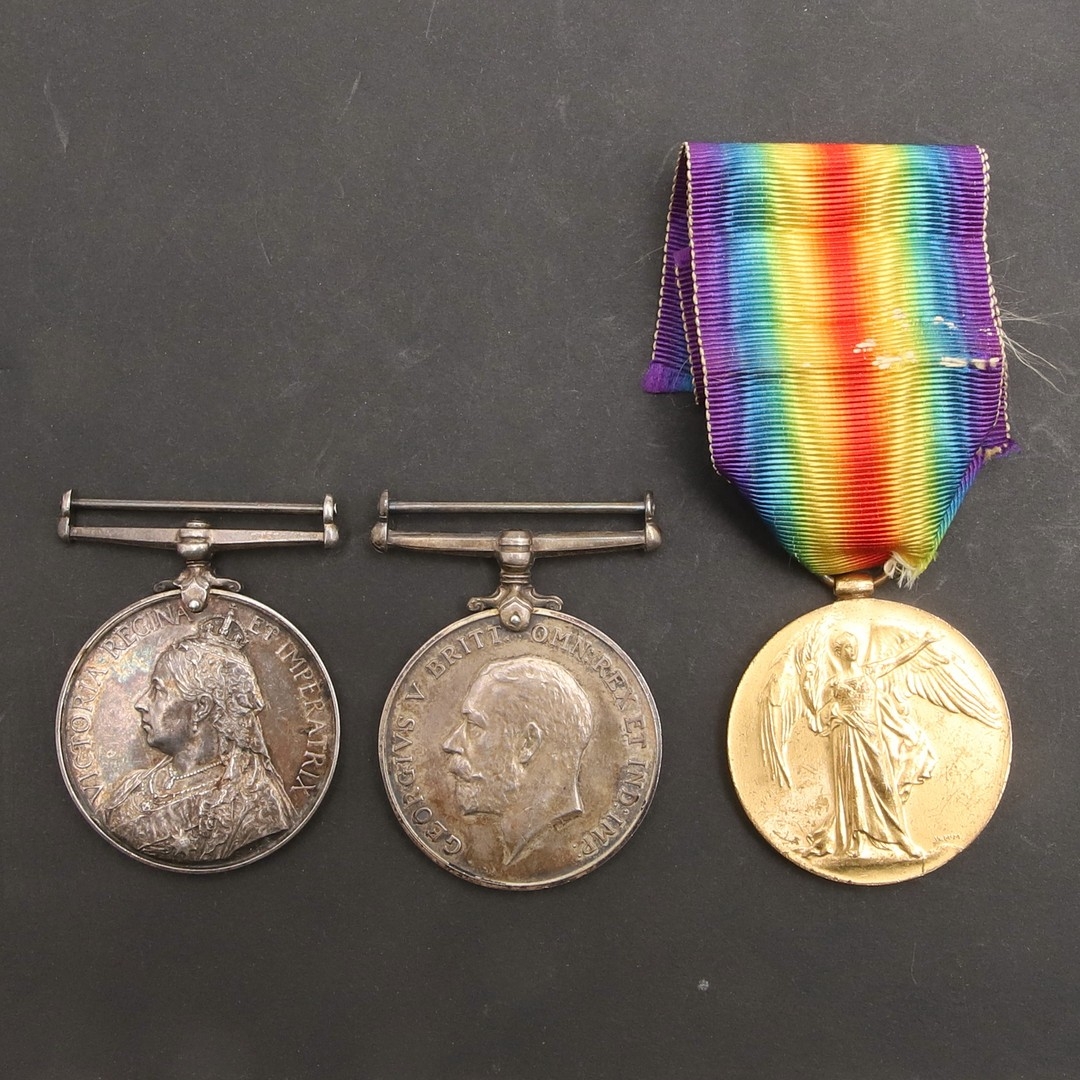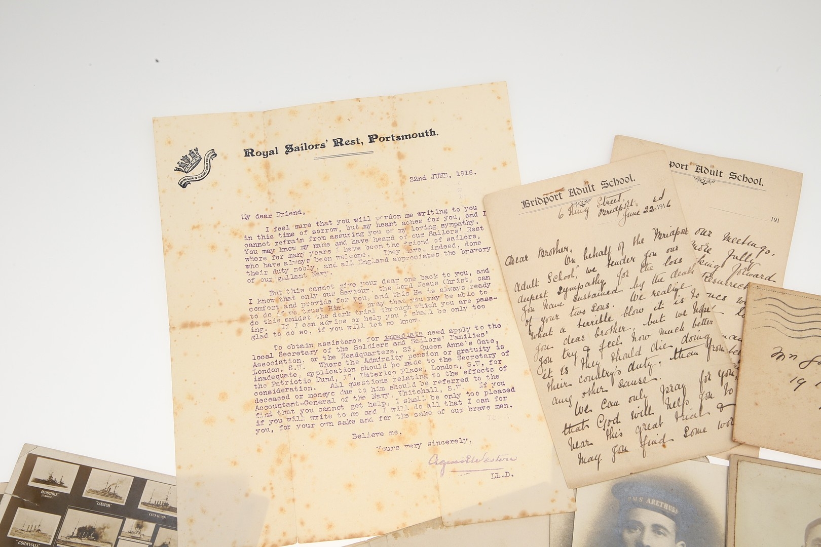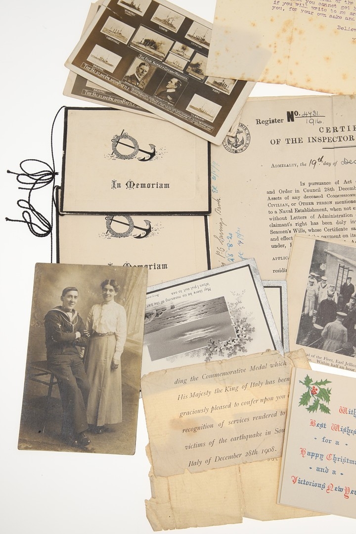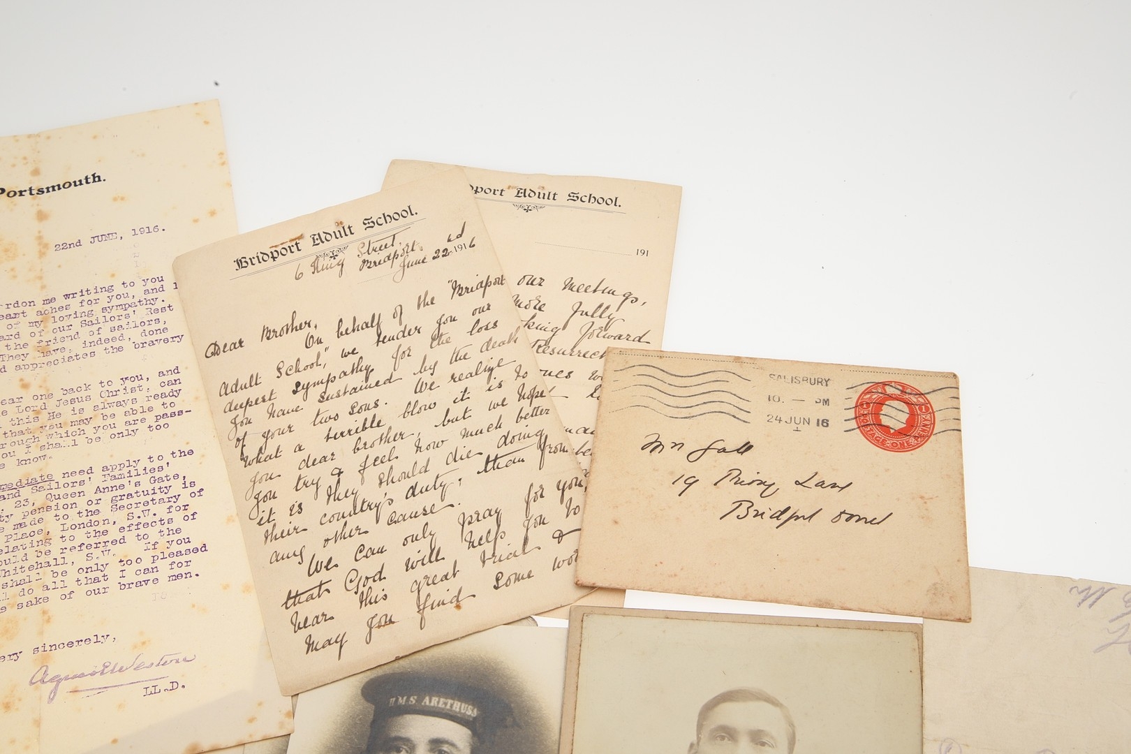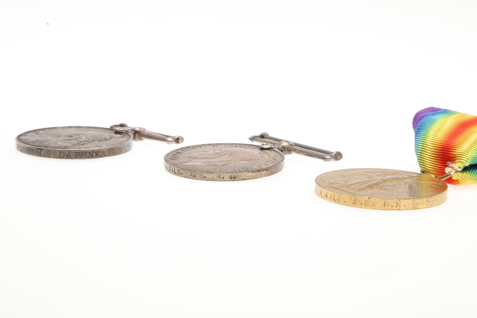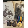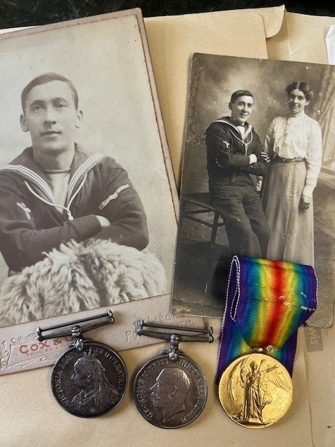 A CHINA MEDAL AND FIRST WORLD WAR PAIR TO A CASUALTY ABOARD HMS HAMPSHIRE. A group of three comprising a China War Medal 1900 named to W. Gale A.B. H.M.S. Daphne, and Great War pair comprising War medal and victory Medal named to 183196 W. Gale A.B. R.N. With a collection of documents and photographs in uniform, including a similar image of his brother, also a casualty at Jutland. William Gale was born on the 9th October 1889, the son of George (J.G.) and Kate Gale of 19 Priory Lane, Bridport. A labourer, he enlisted at Portsmouth on the 9th October 1897 for twelve years. His service record confirms his posting to HMS Daphne between 10th October 1900 and December 1901. He was also entitled to a Messina Earthquake (Commemorative) Medal, 1908, at which time he was serving aboard HMS Excellent. He died on the 5th June 1916, a week after the Battle of Jutland, when serving aboard HMS Hampshire which was sunk by a mine off Northern Scotland. He is commemorated on the Naval Memorial in Portsmouth. At the time she was taking Lord Kitchener to Russia, there were only 12 survivors from the crew of 655. William was the oldest of seven, his brother Charles Albert Gale, born in 1881, died at the battle of Jutland aboard HMS Invincible on the 31st May 1916 when she was sunk with all but six of her 1032 strong crew. He is also recorded on the Plymouth memorial. He was married to Minnie Gale of 12 South Mill Lane Bridport. With Photographs of both brothers in uniform, In Memoriam cards, Certificate from the inspector of Wills, remains of award letter for the 1908 medal, postcards and letters.