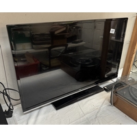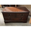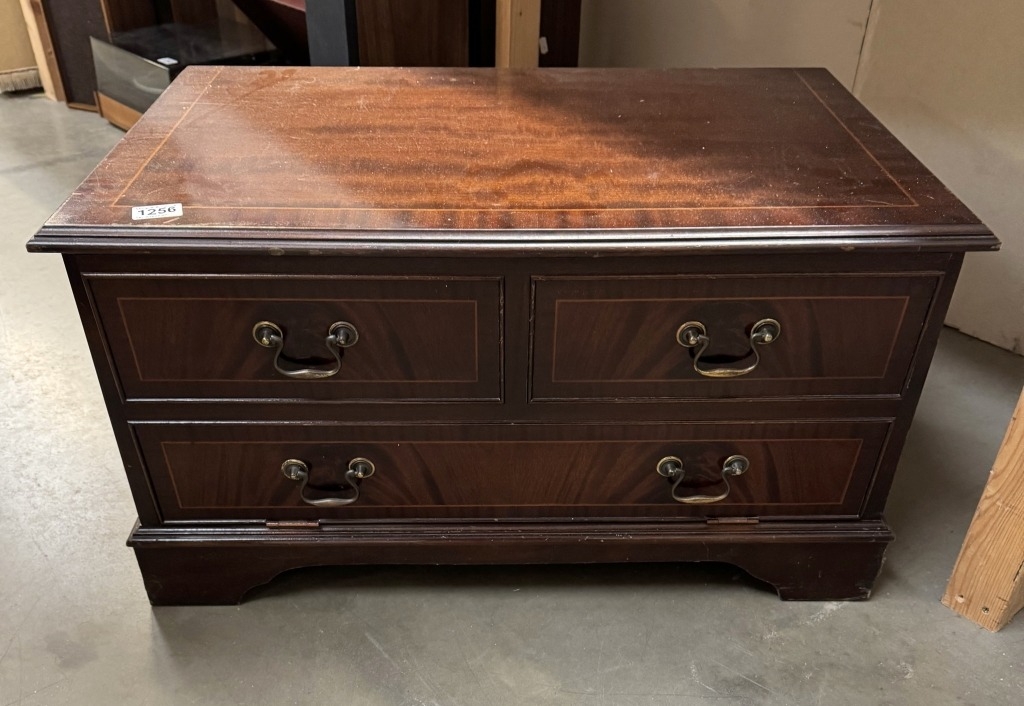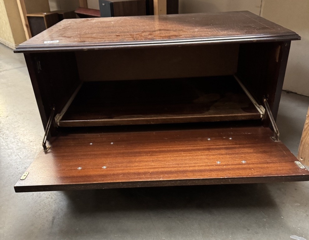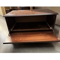 A dark wood stained TV video stand with false drawer drop down front