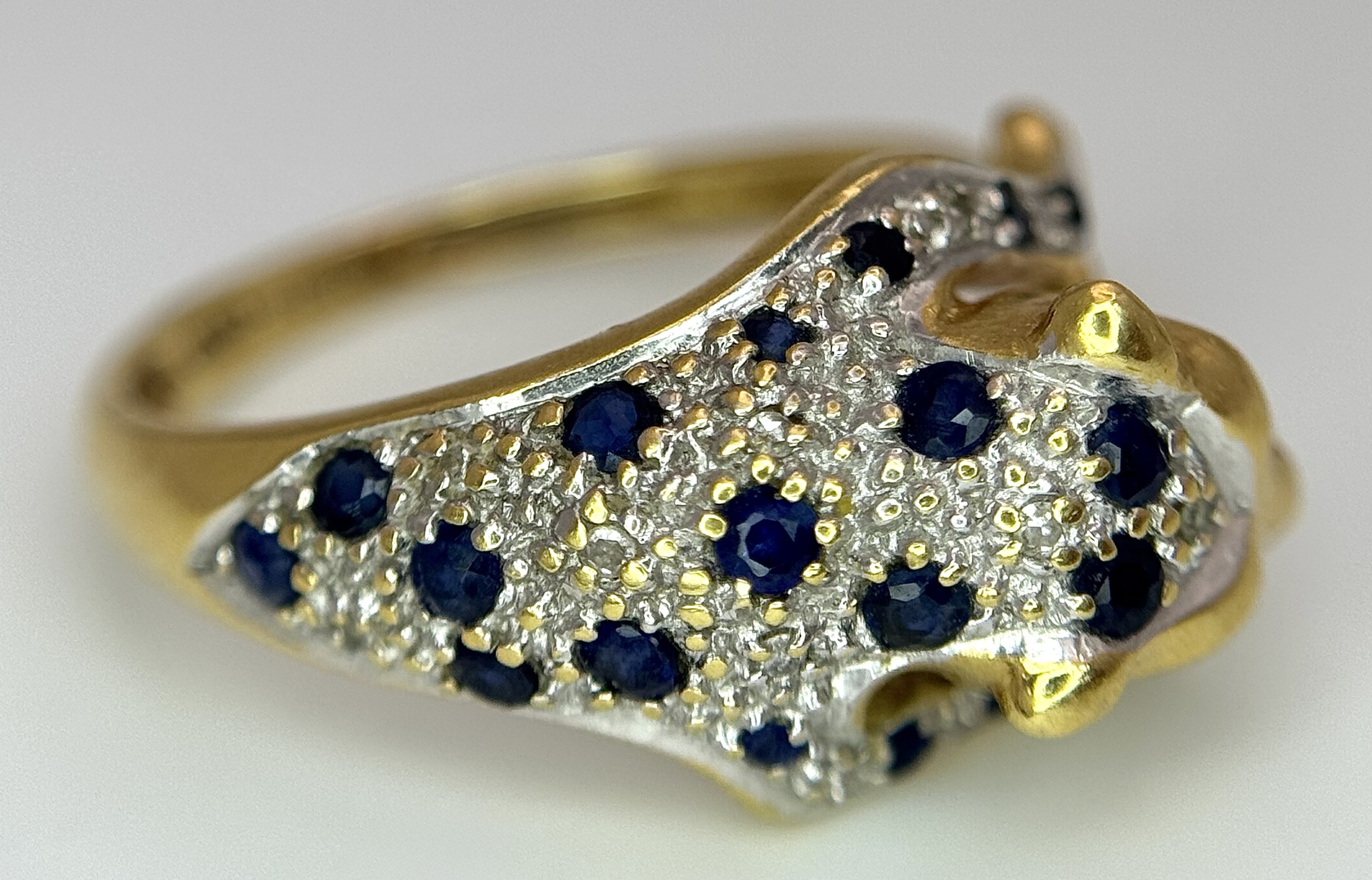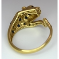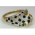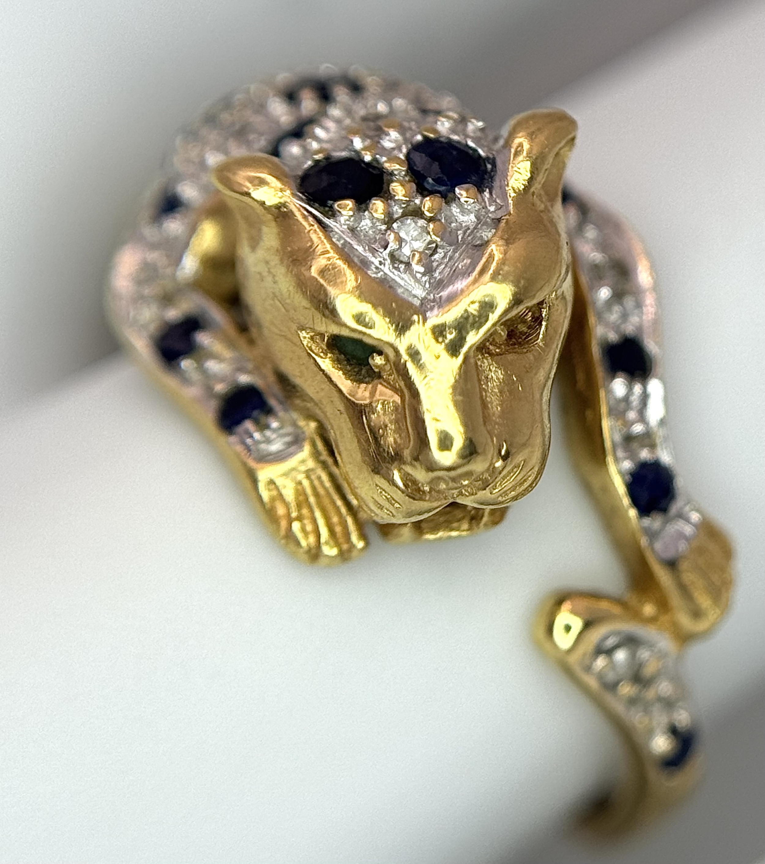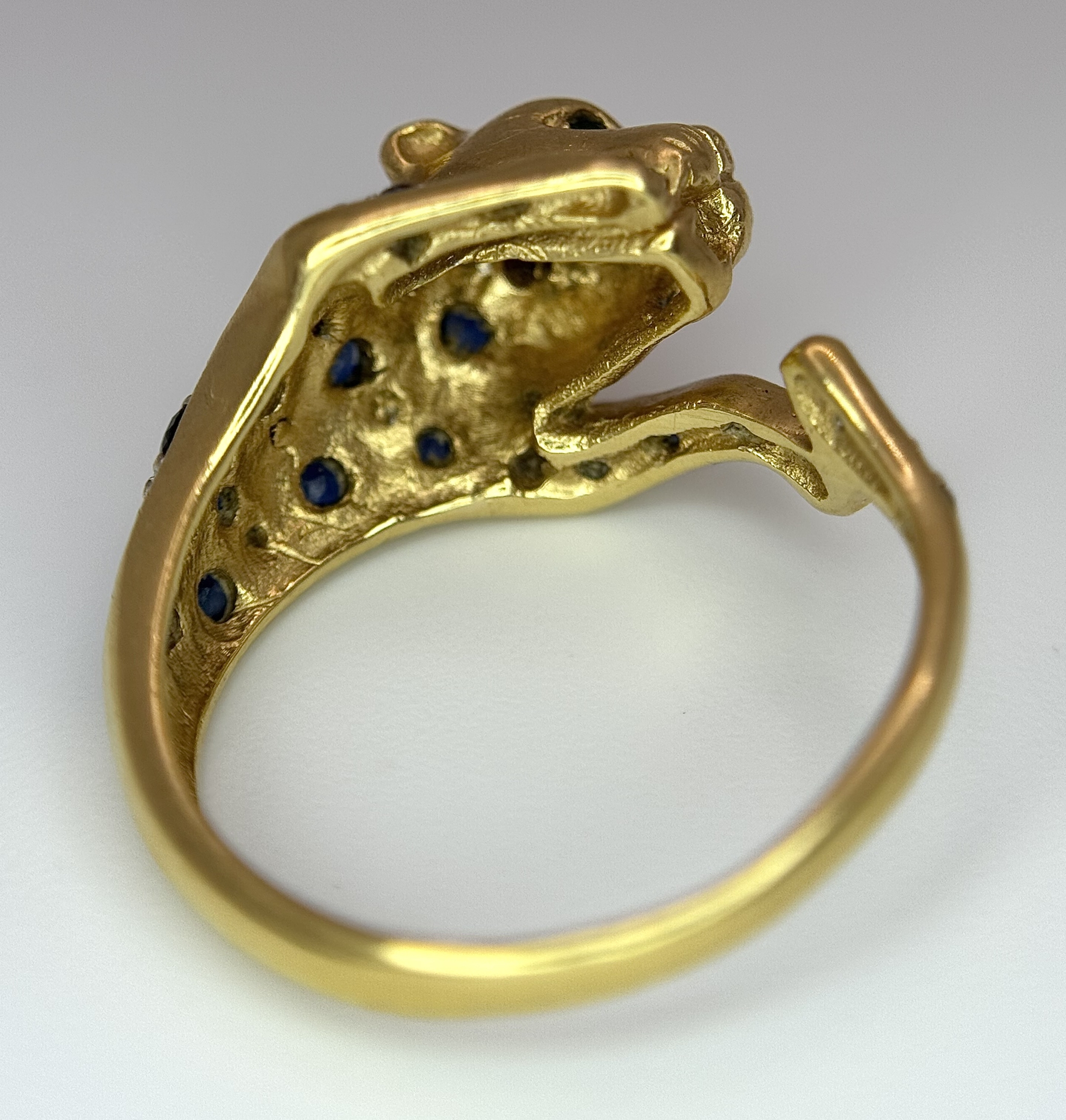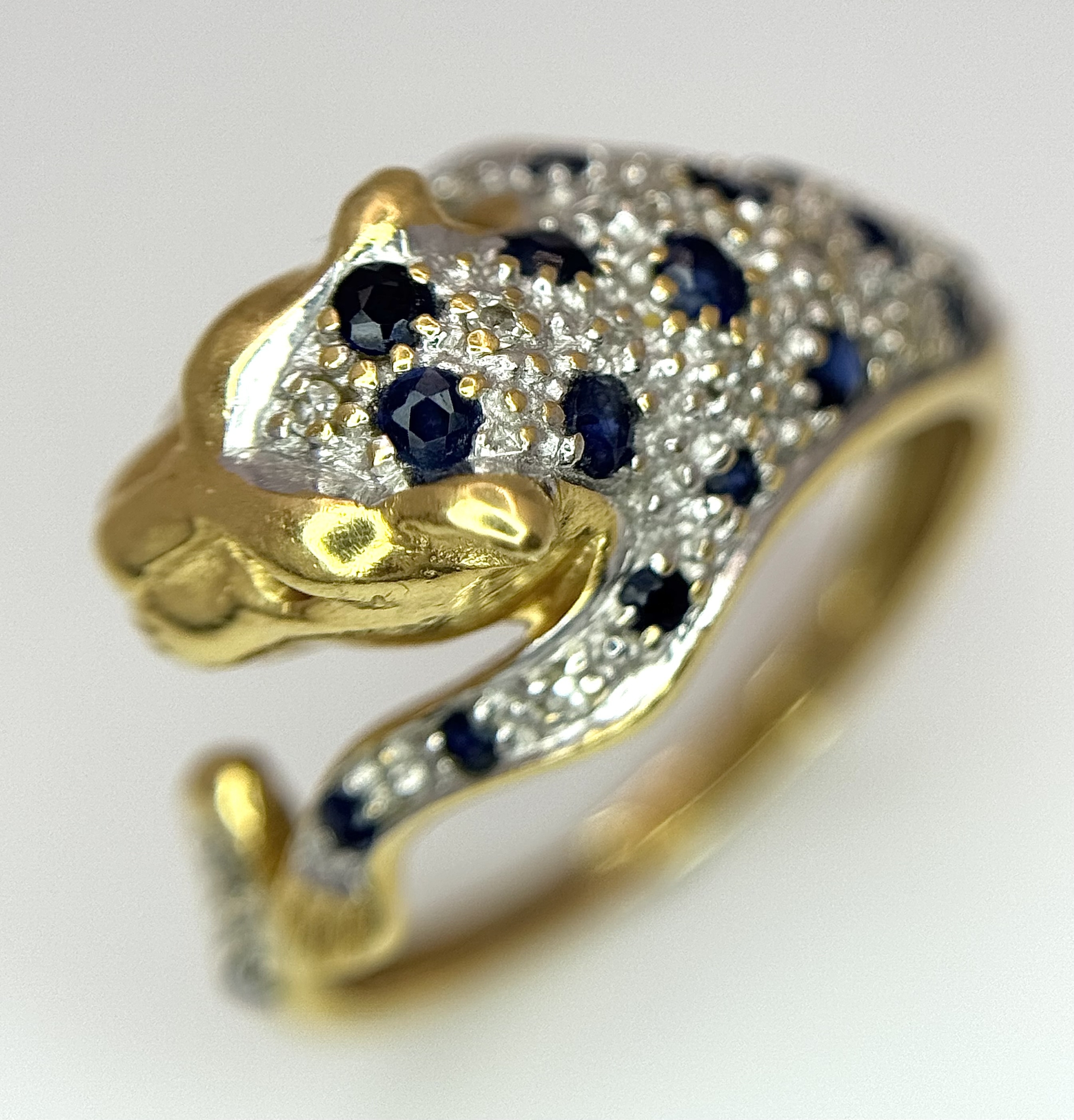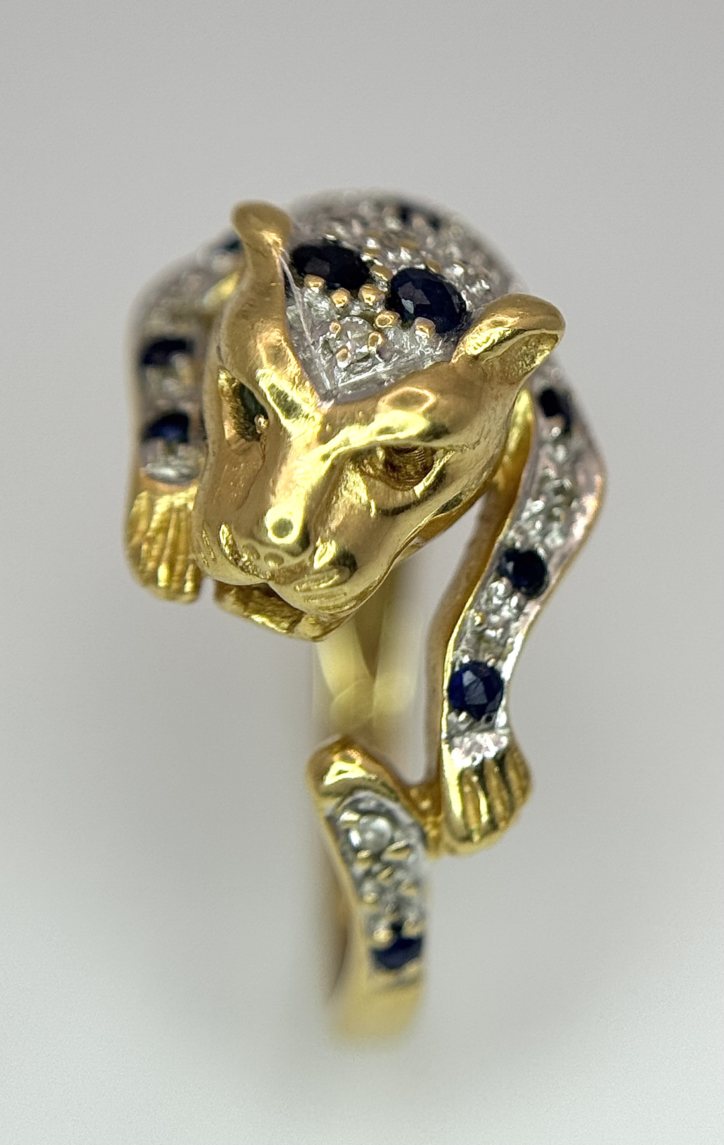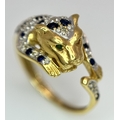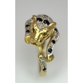 An 18K YELLOW GOLD DIAMOND AND SAPPHIRE SET PANTHER RING. ONE STONE MISSING. 4.6G SIZE L. Ref: 9983