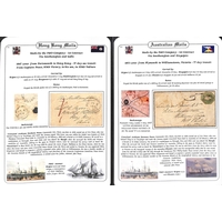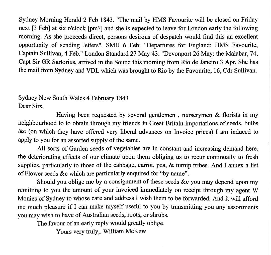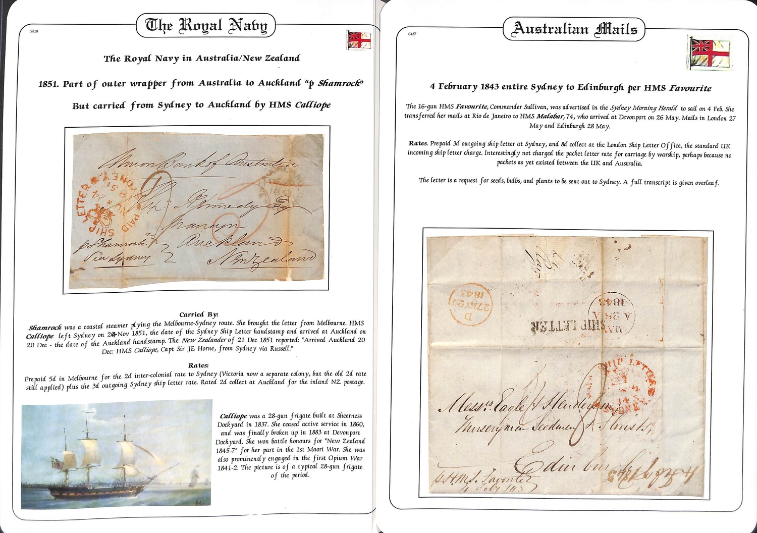 Australasia. 1843 (Feb 4) Entire letter from W. McKew in Sydney ordering seeds and bulbs, to Eagle & Henderson, nurserymen, seedsmen and florists in Edinburgh, endorsed "p. H.M.S Favorite" with red "PAID SHIP LETTER / SYDNEY" datestamp and black "SHIP LETTER", carried to Rio de Janeiro where the mails were transferred to H.M.S "Malabar". Also an 1851 front from Melbourne to Auckland "p. Shamrock to Sydney" then carried on H.M.S "Calliope", Sydney Ship Letter and Auckland datestamps, faults. (2).
