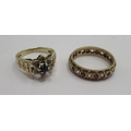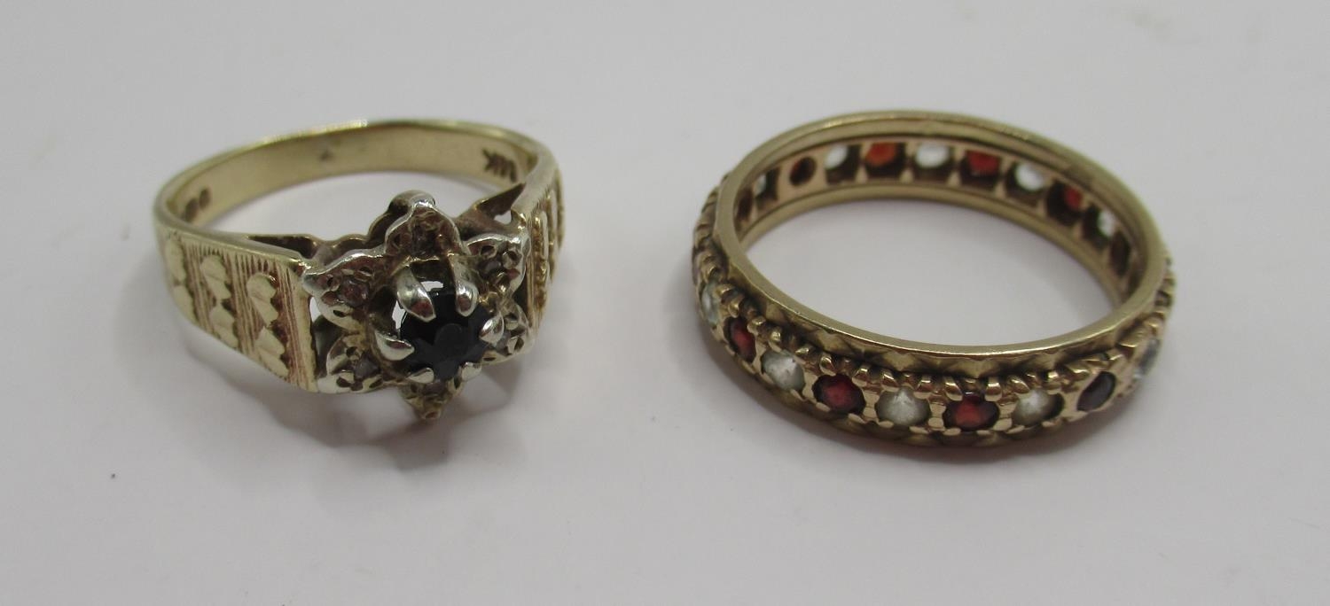 9ct yellow gold cluster ring set with central sapphire, size O, and a 9ct gold eternity ring set with clear and red stones (some missing stones), size P, both stamped 375, 6.71g