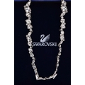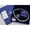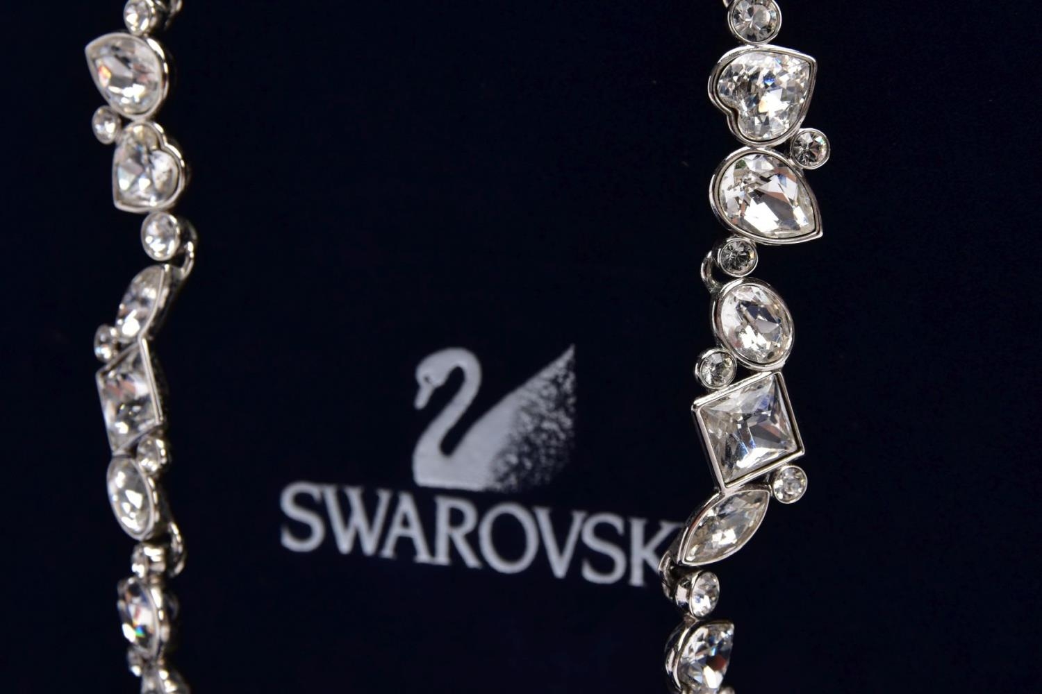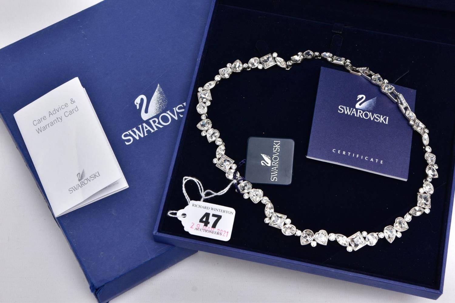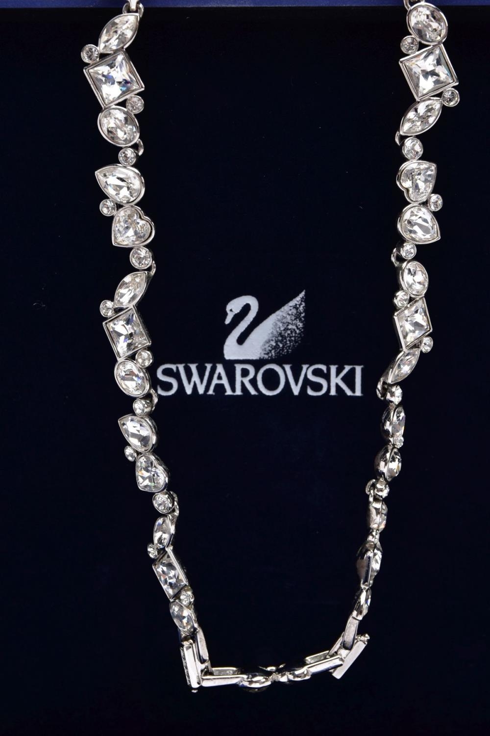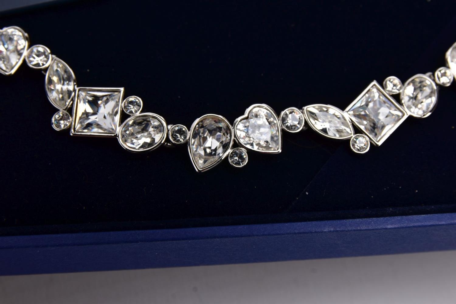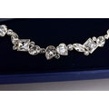 A WHITE METAL SWAROVSKI CRYSTAL NECKLACE, of an articulated design set with various cut colourless crystals, such as heart, pear, square marquise, oval, etc, fitted with two fold over clasps, signed 'swarovski', length 450mm, together with box (Condition:- overall condition good, general light wear, clasps in working condition)