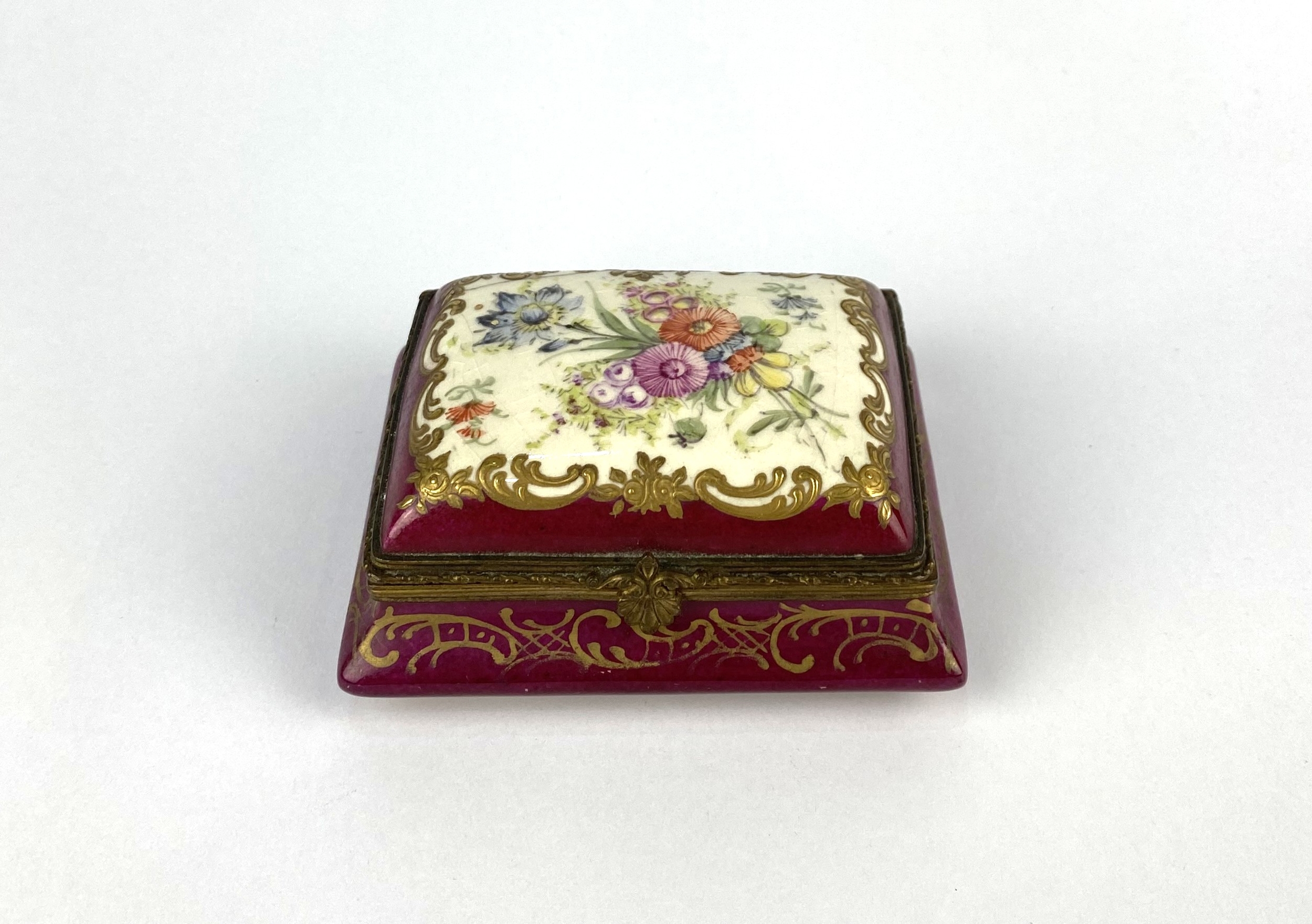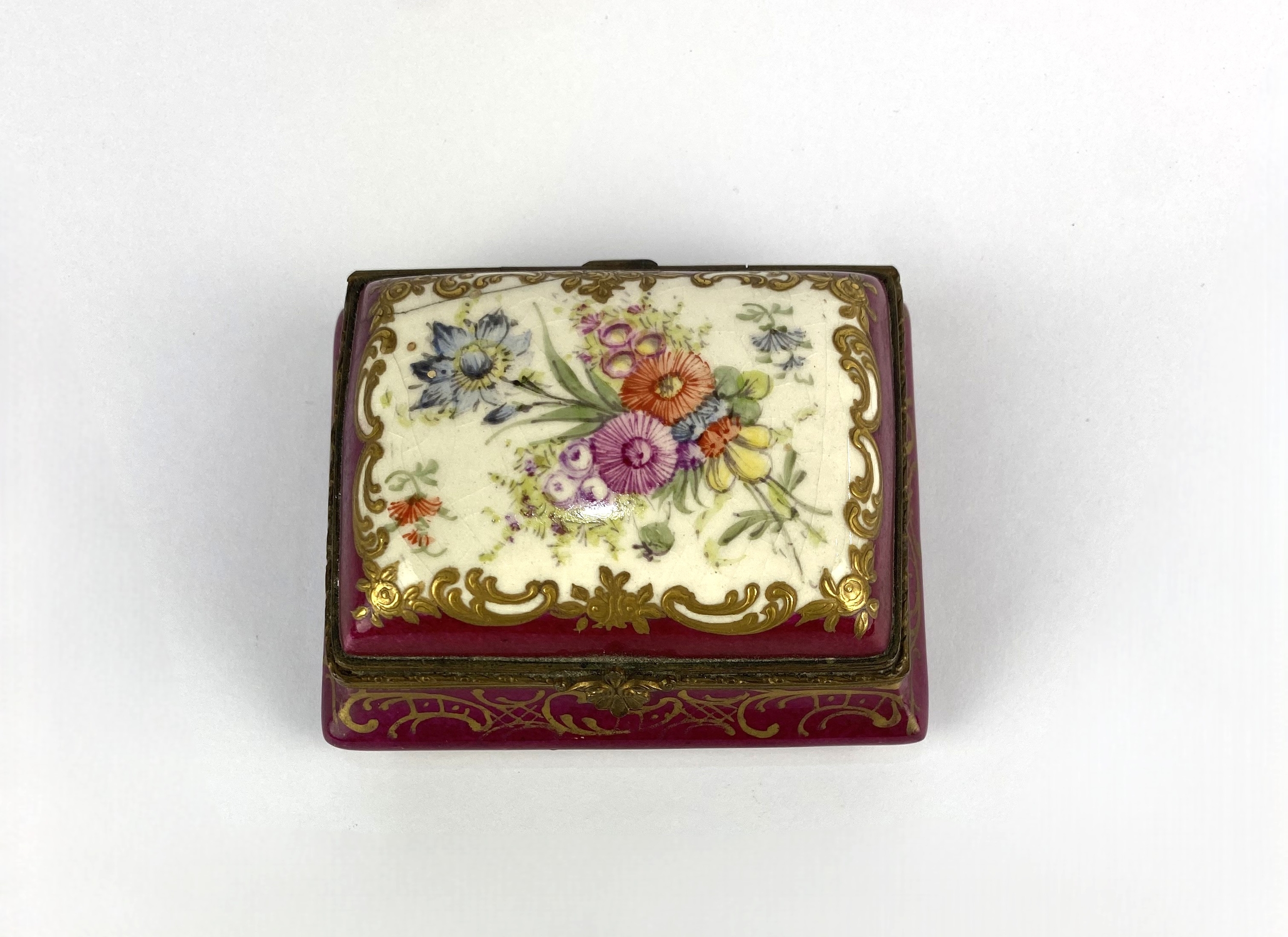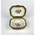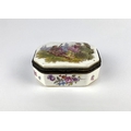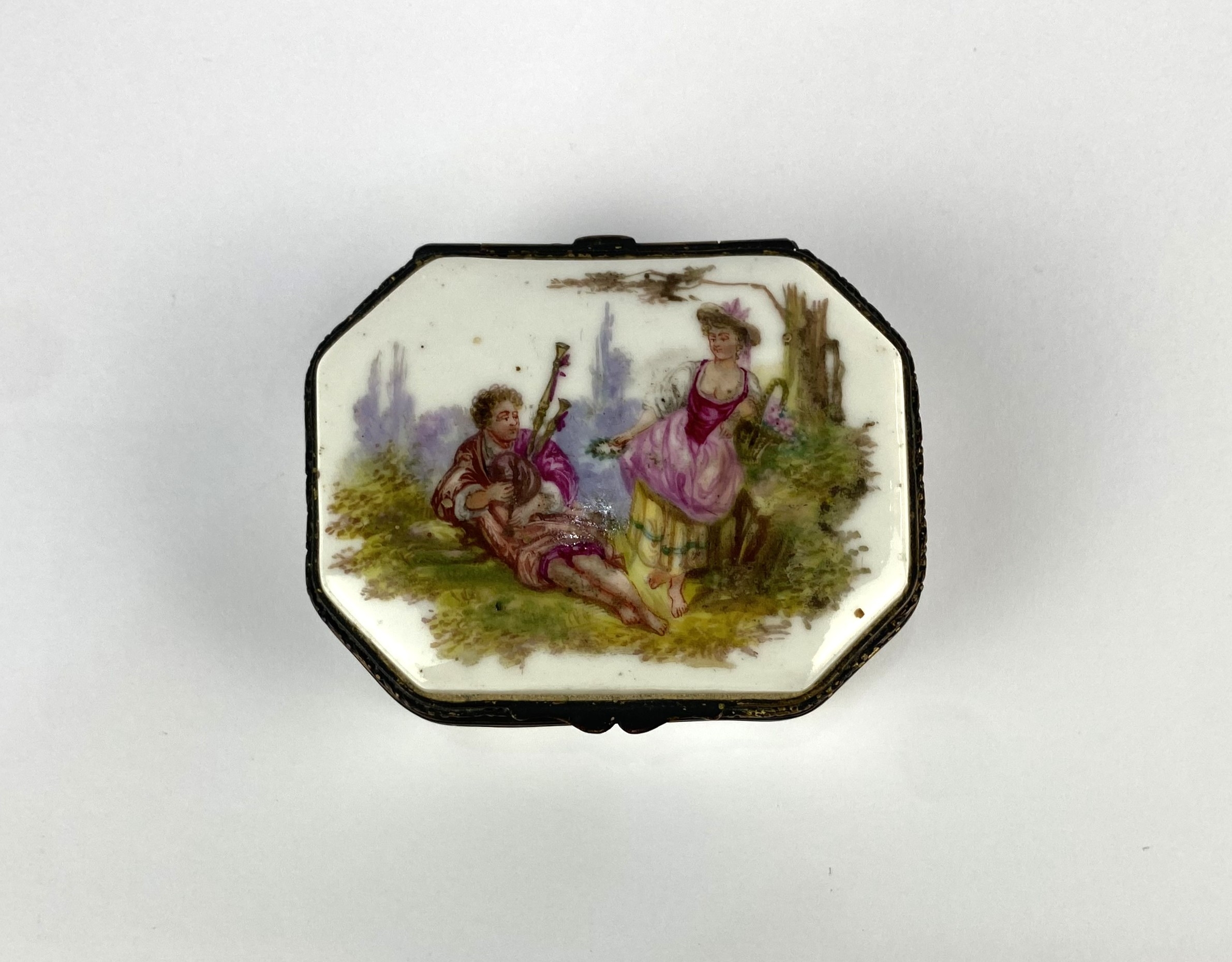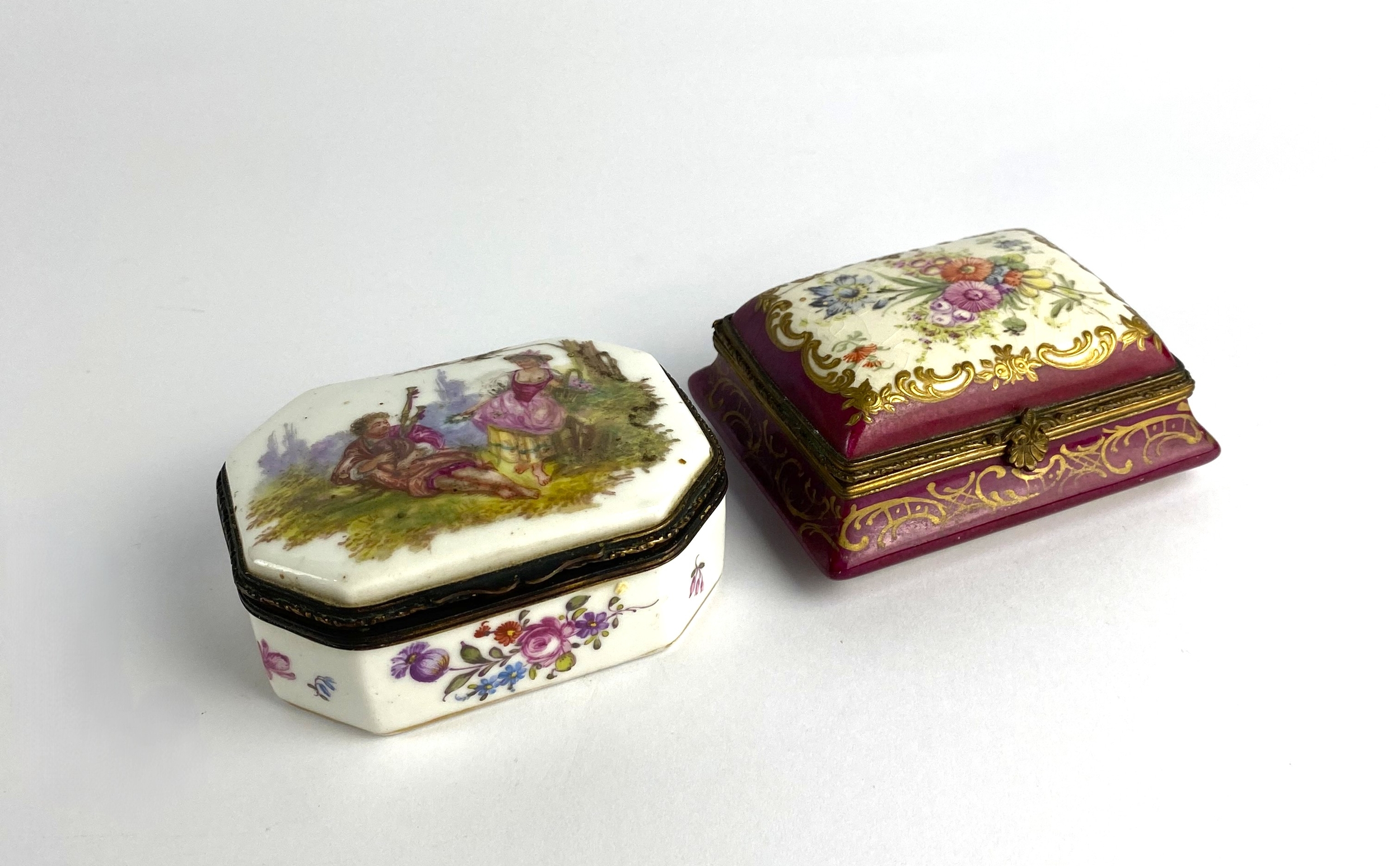 A 19th century continental porcelain trinket box, of canted rectangular form, decorated against the white ground to to lid with figural scene of piper and maiden within a landscape, exterior decorated with floral sprays, bearing Frankenthal type mark to base, width 9cm, together with a contiental porcelain trinket box, gilt decorated against maroon ground, to lid with painted floral panel, underglazed blue scissor mark to base (AF), width 9.5cm (2)