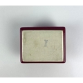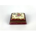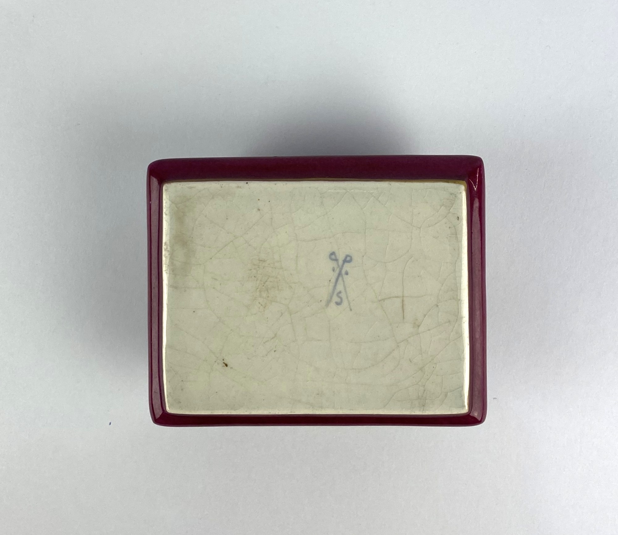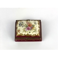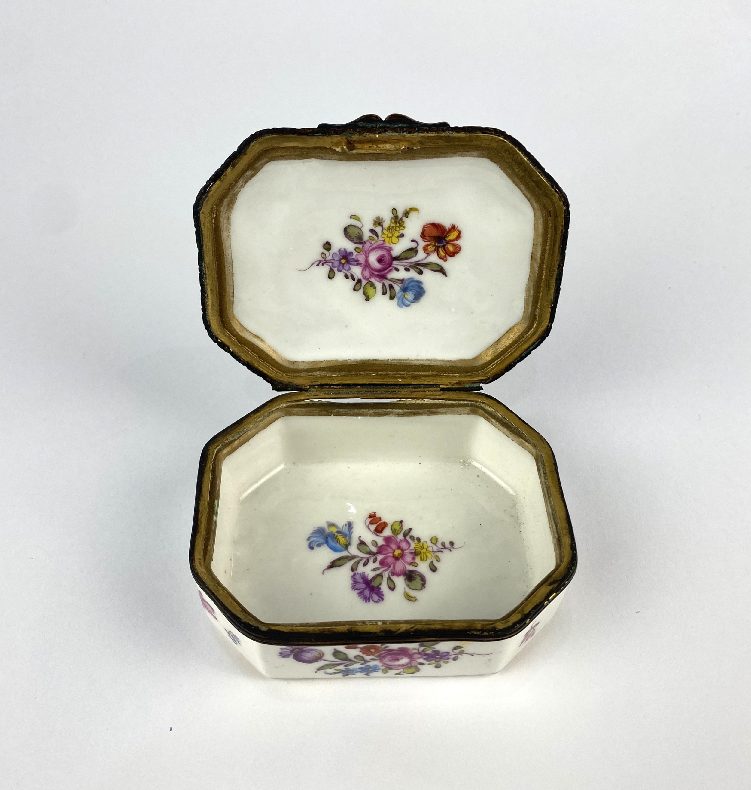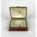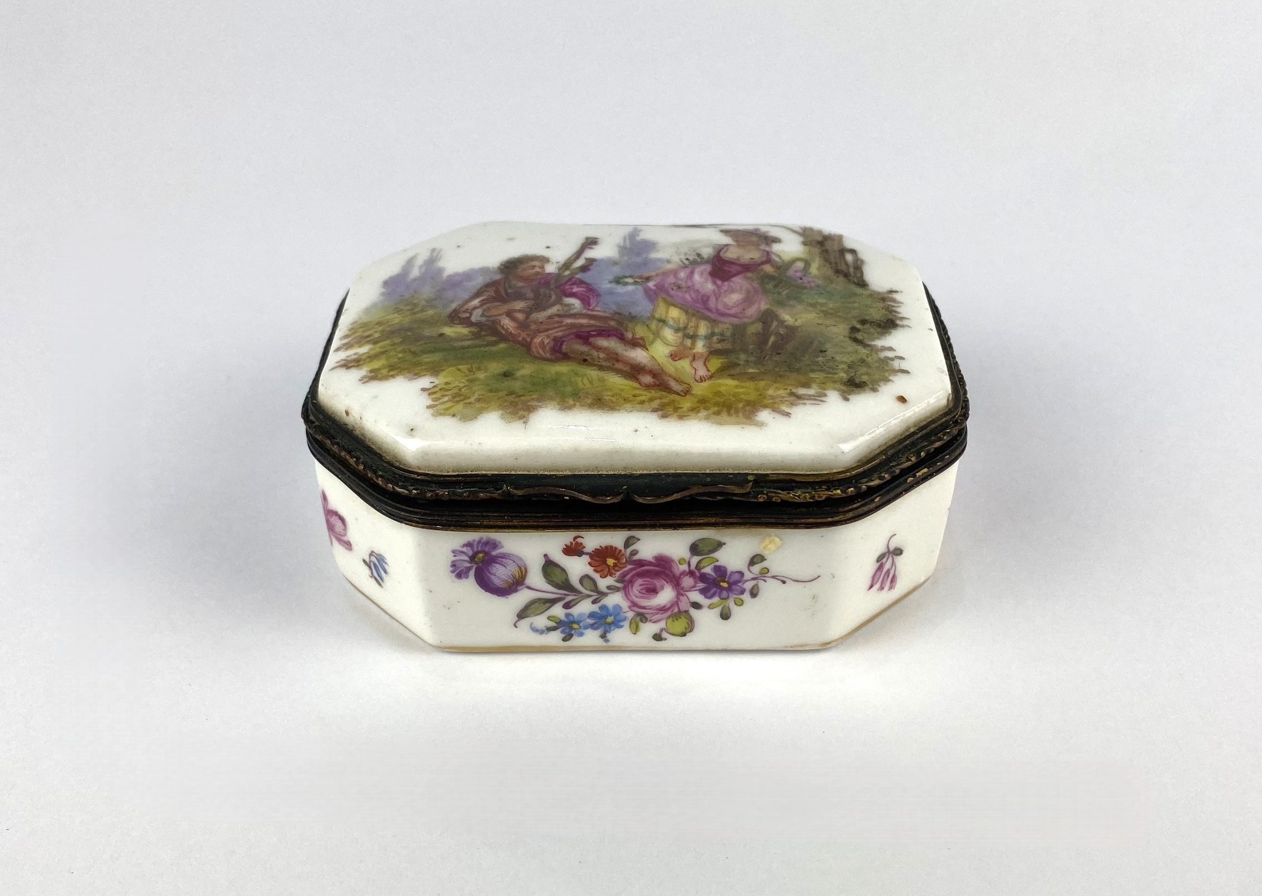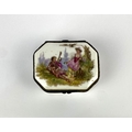 A 19th century continental porcelain trinket box, of canted rectangular form, decorated against the white ground to to lid with figural scene of piper and maiden within a landscape, exterior decorated with floral sprays, bearing Frankenthal type mark to base, width 9cm, together with a contiental porcelain trinket box, gilt decorated against maroon ground, to lid with painted floral panel, underglazed blue scissor mark to base (AF), width 9.5cm (2)