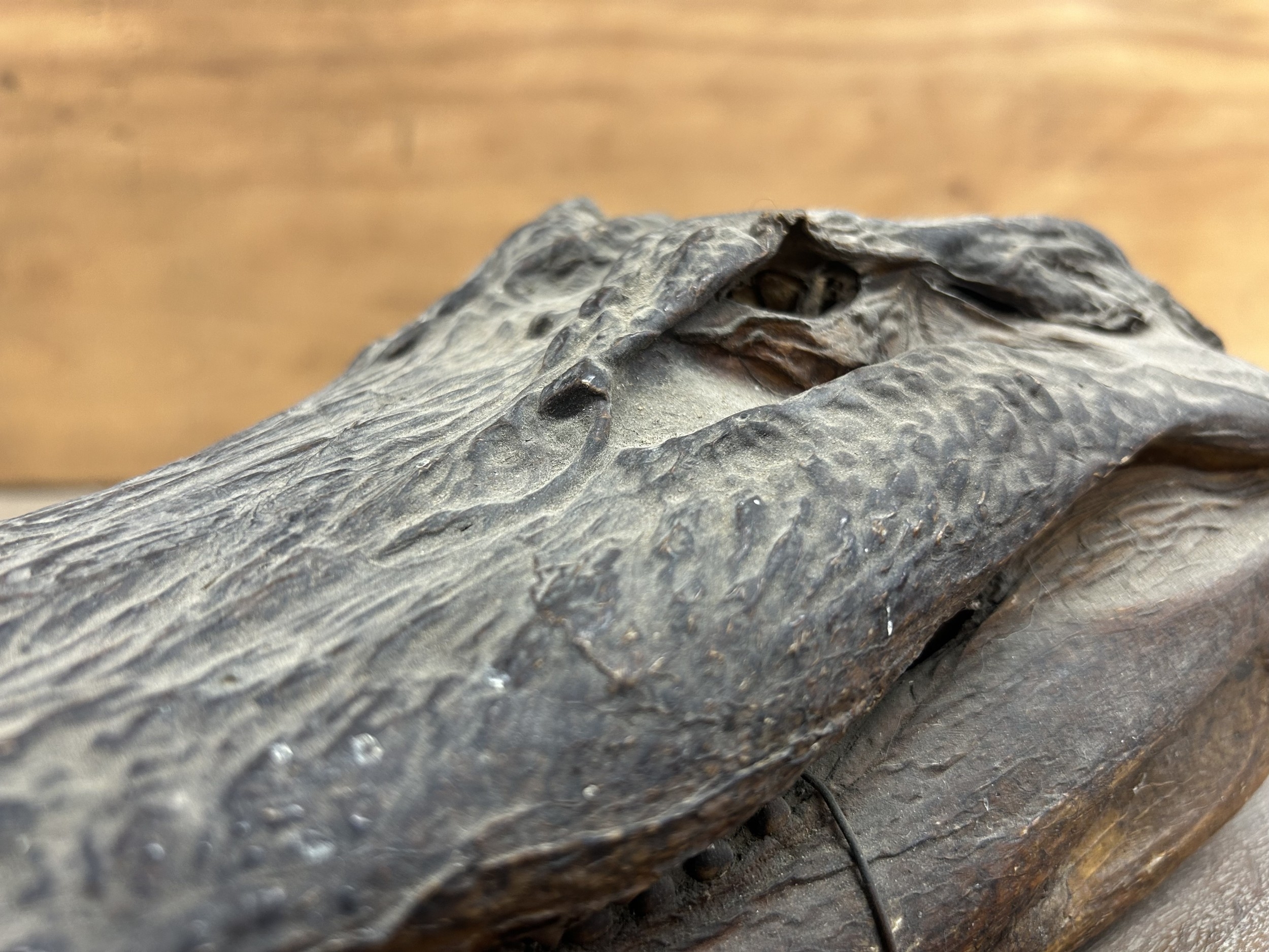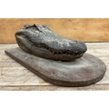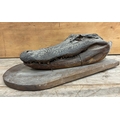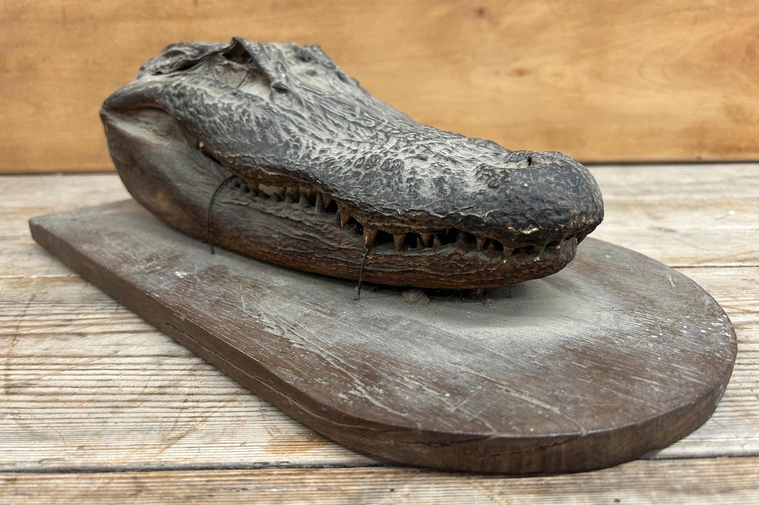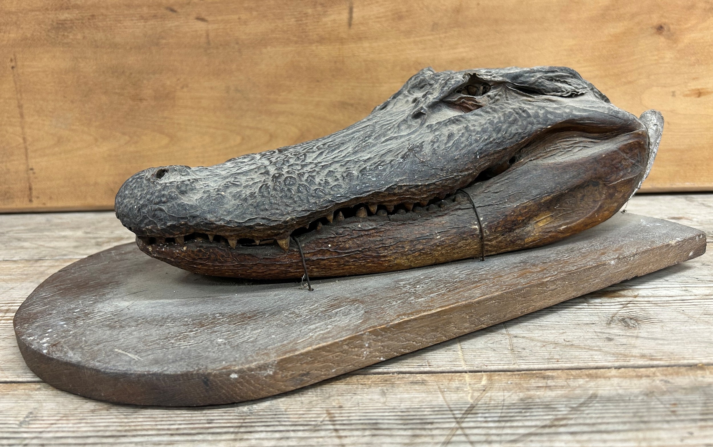Taxidermy - antique Alligator head mounted on wooden board, L 40cm