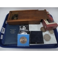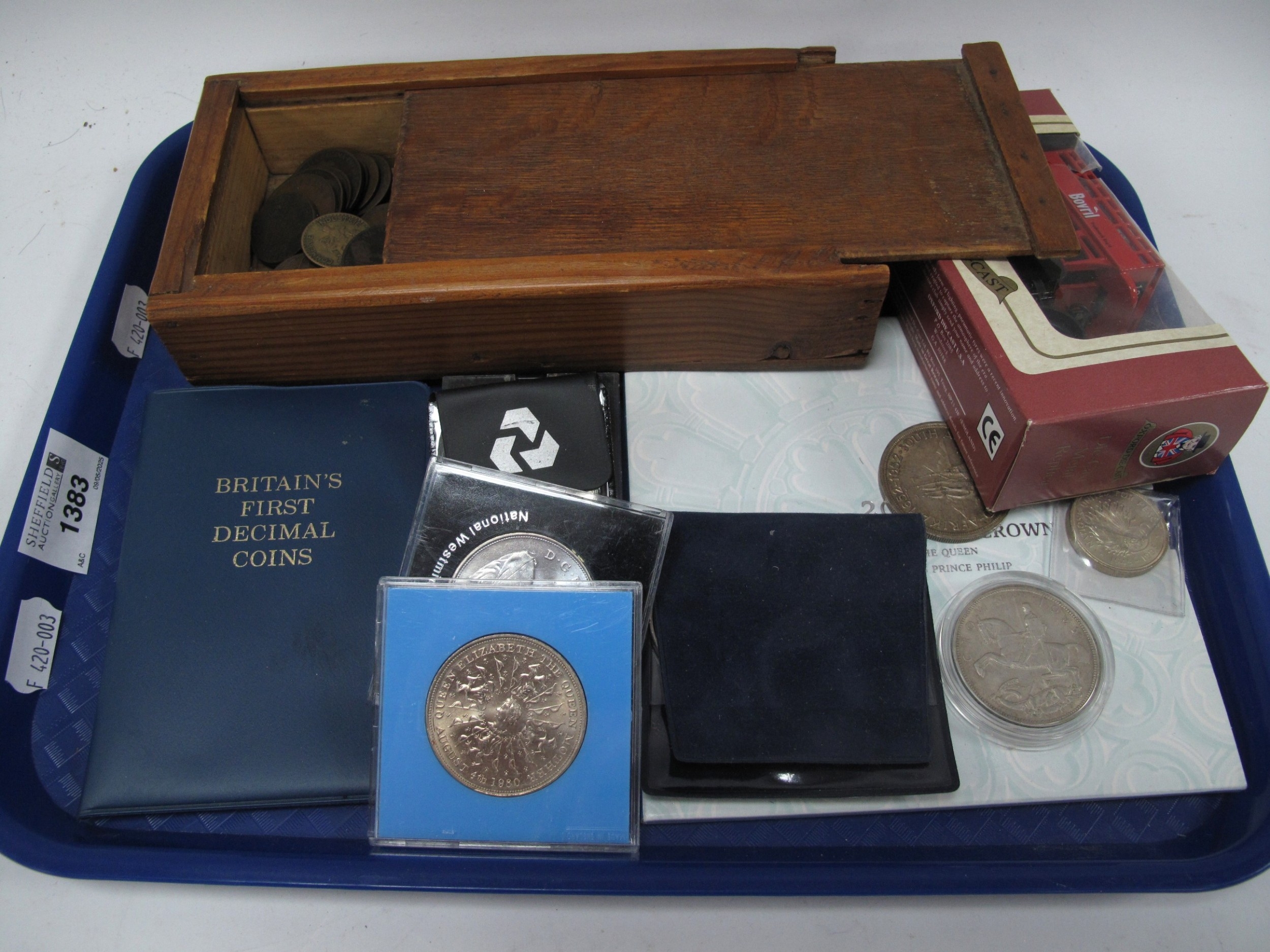 Assorted Coins - 1935 Silver Crown, 2 x £5, 1 x £2 commemorative coins, other commemorative coins, copper pre-1947. South Africa silver 5 shillings DIe-cast bus:- One Tray.