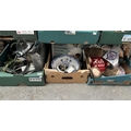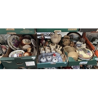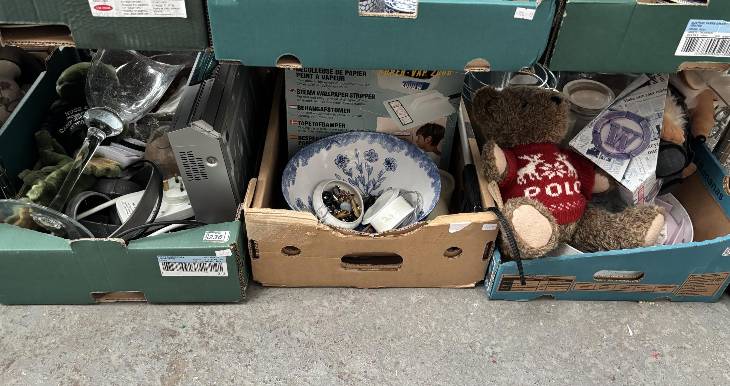3 Boxes containing an oversized display glass, Panasonic DVD recorder, and a Ralph Lauren bear