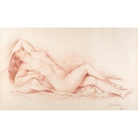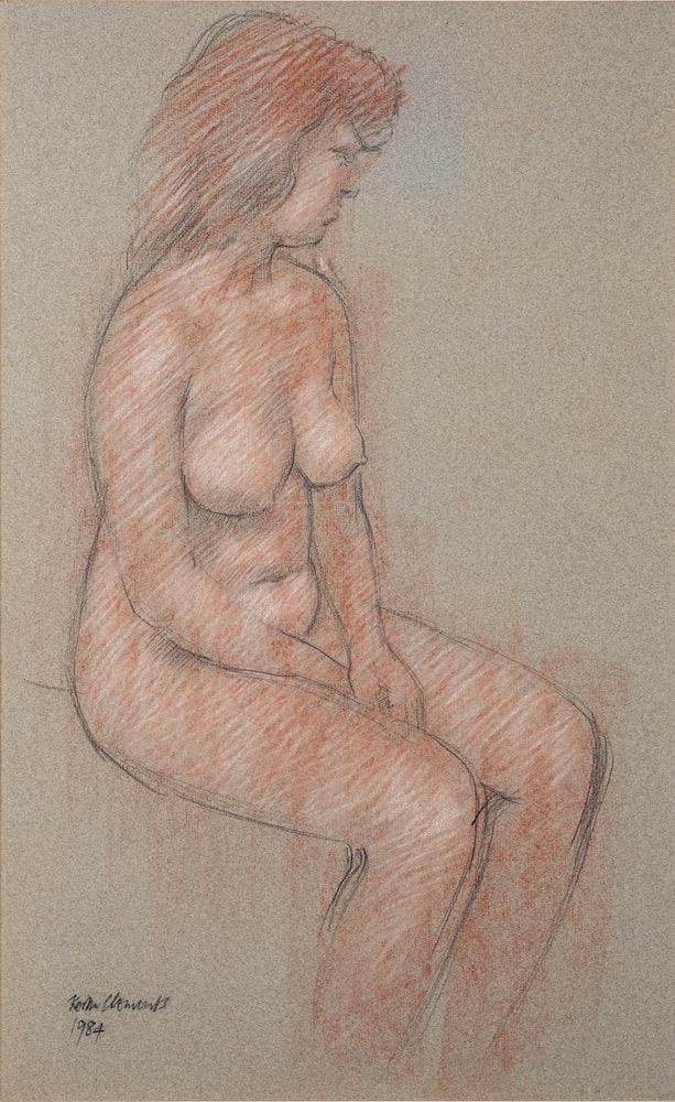 Keith Clements (British, b. 1931) seated nude signed and dated lower left, and bearing inscribed artist's label with dedication verso pastel 48 x 30cm
