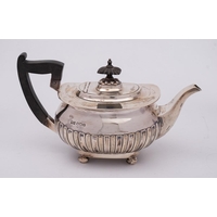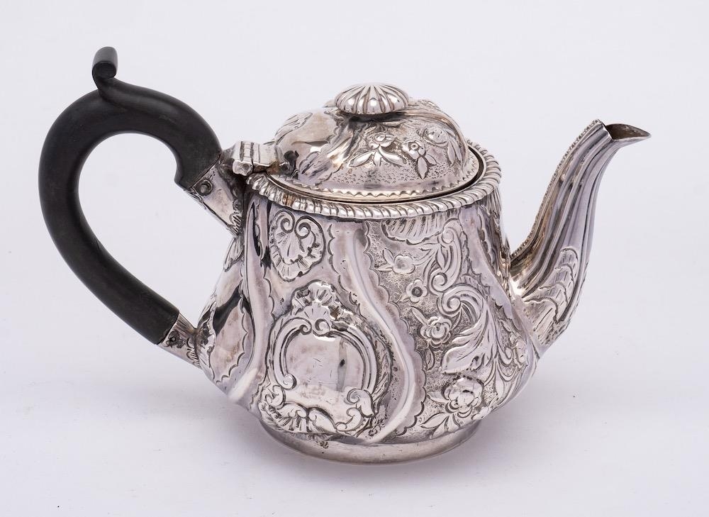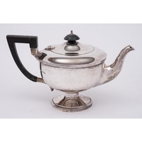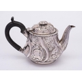A George IV silver teapot, maker John Wakefield, London, 1823: of squat circular form with embossed foliate decoration, 19cm long, 320gms, 10.30ozs