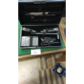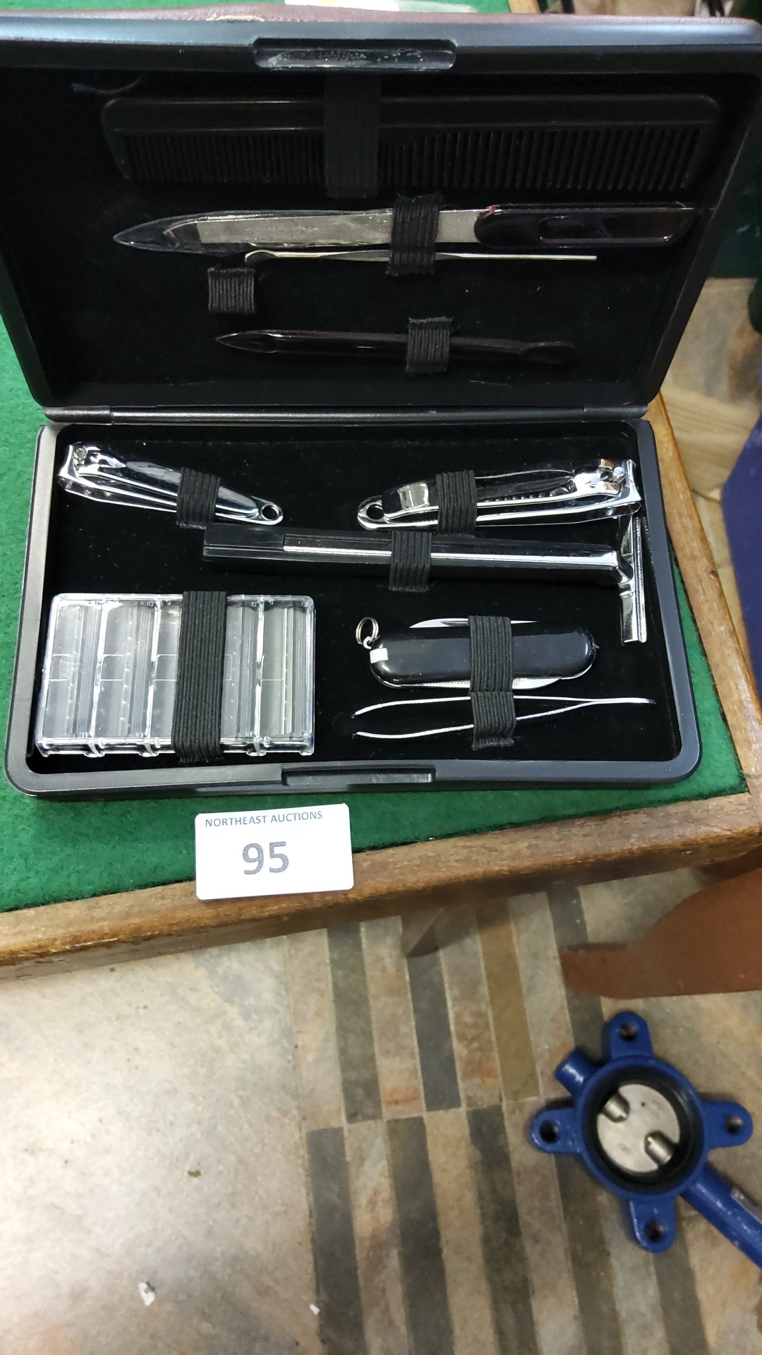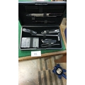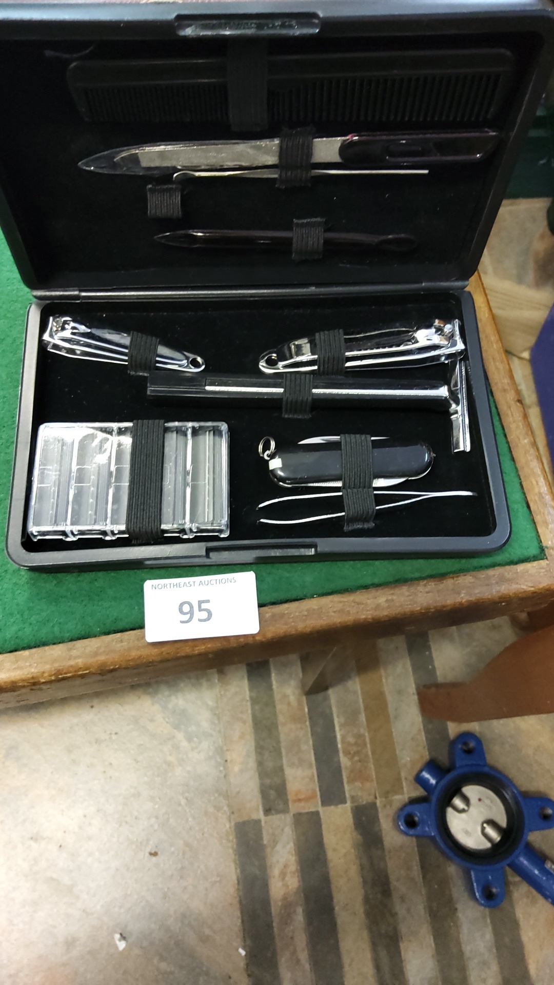 Black cased gentleman’s grooming kit comprising safety razor with spare blades, pocketknife, two nail clippers, nail file, tweezers, ear pick and comb, late 20th century.