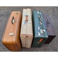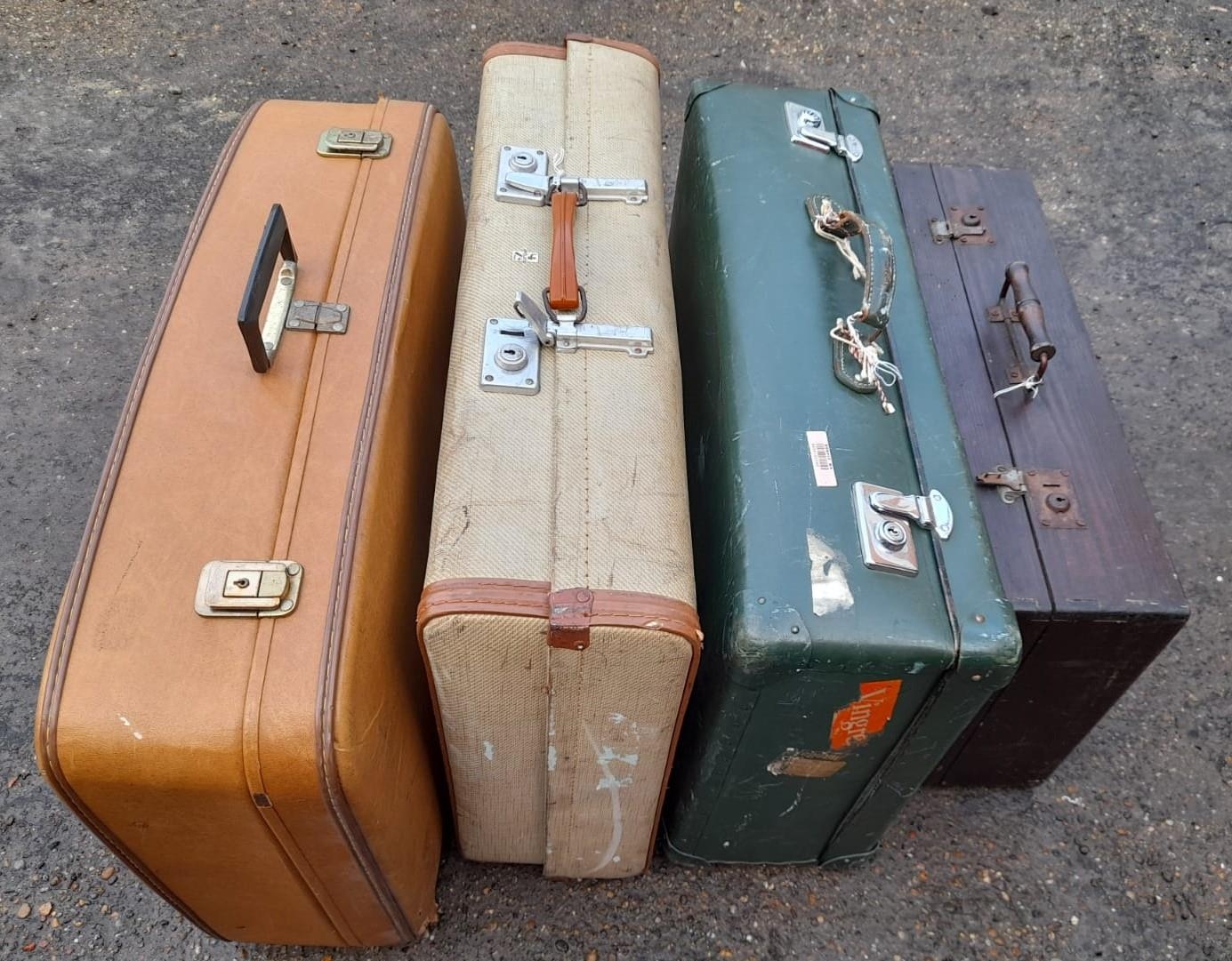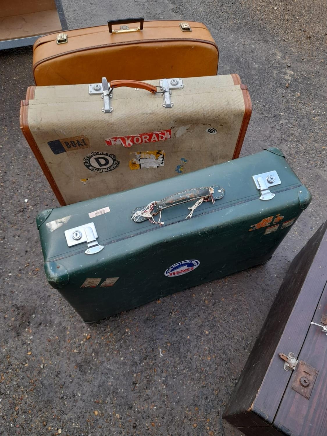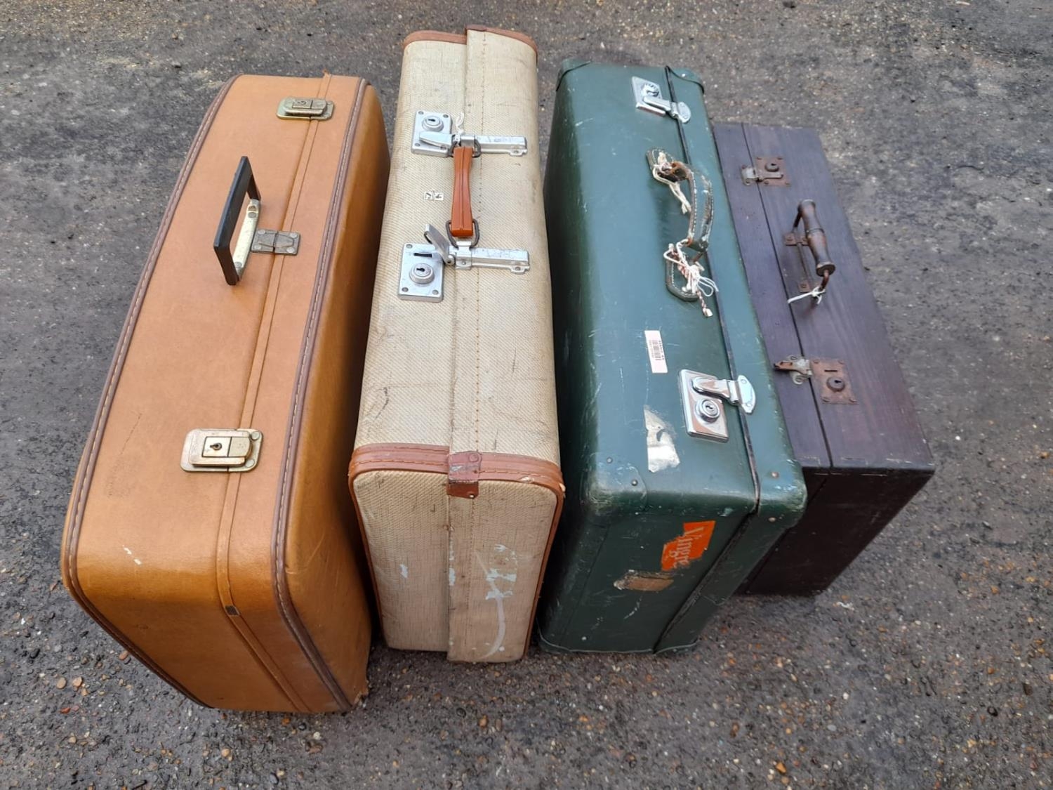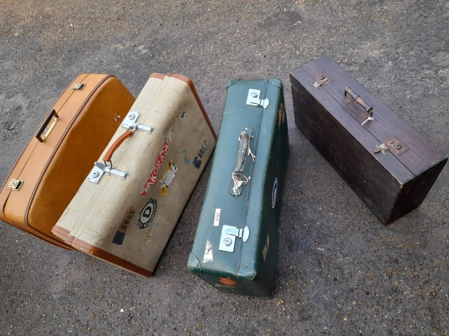 Four Old Travel Cases, One Wood, Some with travel stickers